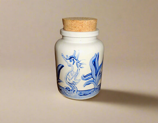 Vintage Blue and White Seaside Art Pottery Pot With Cork Stopper