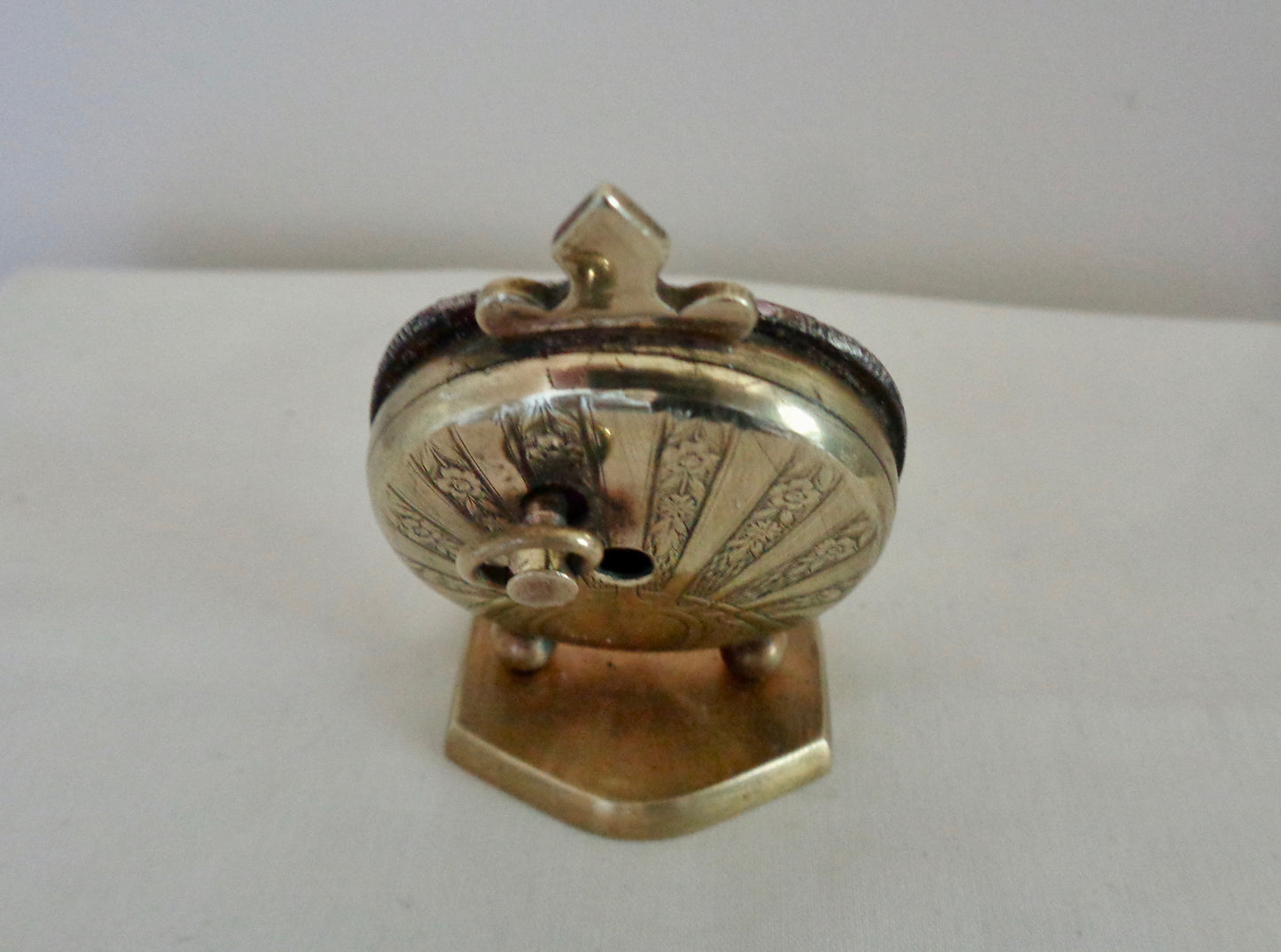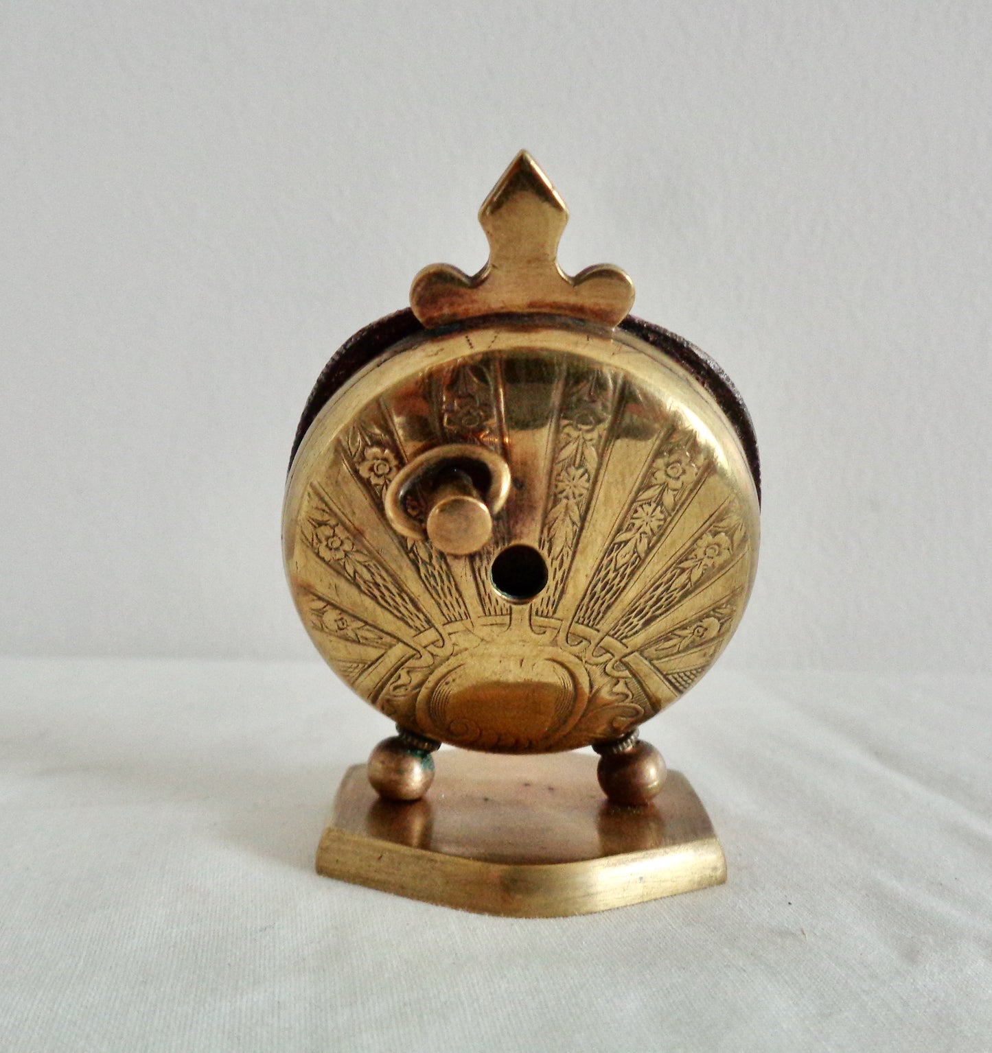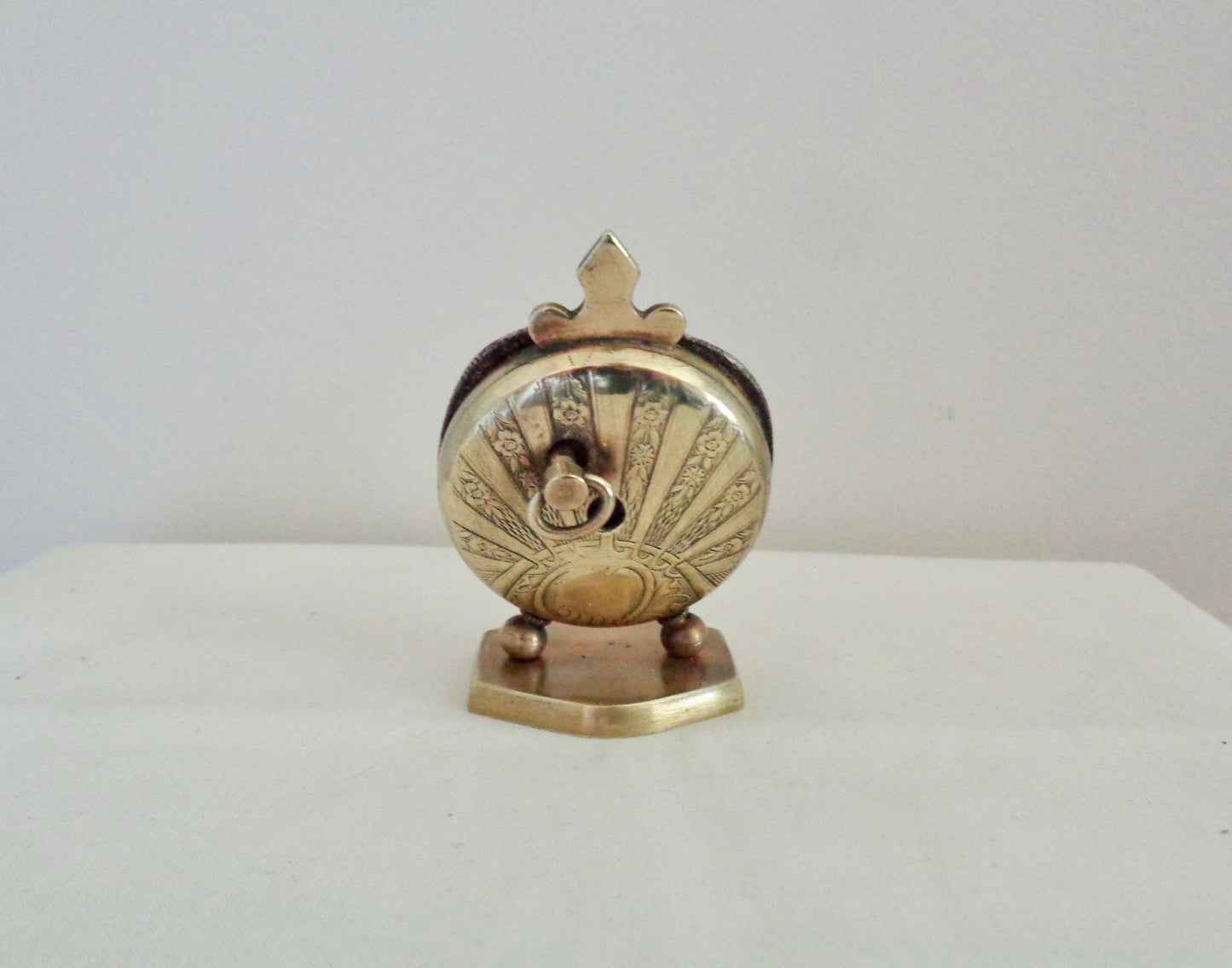 This gorgeous, non-working, brass miniature is a 1920s Swiss travel clock with visible "heartbeat" escapement and fleur de lys accent. The pendulum movement was patented (brevet 93017) in the 1920s by the Swiss Clock Maker, Theodore Jequier.