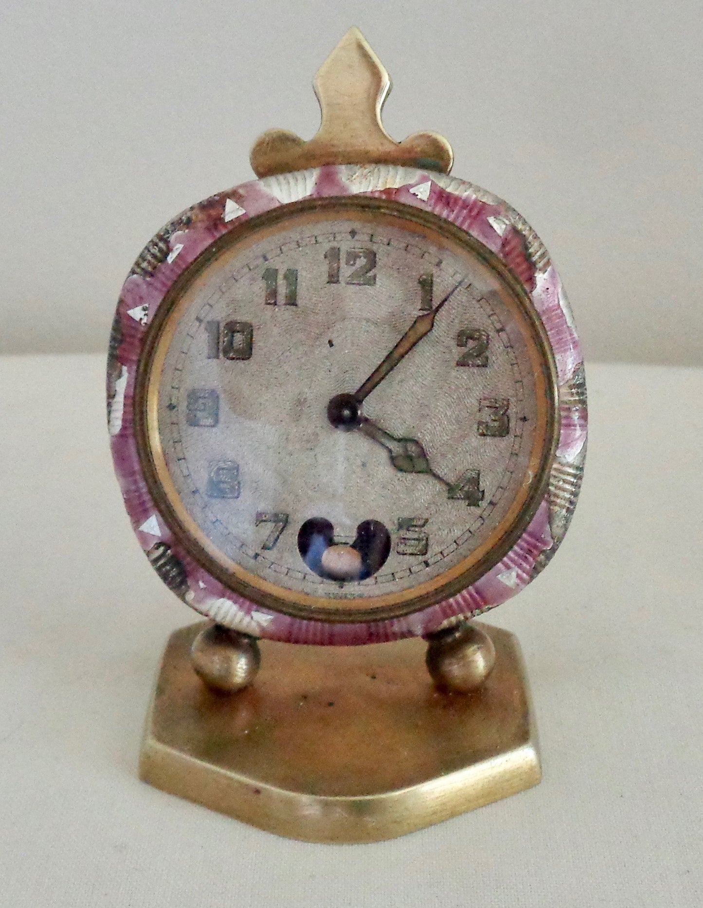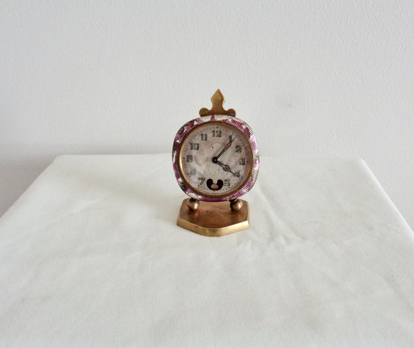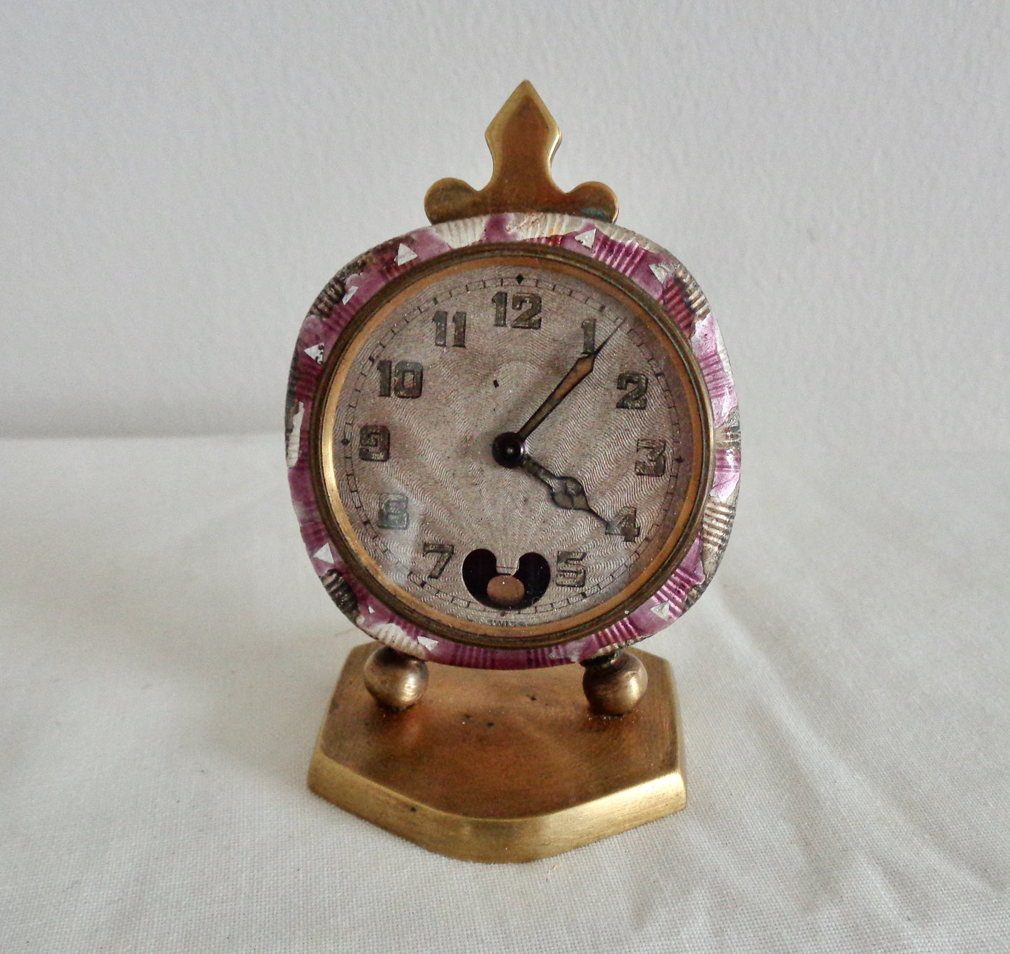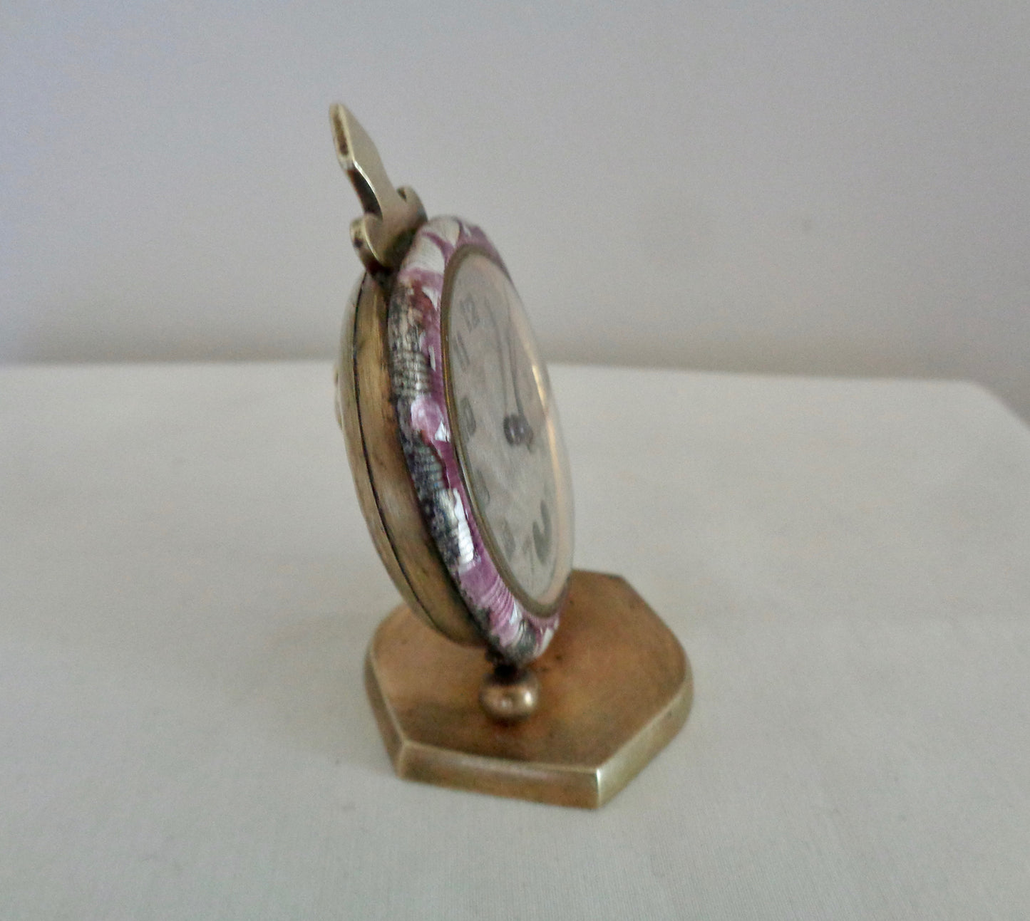 The clock is in fair cosmetic condition, considering it's almost 100 years old, but isn't working. The movement, clock face and outer guilloche enamel edges are all in need of some remedial work. There is also a button missing from the rear of the clock that sets the time. The clock winds but doesn't tick and it doesn't have the travel case.