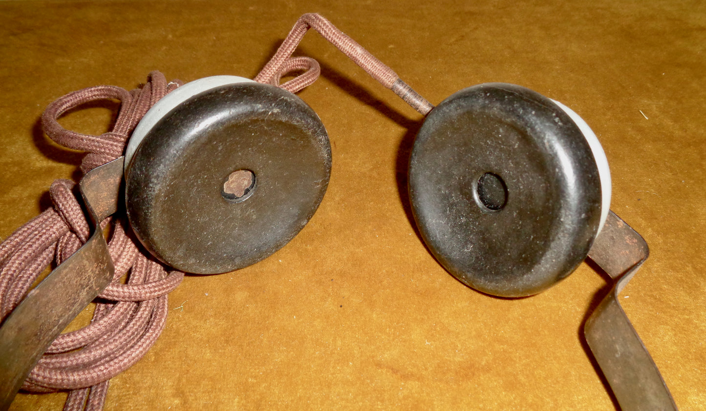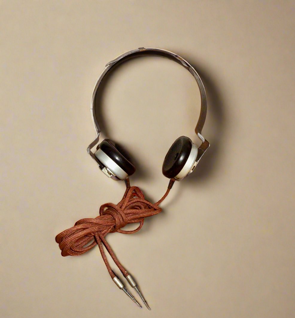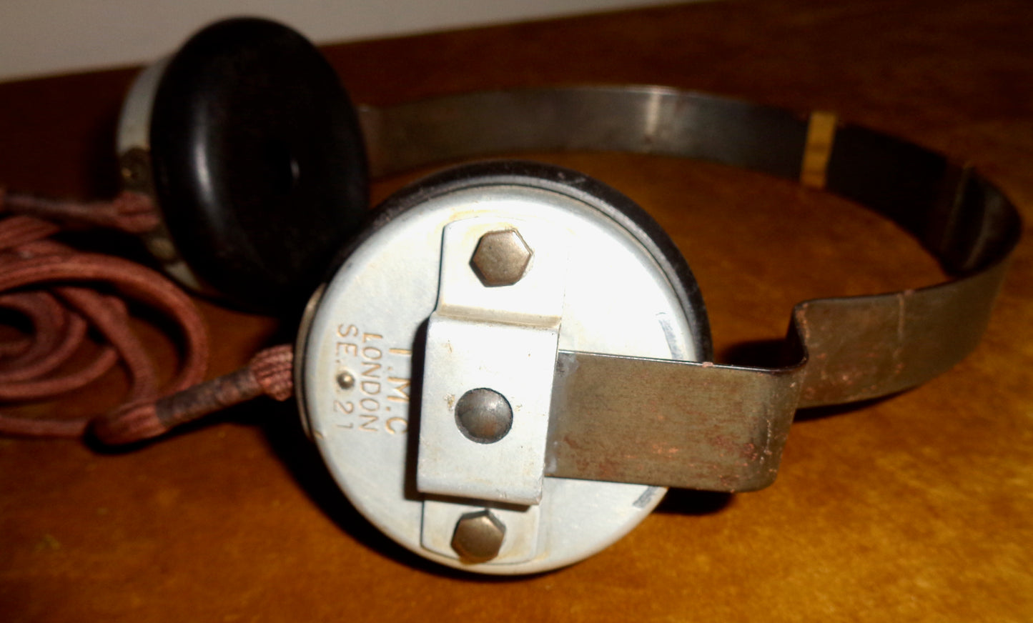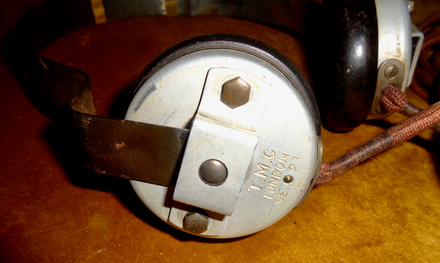 The headphones are in fairly good cosmetic condition with surface scuffs and blemishes commensurate with age and use. Comprising black bakelite moulded ear pieces, with a single wide steel headband, and twisted flexible brown lead terminating in original 2mm pins. Output measured at 2000Ω.