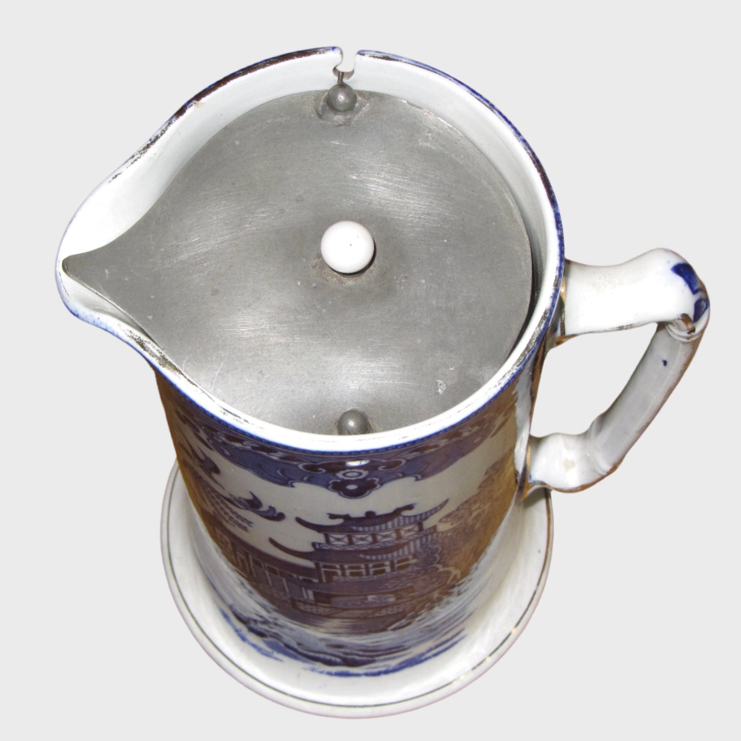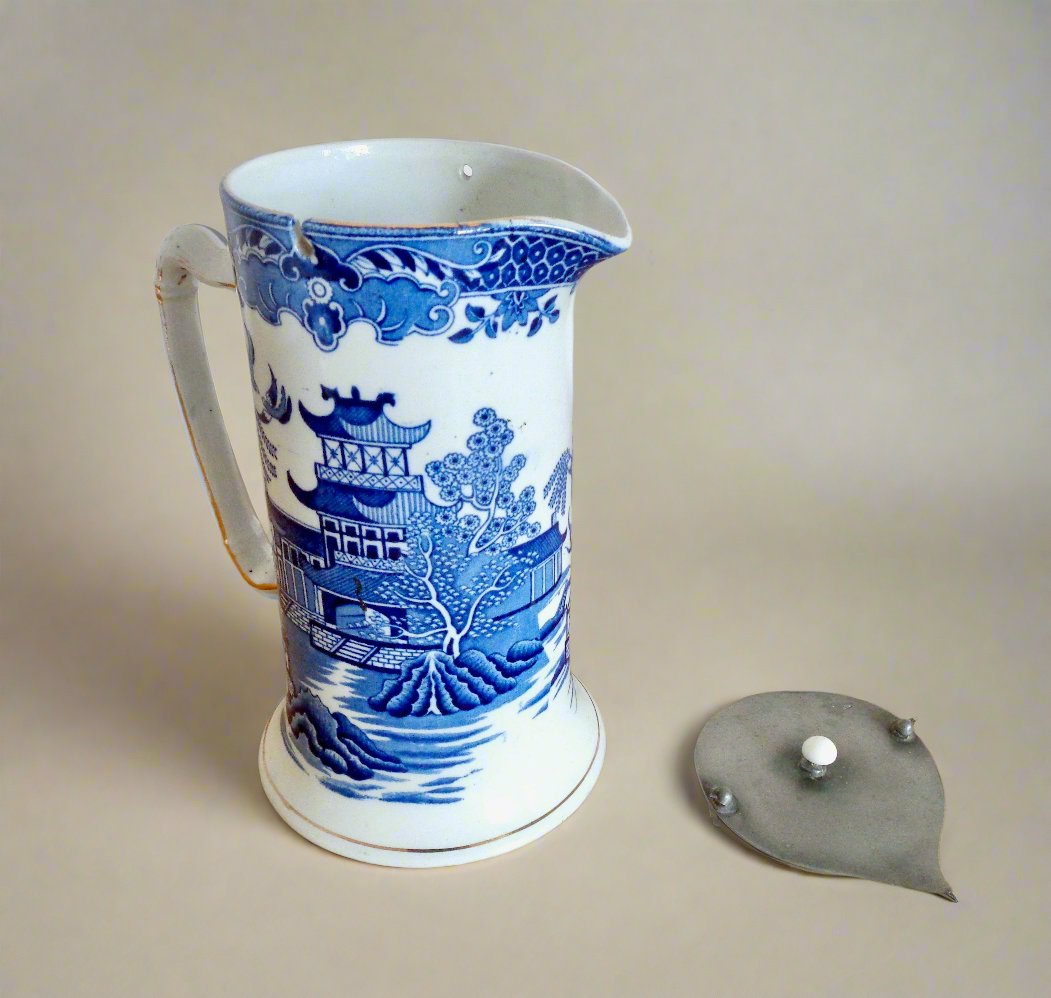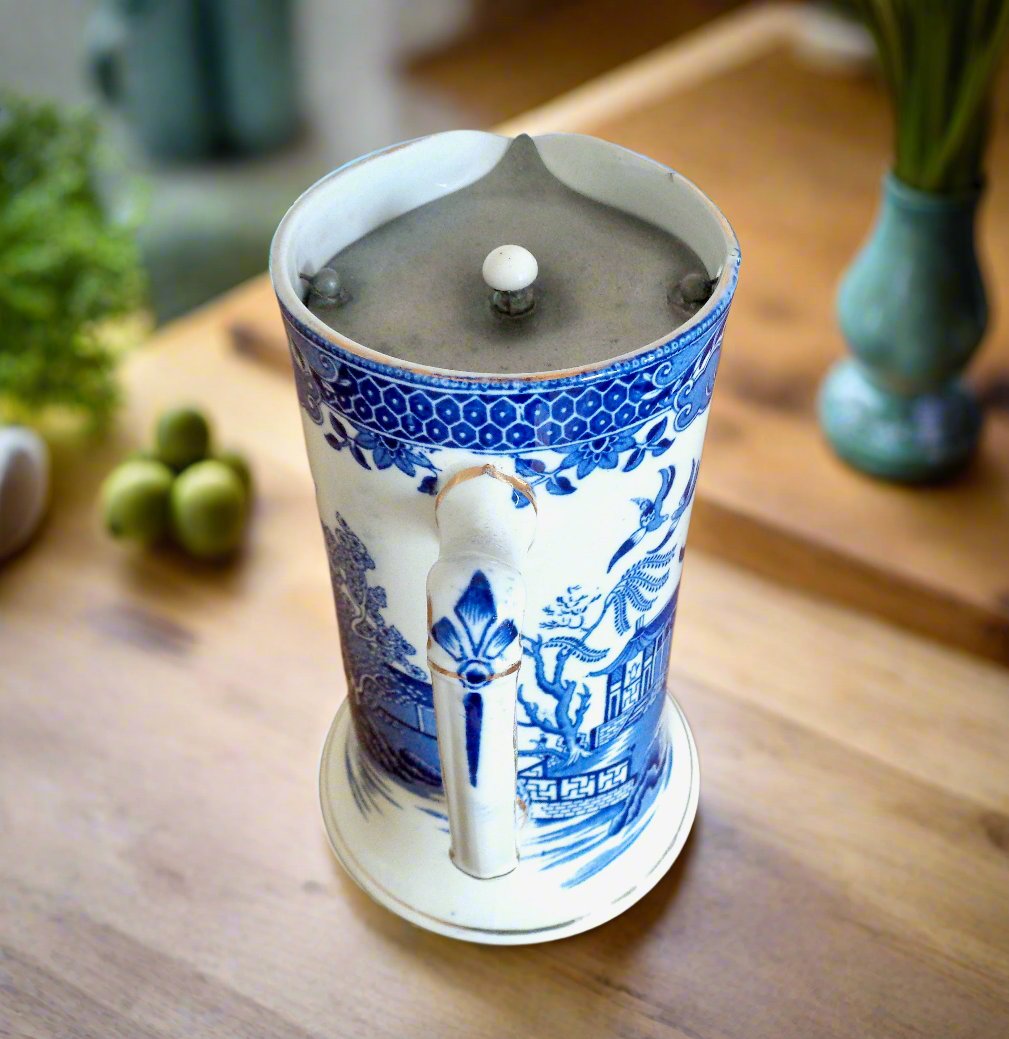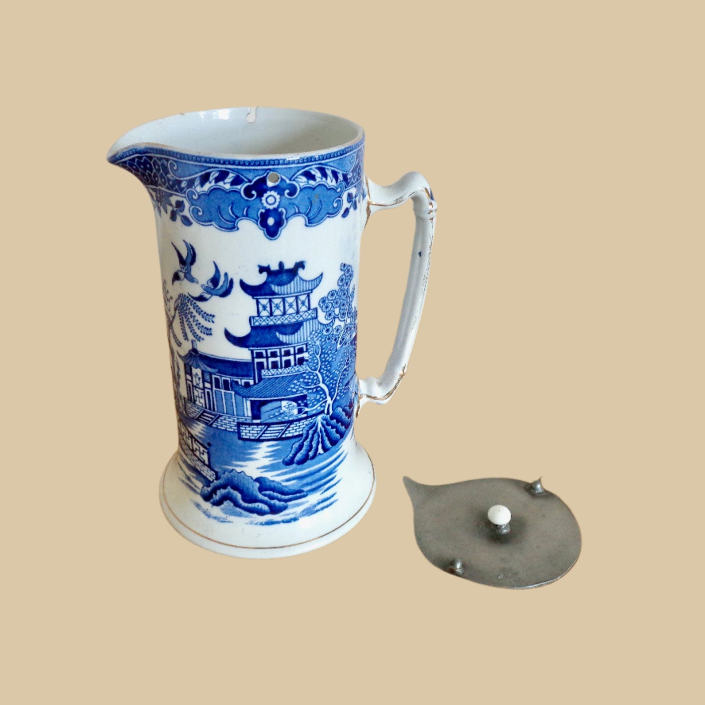 This is a very unusual, Burgess And Leigh, 1930s Burleigh Ware Willow Hot Water Jug / Pitcher With A Pewter Lid, made in Burslem, Staffordshire, UK.
