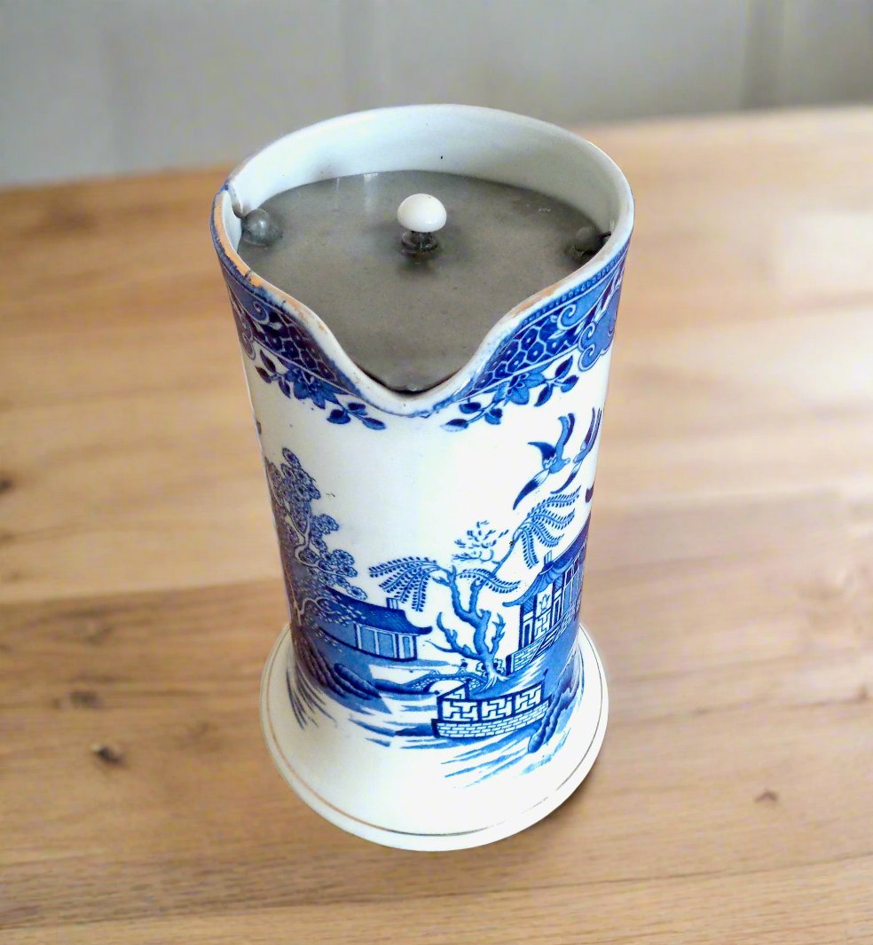 A traditional ‘Willow’ Design with a ceramic blue and white body, and a pewter lid with white bakelite finial. A Victorian revival piece but dating to the 1930s!