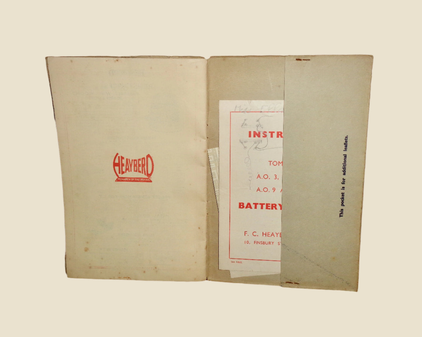 The pocket at the rear of the catalogue contains a formal business letter, dated 1938, from Heaybeard to the original owner concerning a battery charger, and an instruction leaflet for several 'Tom Thumb' models of battery chargers. The instruction leaflet has been annotated in pencil with a circuit diagram and the name Miss Ella Sumner-Ward (very intriguing...)!