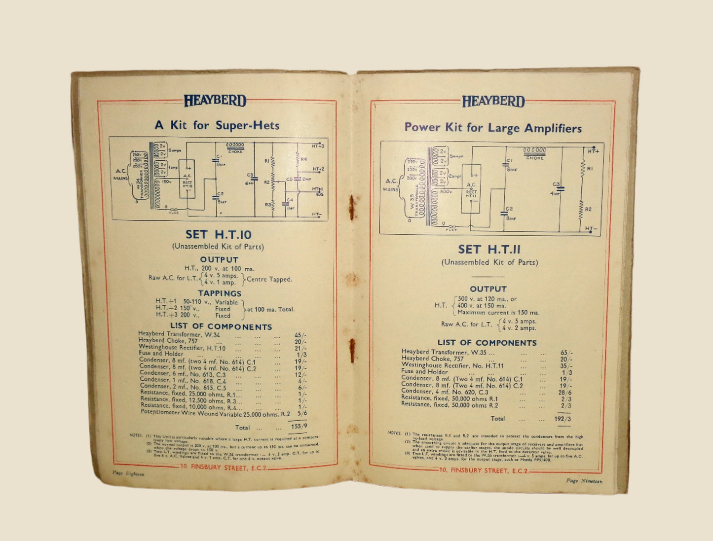 A 35-page pamphlet advertising Mains units, transformers, chokes and other componentry made by FC Heayberd & Co.