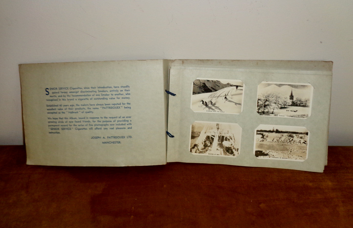 This is a lovely 1937 Winter Scenes Senior Service Cigarette Card Album by cigarette manufacturers, Joseph A Pattreiouex Ltd., of Derby Street, Cheetham Hill, Manchester, which was acquired by 'Gallahers', another tobacco manufacturer, in 1936/37.
