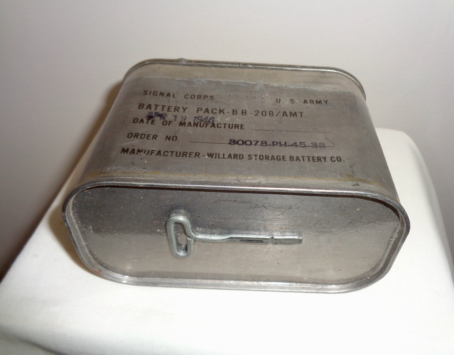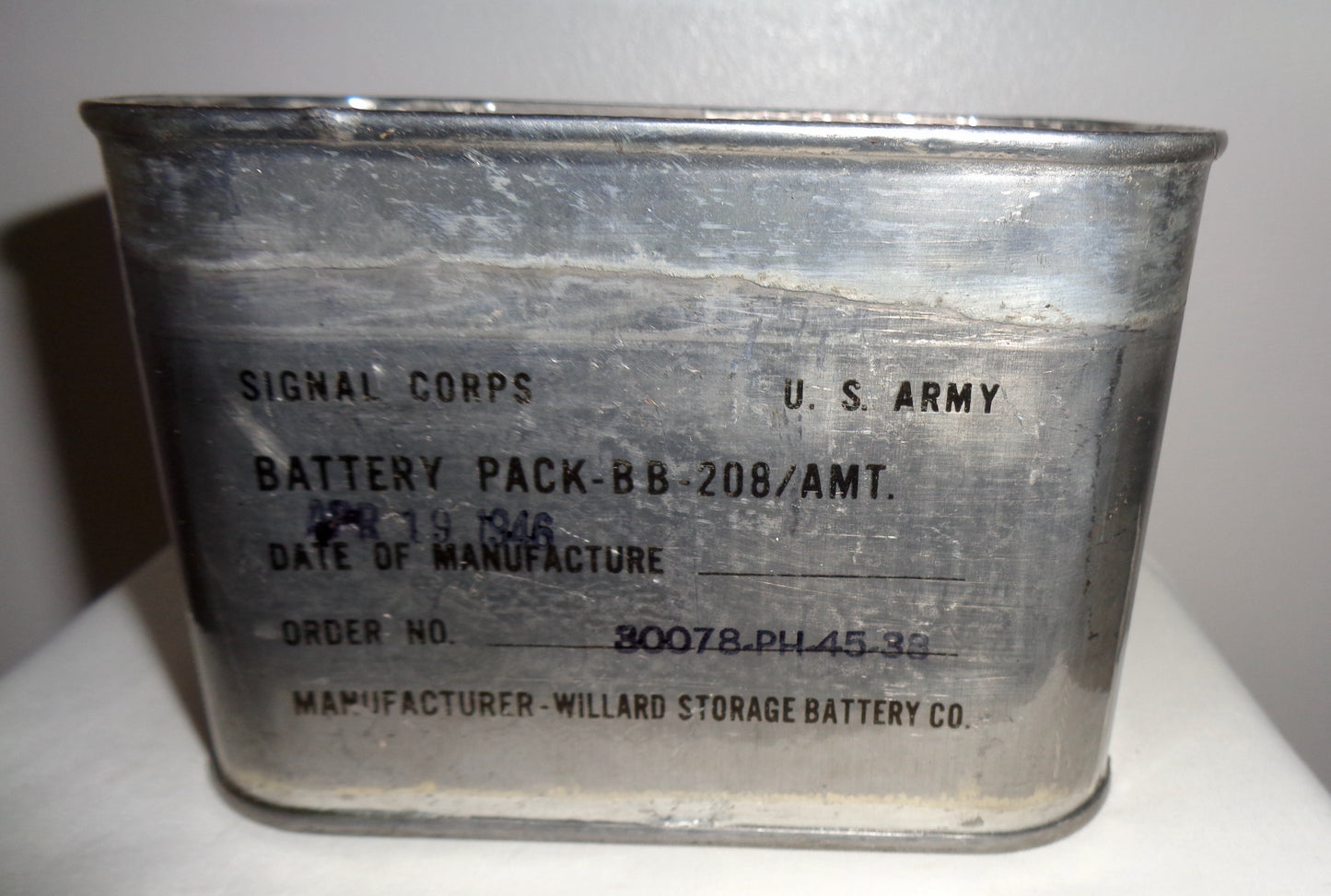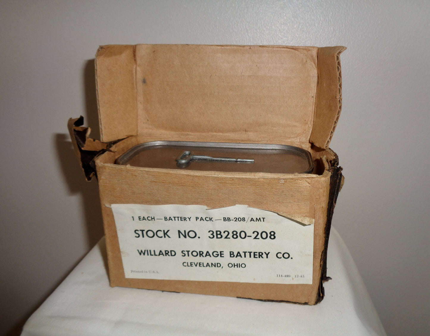 This is a 1946 BB 208 AMT Willard Radiosonde Storage Battery Pack In A Spam Tin. In unused condition with its original outer cardboard box, which has been opened. This battery pack was intended for the US Army Signal Corps.
