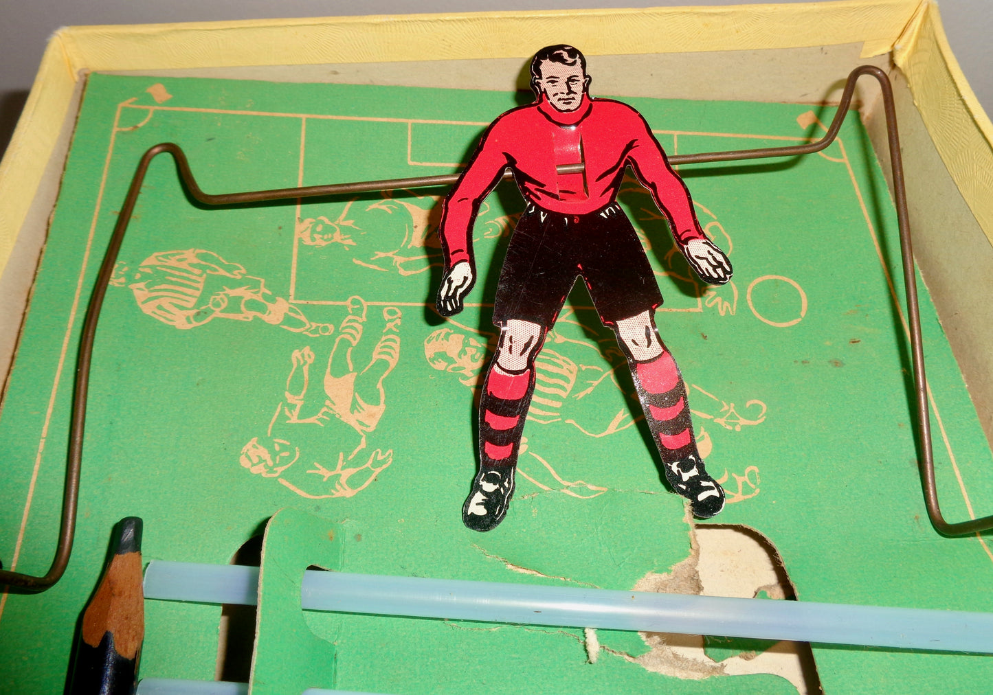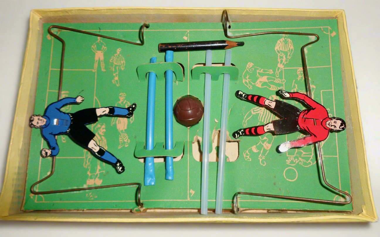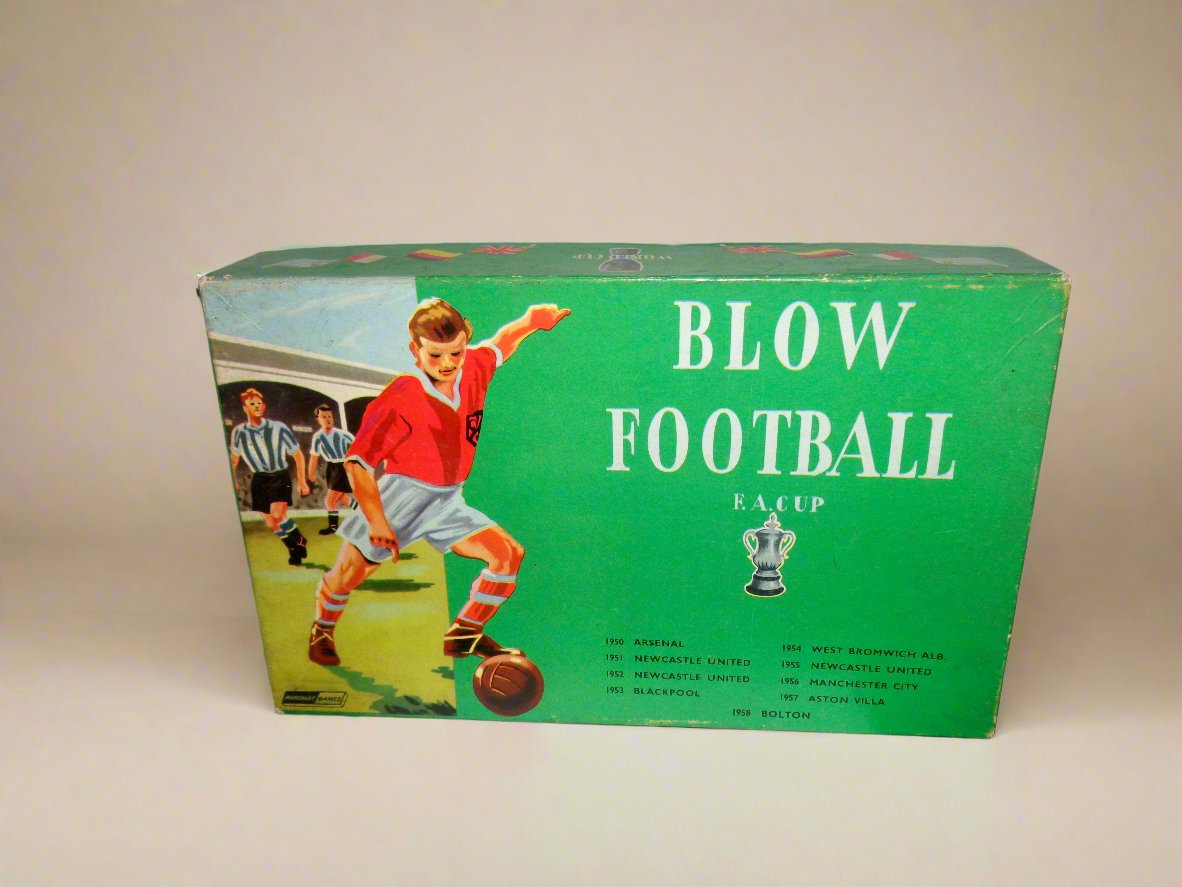 This FA Cup version of a Vintage 1950s Boxed Marchant Games Blow Football Game comes with one blue tinplate Goalkeeper and one red, a plastic football, 4 blowing straws and two freestanding metal goal posts. It was intended as a two-player game although 4 could play: 2 as the goalies and 2 as players.