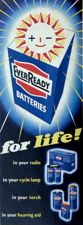 This fantastic small sign is a 1950s Ever Ready Batteries For Longer Life Advertising Metal Lithographed Tin Sign. It is based on the advert used by Ever Ready of the same period:-
