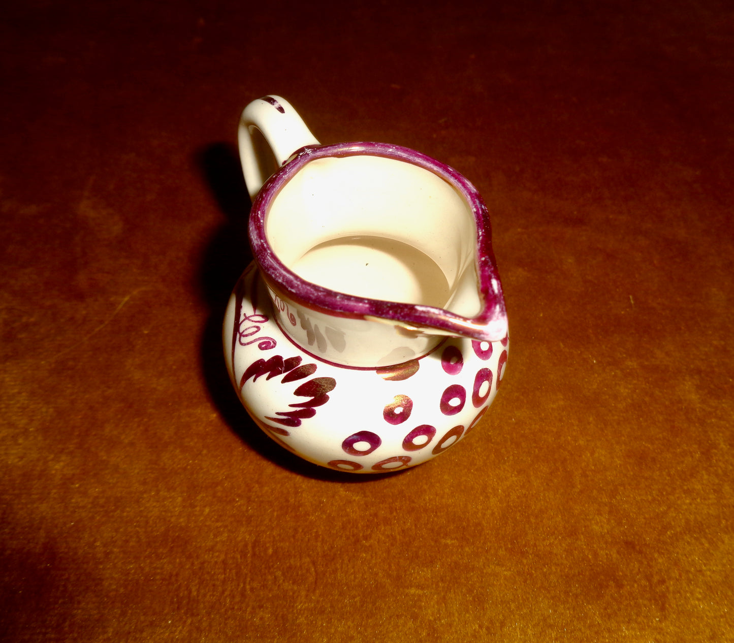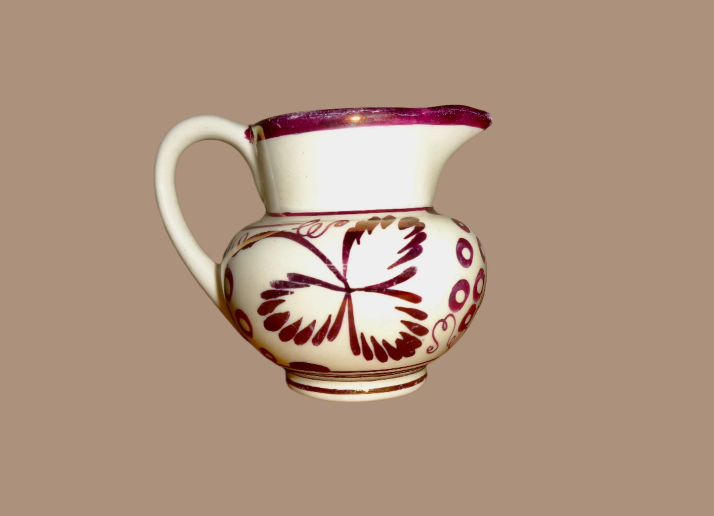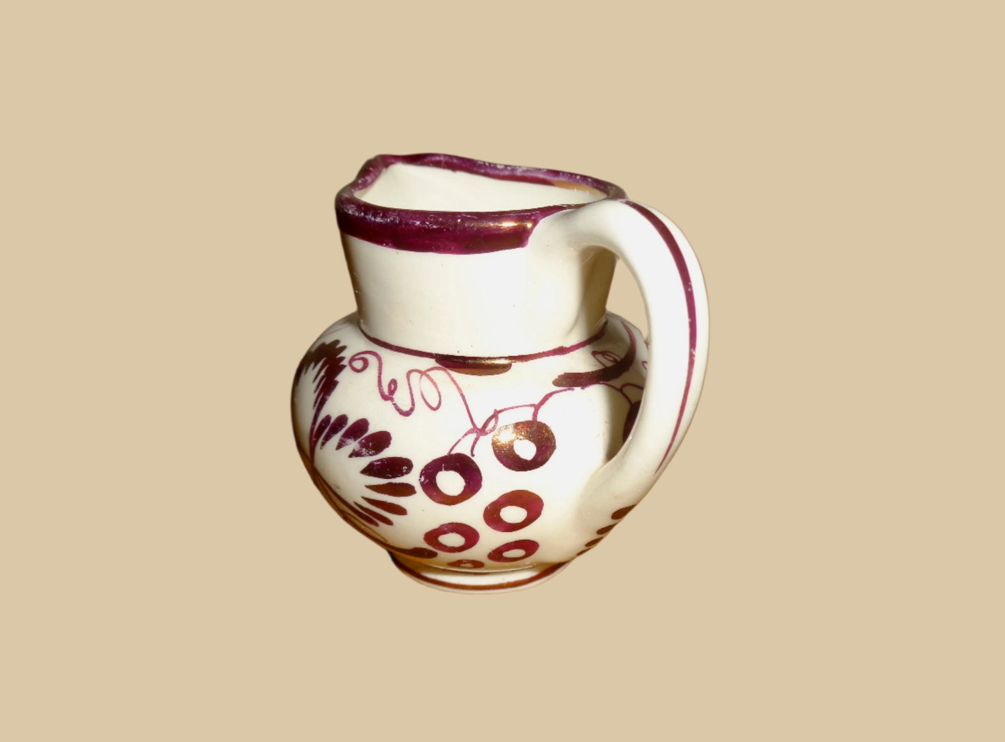 It is in pretty good used condition with no cracks, chips or restoration. However, it is not flawless. There are manufacturing defects that have been present since the jug was first made, and a few flecks of lustre are missing particularly around the rim.