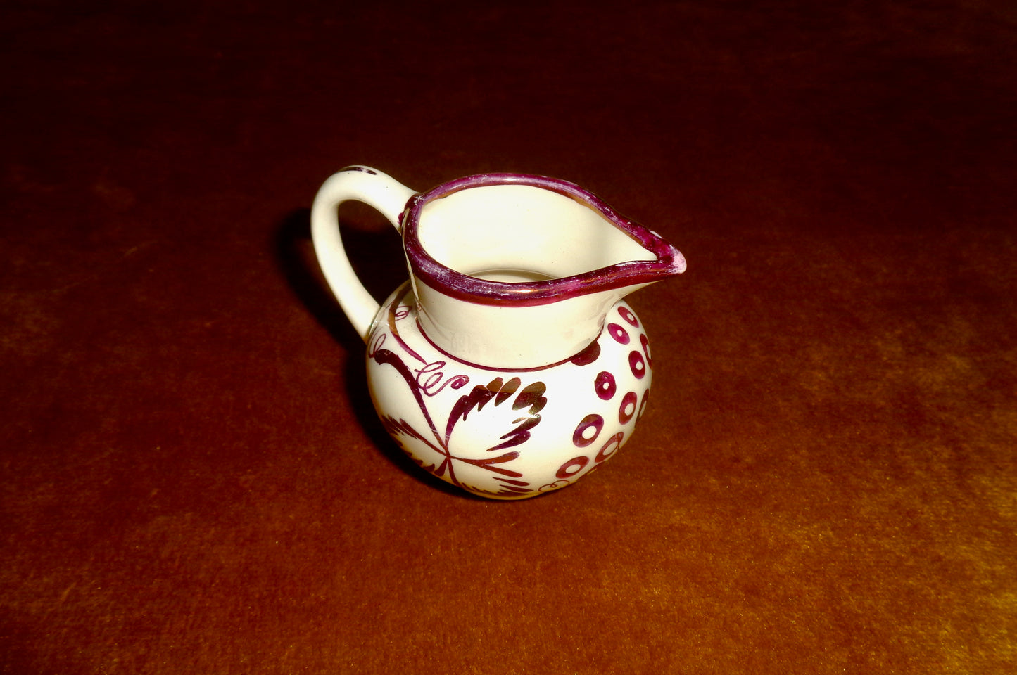Although I have called it copper lustre, it may actually be 'purple' lustre: I could be convinced either way! It is unusual in that the pattern is lustred as opposed to the whole jug being lustred exposing a pattern. The white jug was made by Lancaster & Sandland, Hanley, and decorated by Gray's; these jugs were often destined for the North American market.