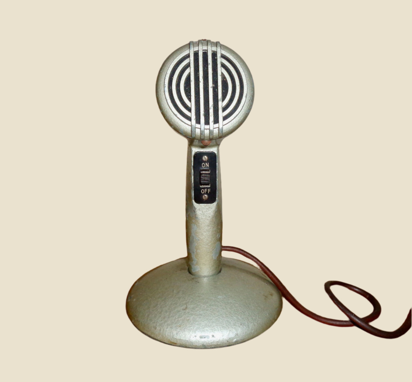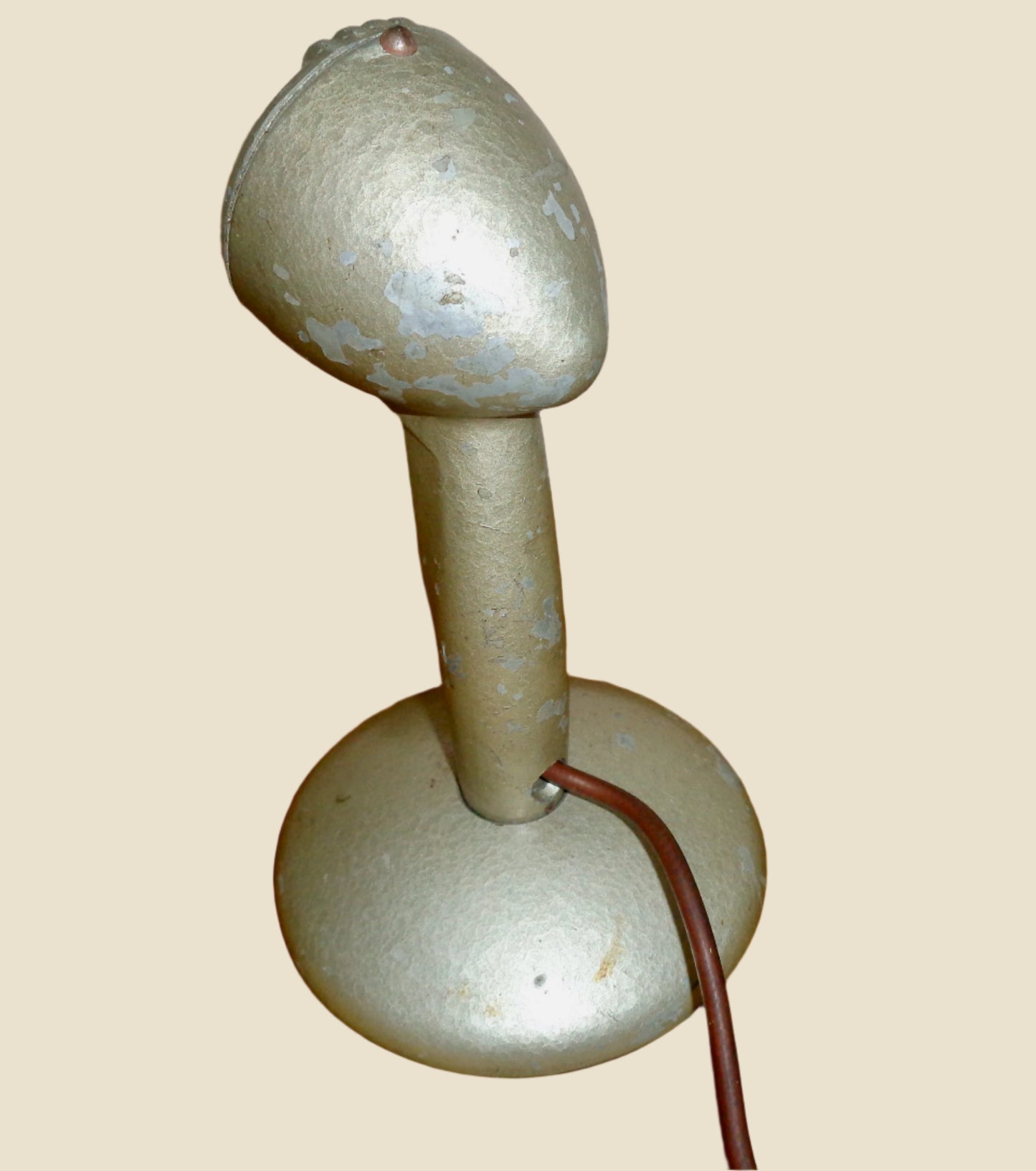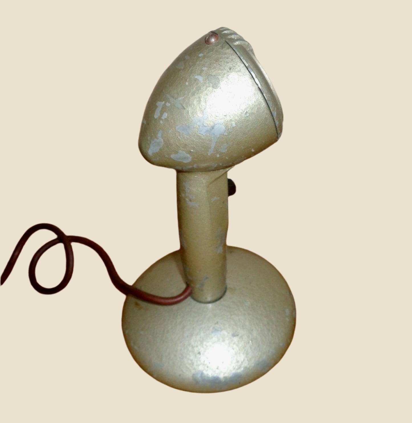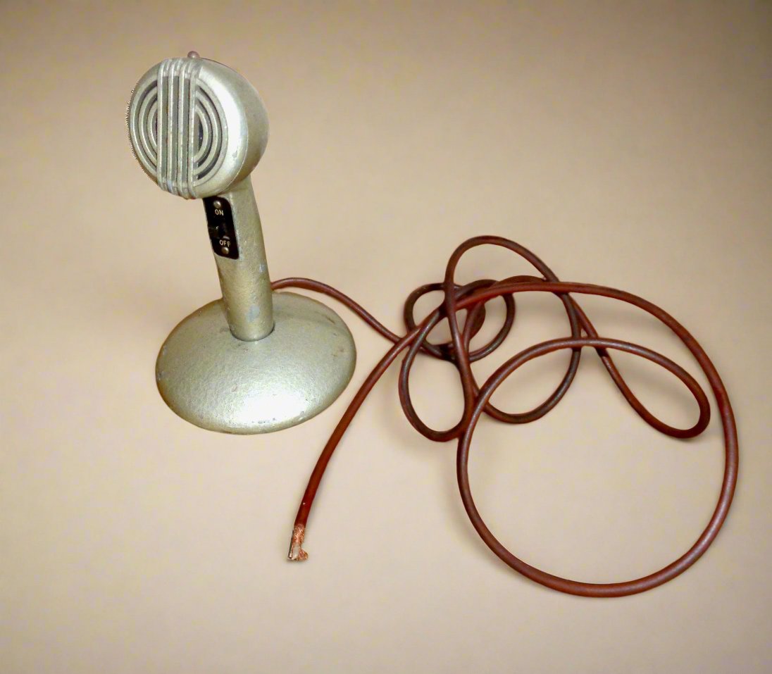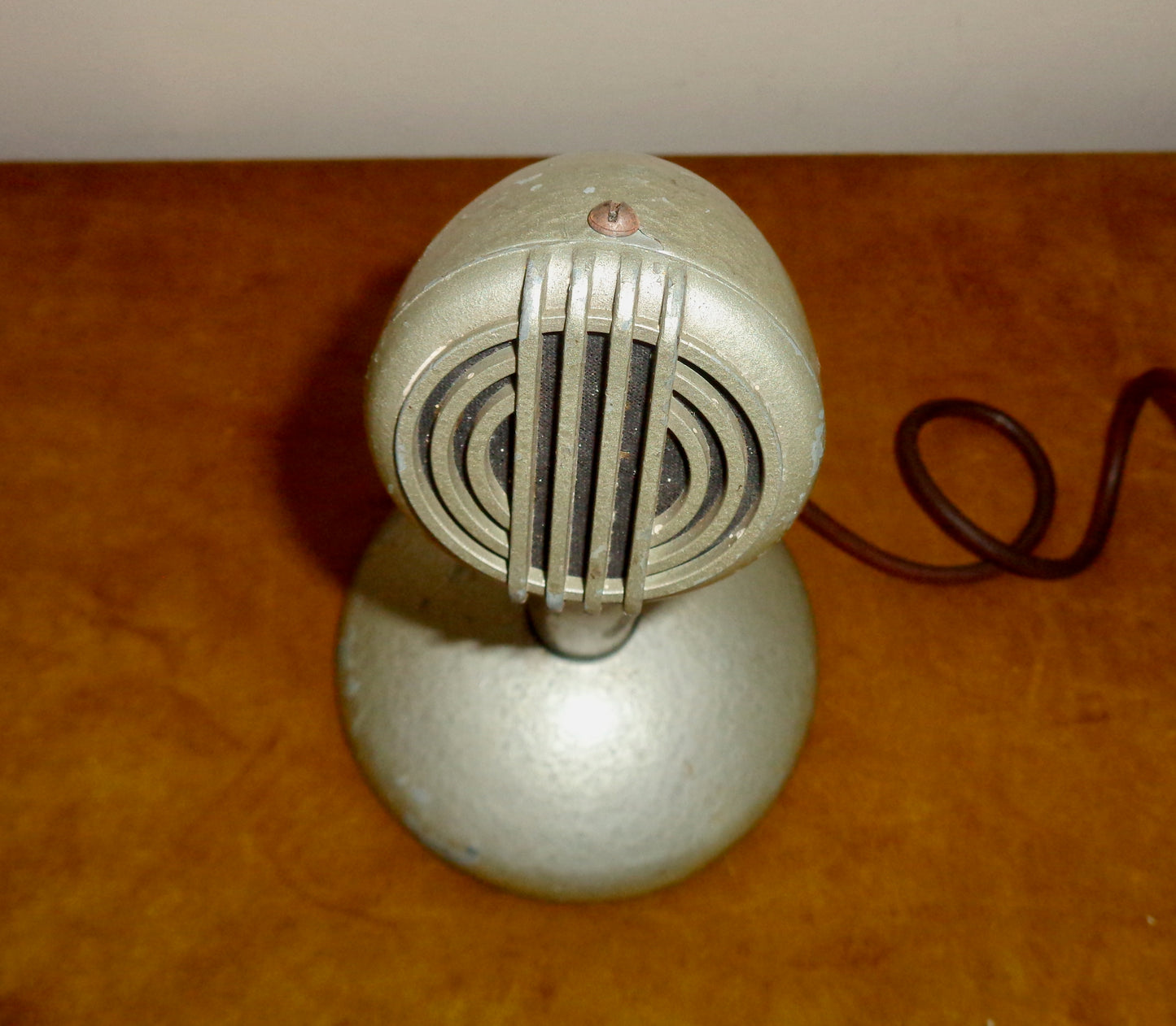 I've never come across another of these 1950s Hartley Electromotives Desk Microphone. Sporting a very fetching Art Deco style microphone, on a circular metal base, the microphone has a distinctive design with a black plastic on/off switch.