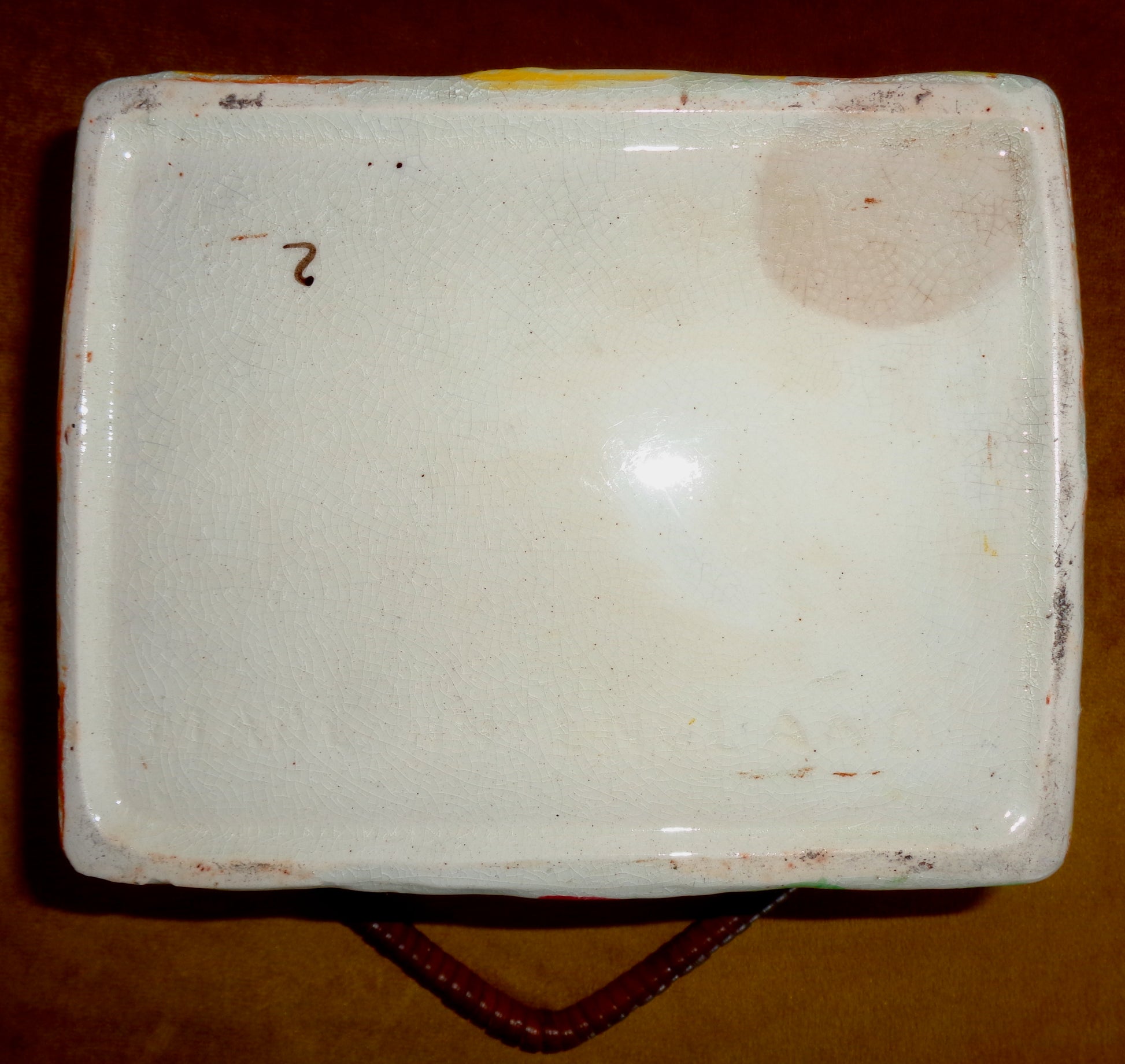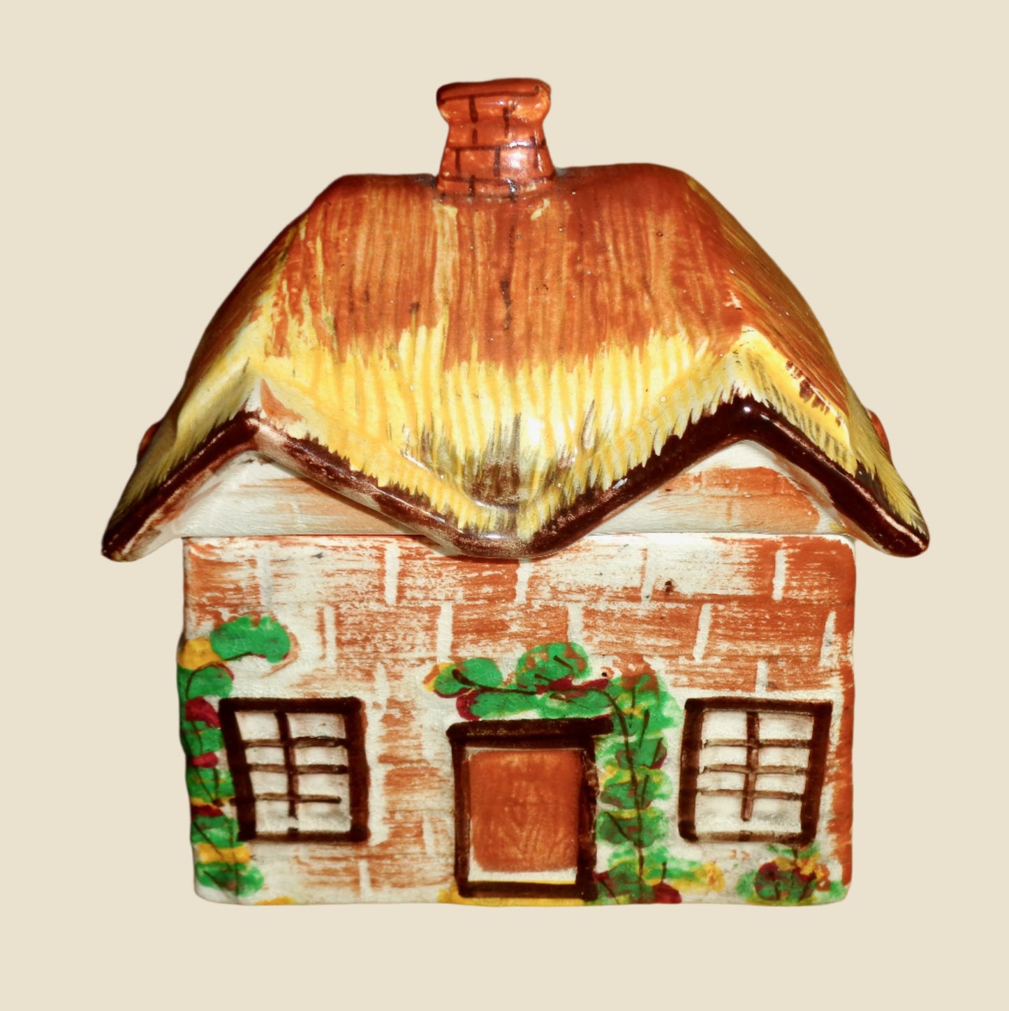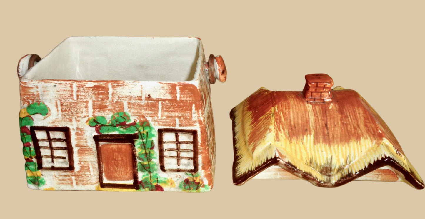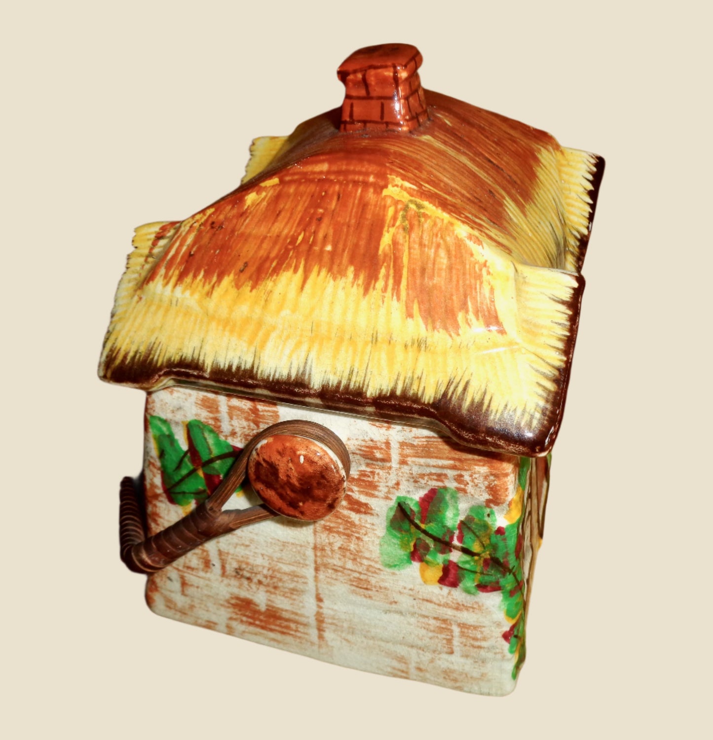 It is impressed on the base with Made in England and, (very faintly), with ‘Ye Olde Cottage Ware,’ which describes it perfectly as it is the archetypical English cottage with country cottage flowers and thatched roof.