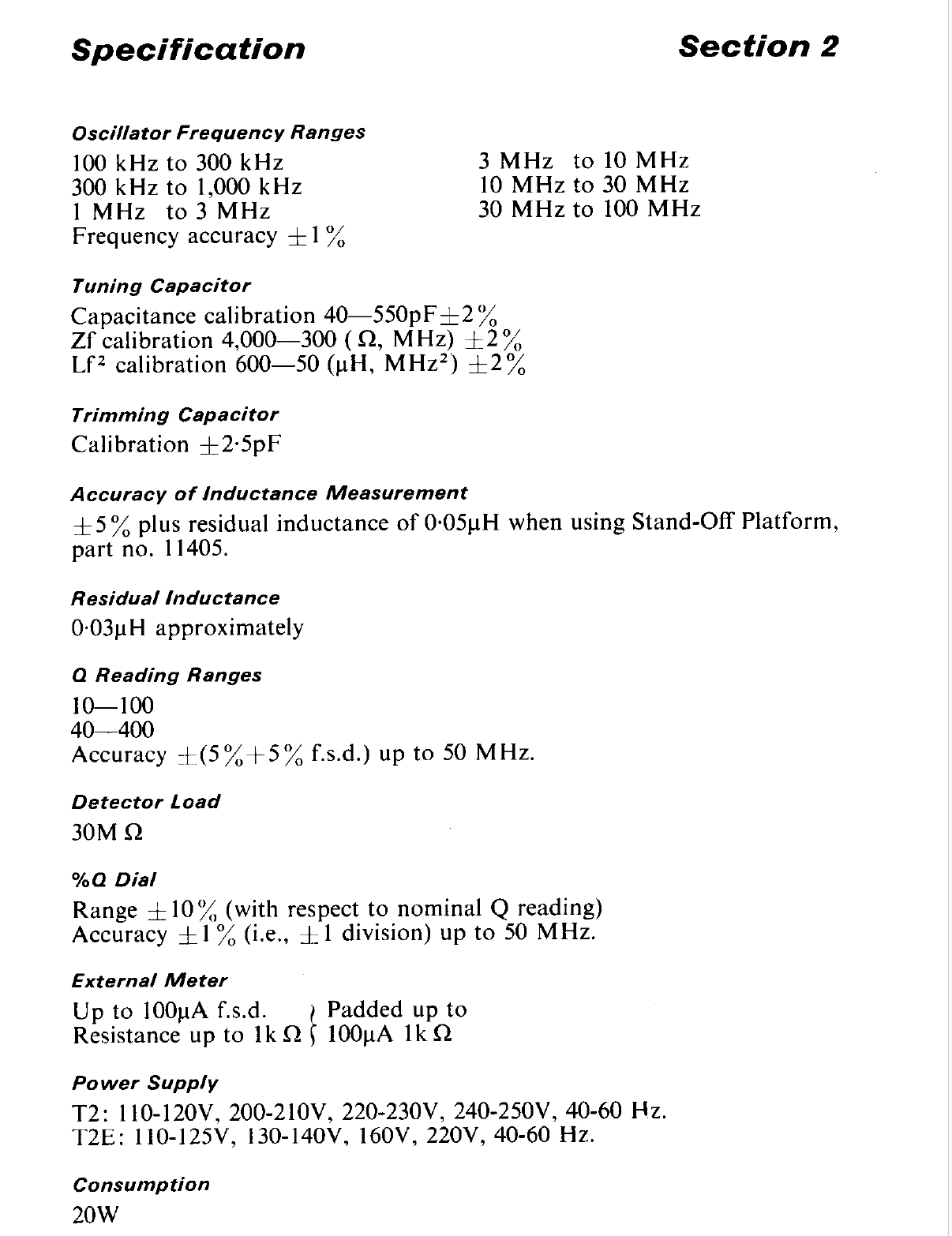 Designed to measure and compare circuit magnification (Q: Quality Factor), inductance, capacitance and power factor at frequencies between 100kHz and 100 MHz: see appended instrument specification.