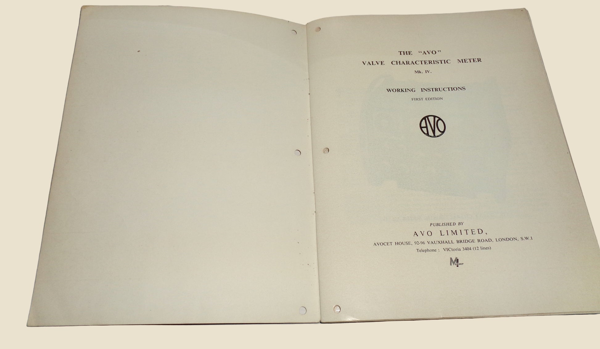 This is an original, first edition, 1960s AVO Valve Characteristic Meter Mark IV Instruction Manual, published by AVO Limited, Avocet House, London.