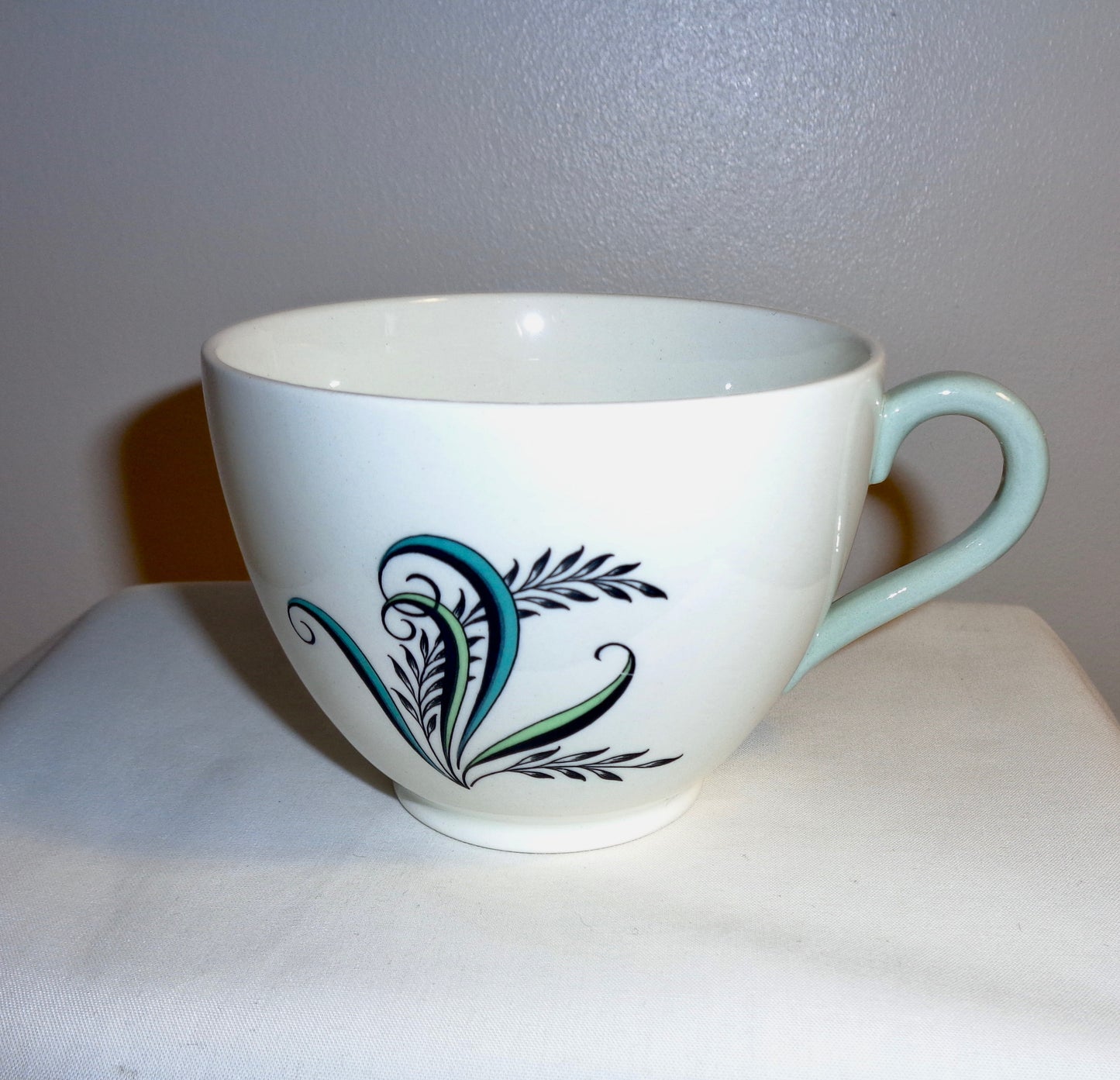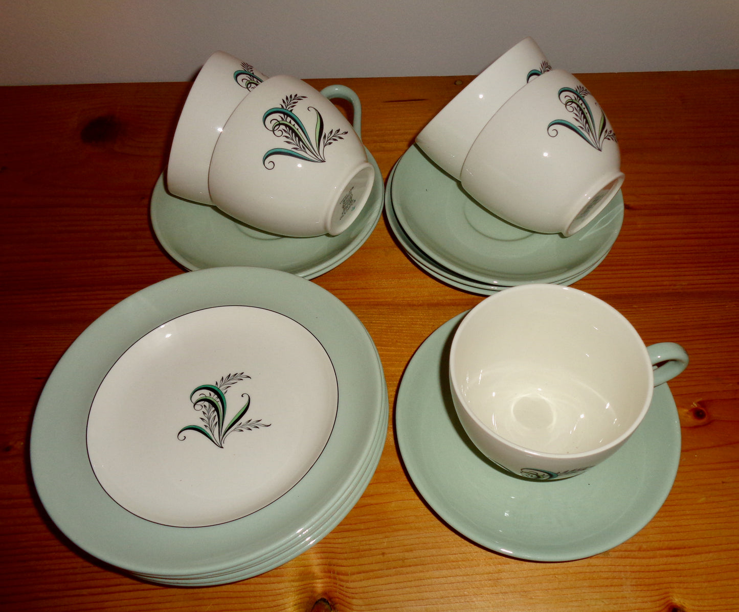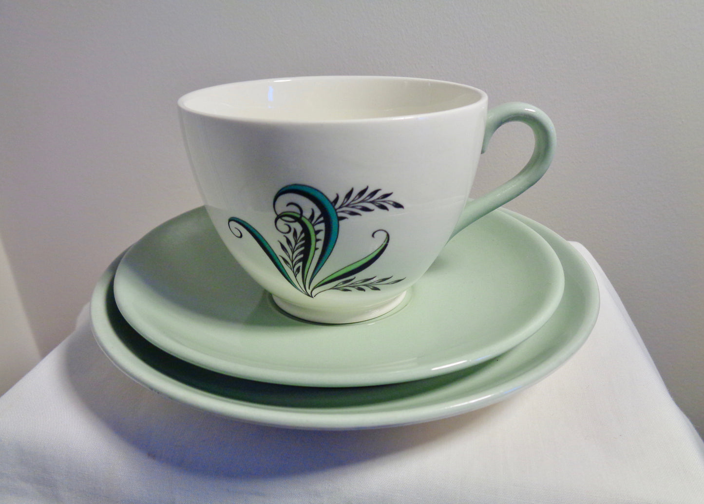 The sage green colour of the saucer is echoed on the green, blue and black feathery grass design on the cup and handle, and the outer rim of the tea plate.