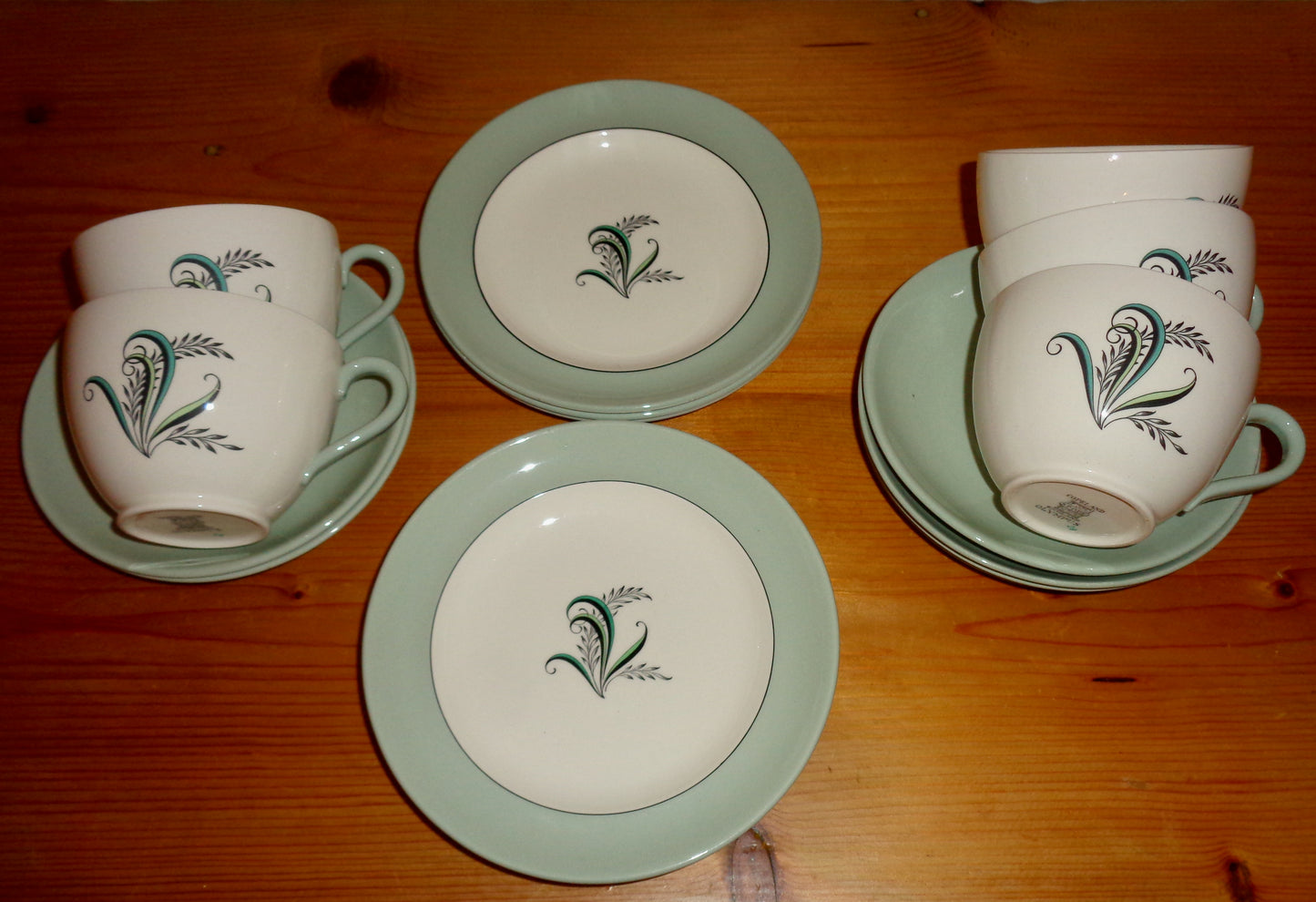 They are in good vintage condition, with some manufacturing defects, and with a little wear e.g. surface scuffs. There are no chips, cracks or crazing. Unfortunately, the set is missing one teacup. The price reflects that the set is incomplete at ~ £2/item.