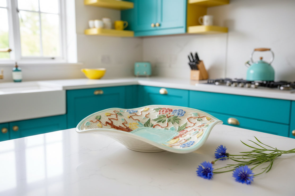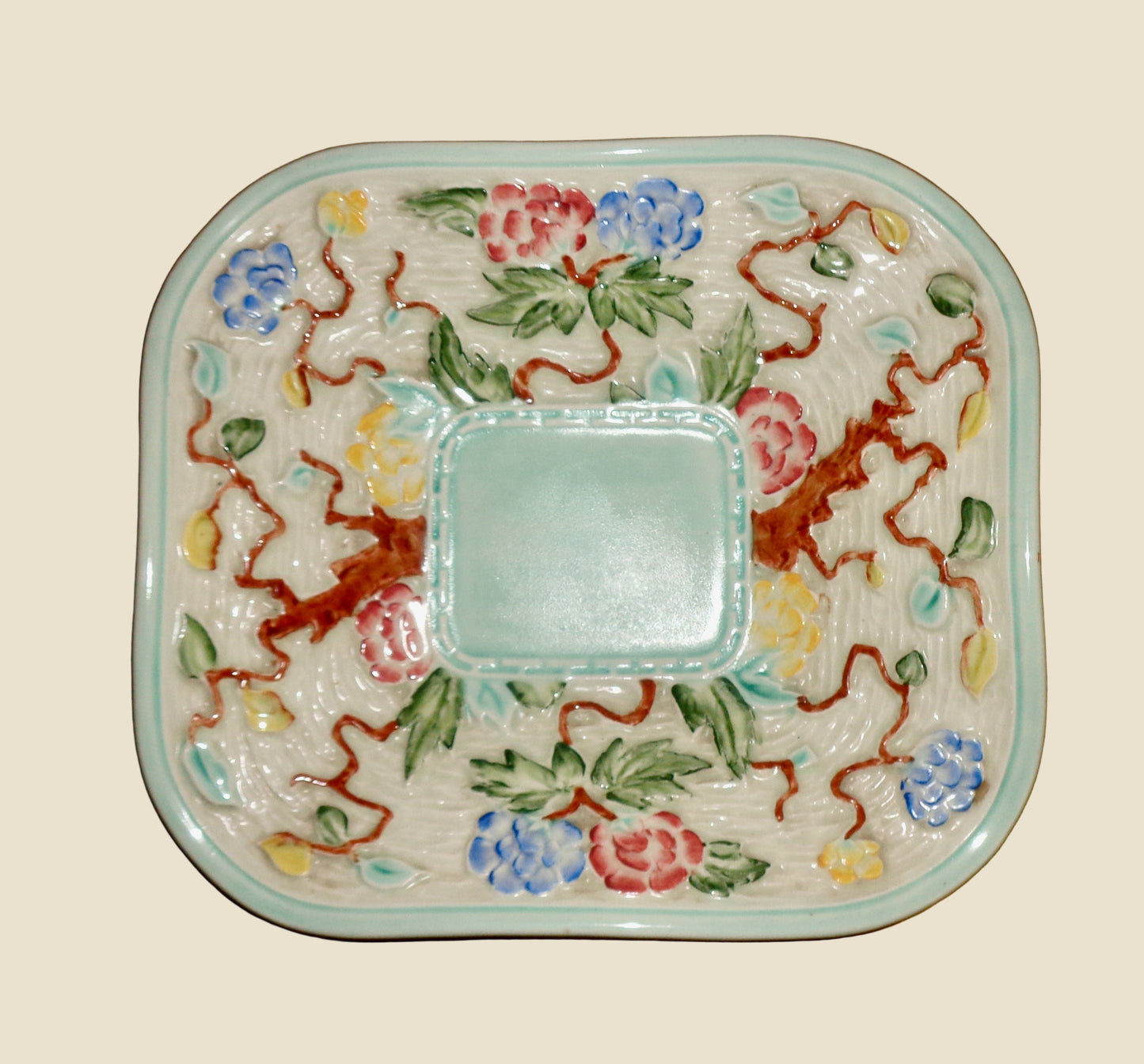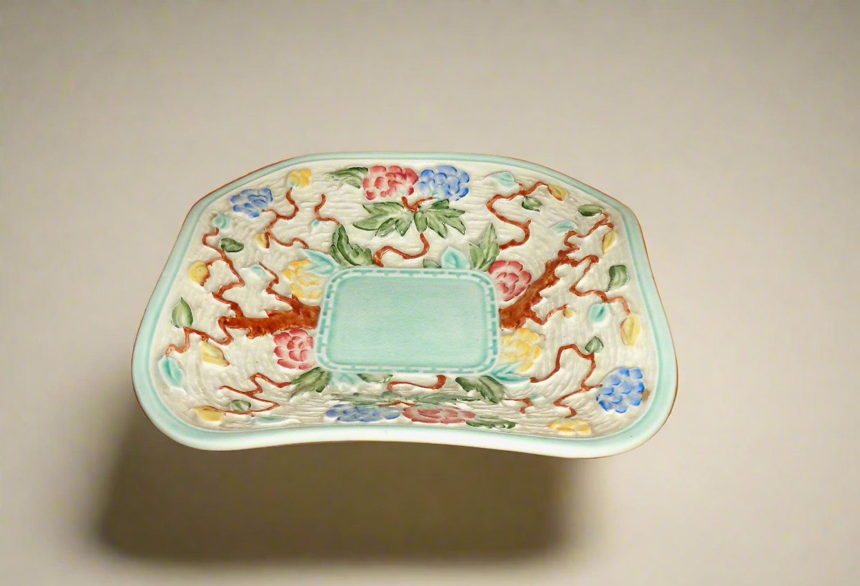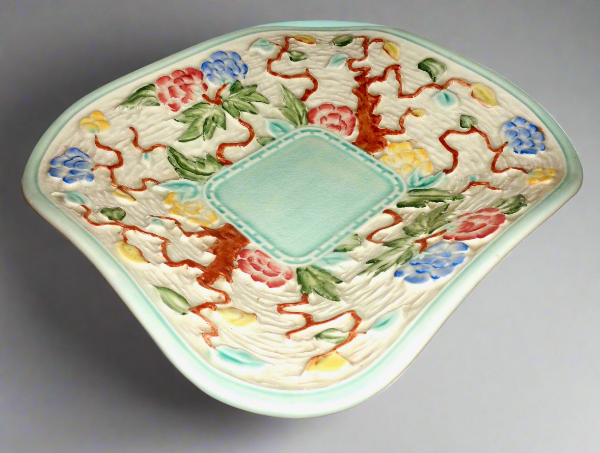 This is a beautiful pastel version of a 1960s Indian Tree Square Fruit Bowl By HJ Wood Staffordshire. With hues of green, cream, rust/red, blue, yellow, brown, this wavy almost square shaped bowl complements all types of decor.