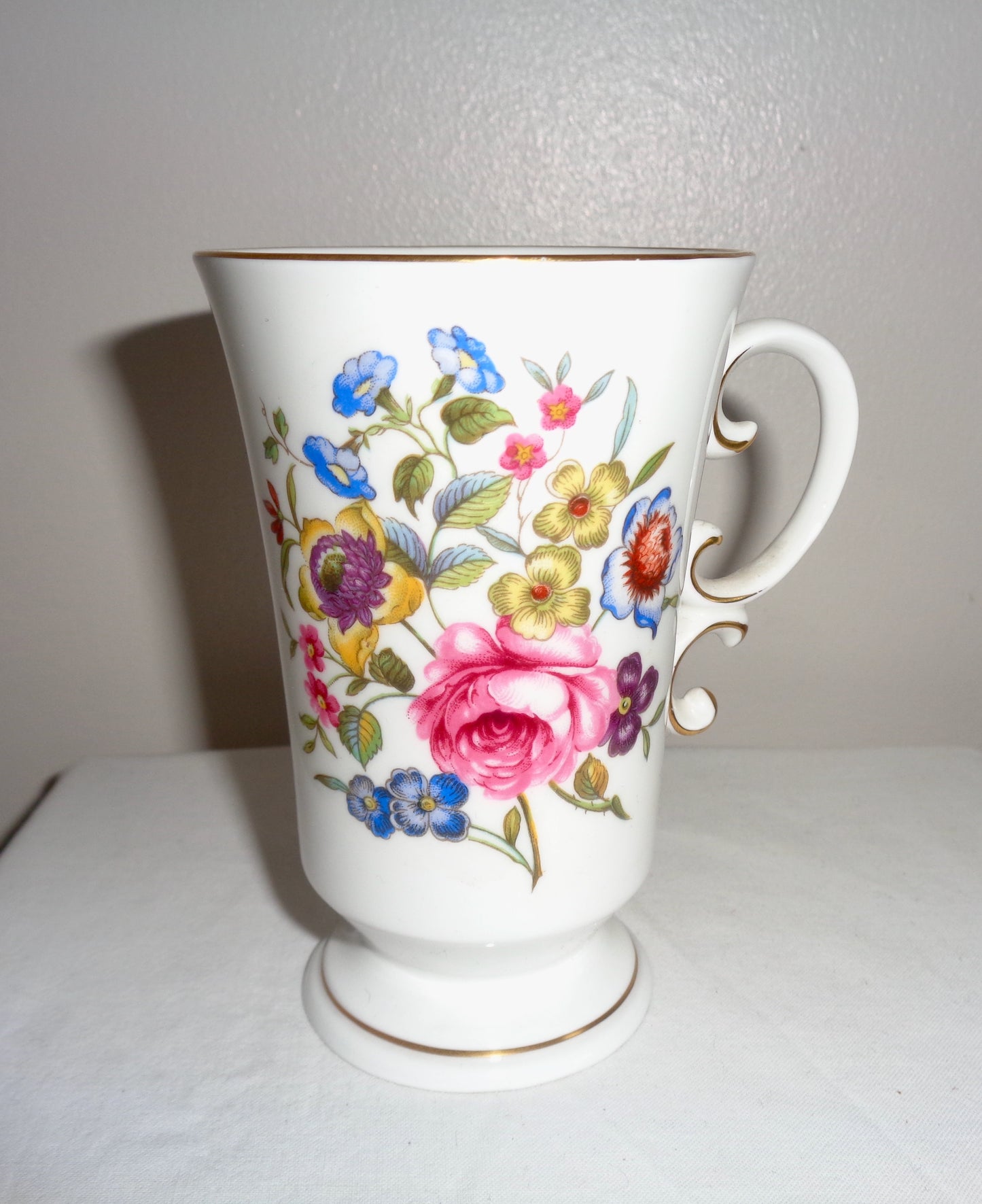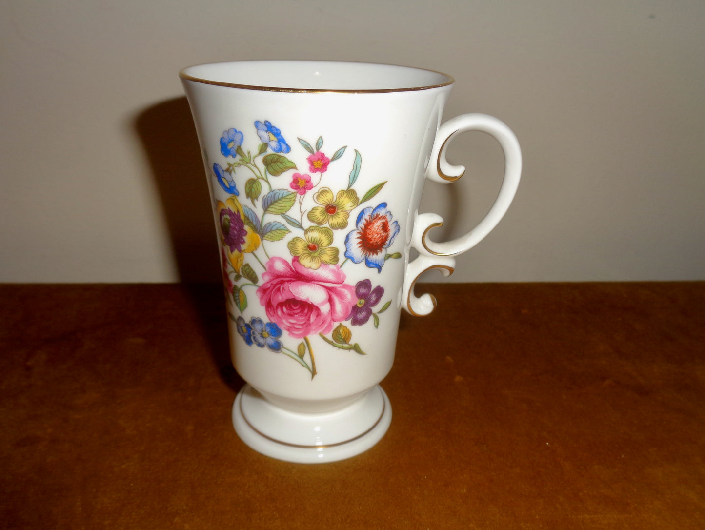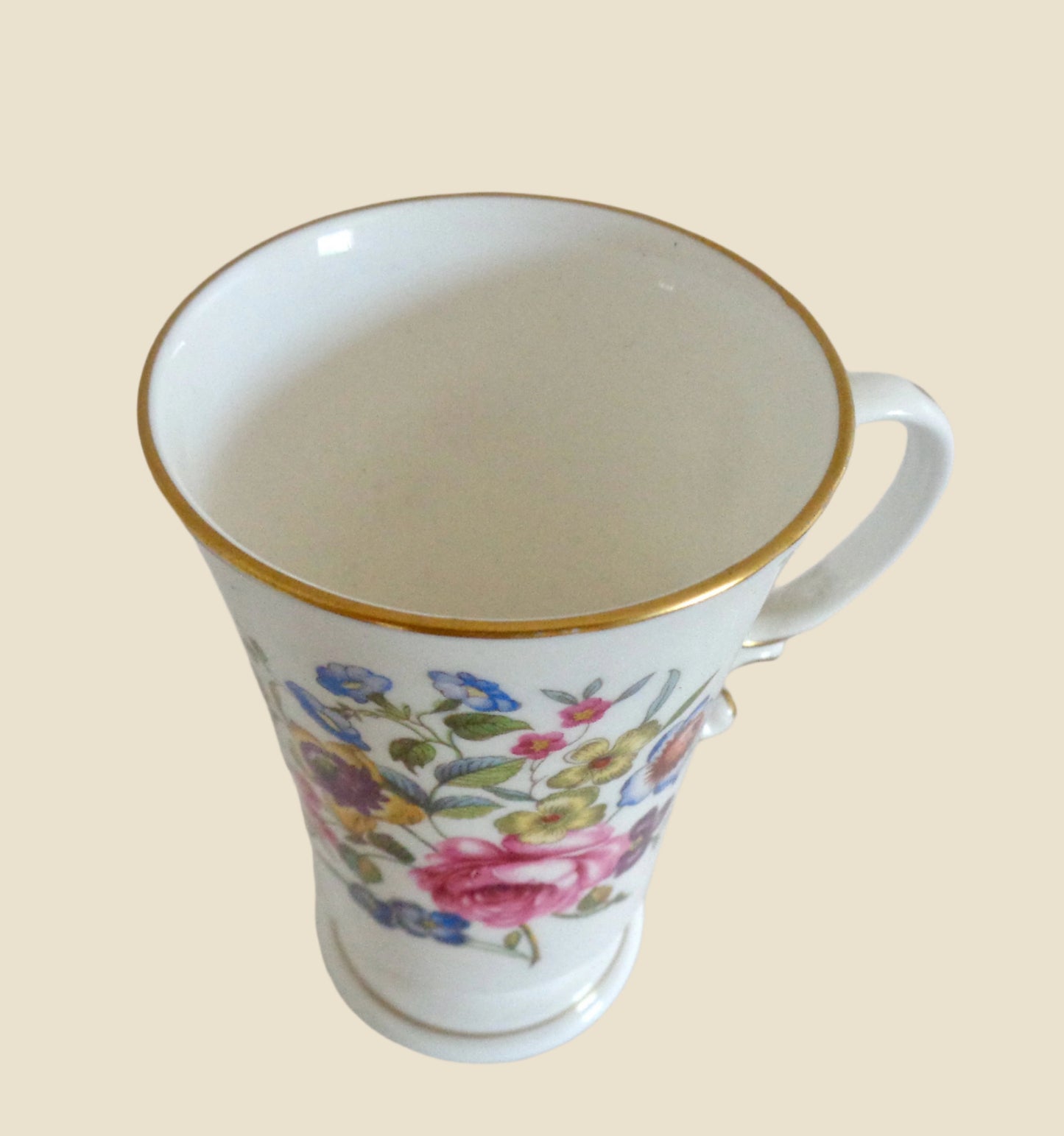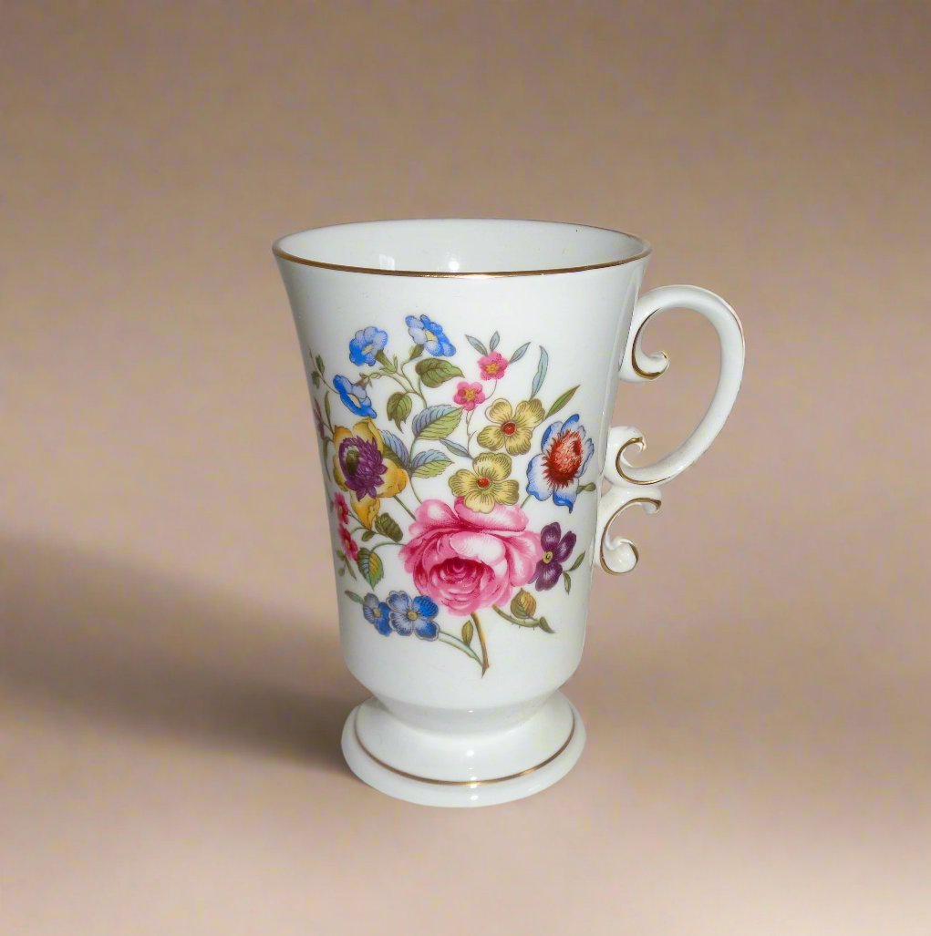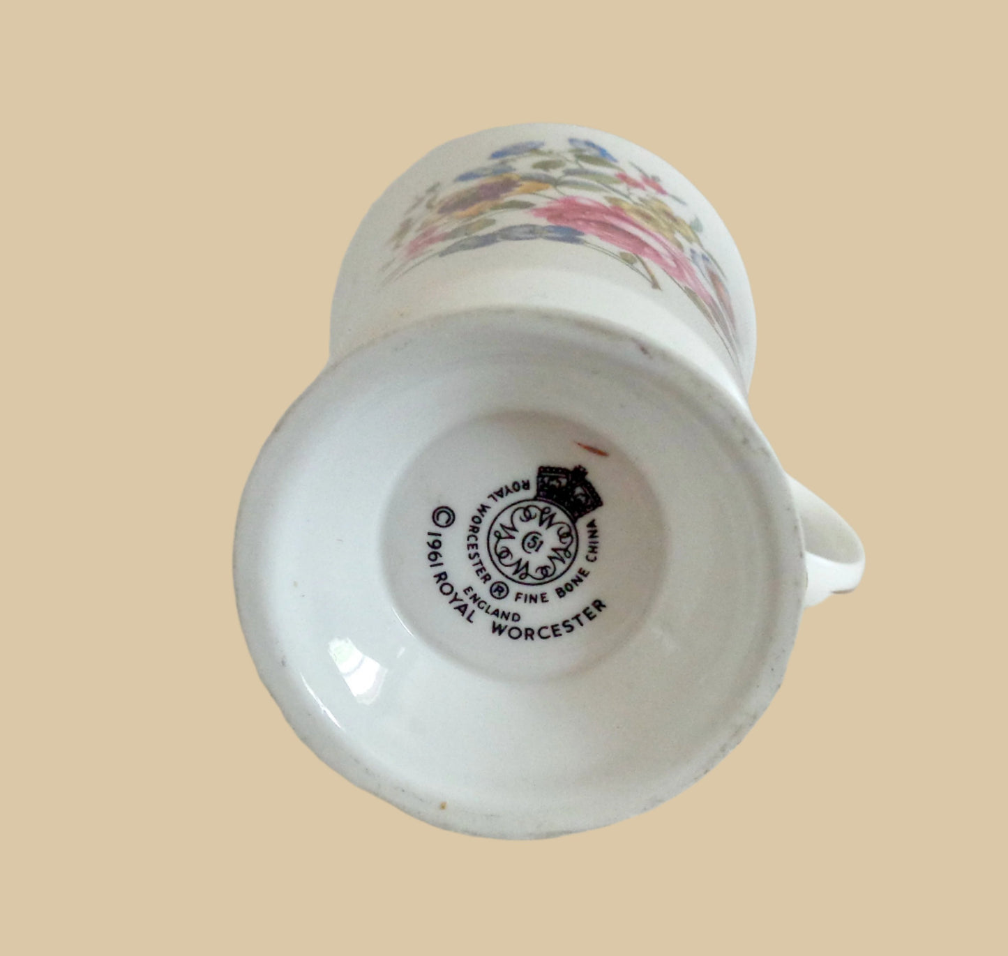 This is a lovely, small, 1961 Royal Worcester Bournemouth Pattern Coffee Cup / Mug. An unusual design with a pretty ornate handle. ‘Made in England’ from bone china with a 1960s Royal Worcester back stamp.