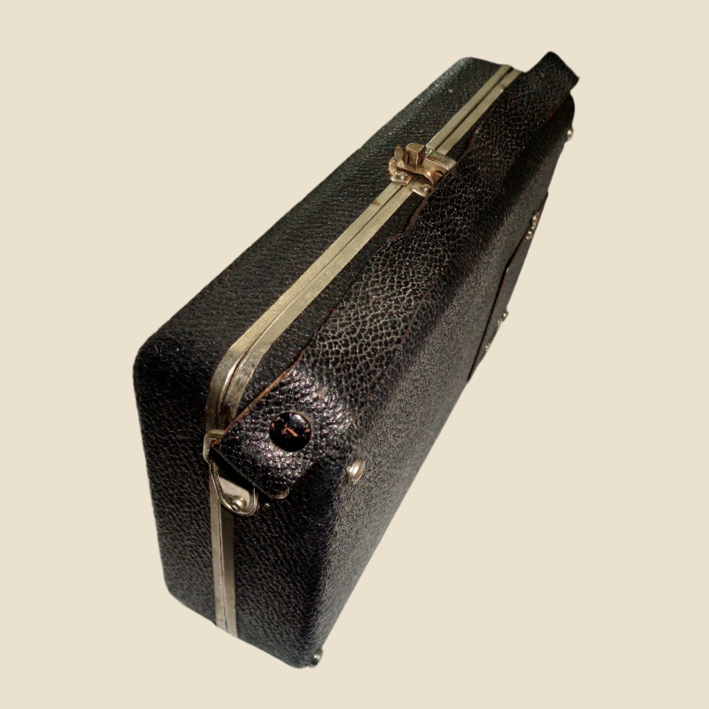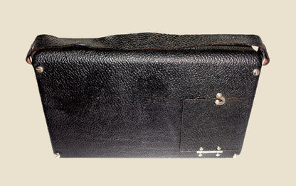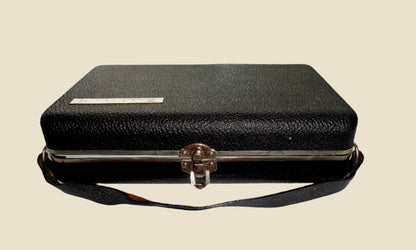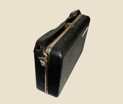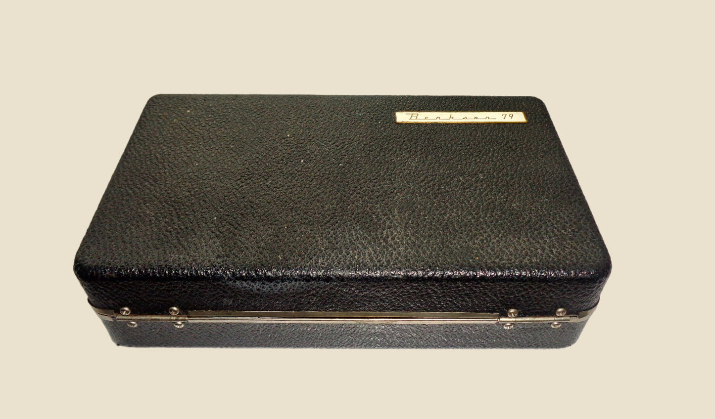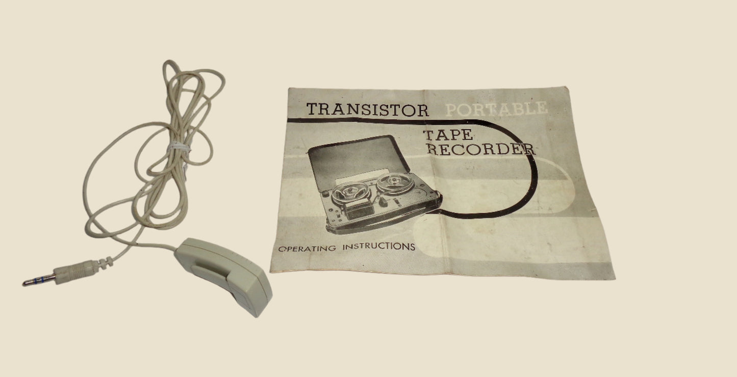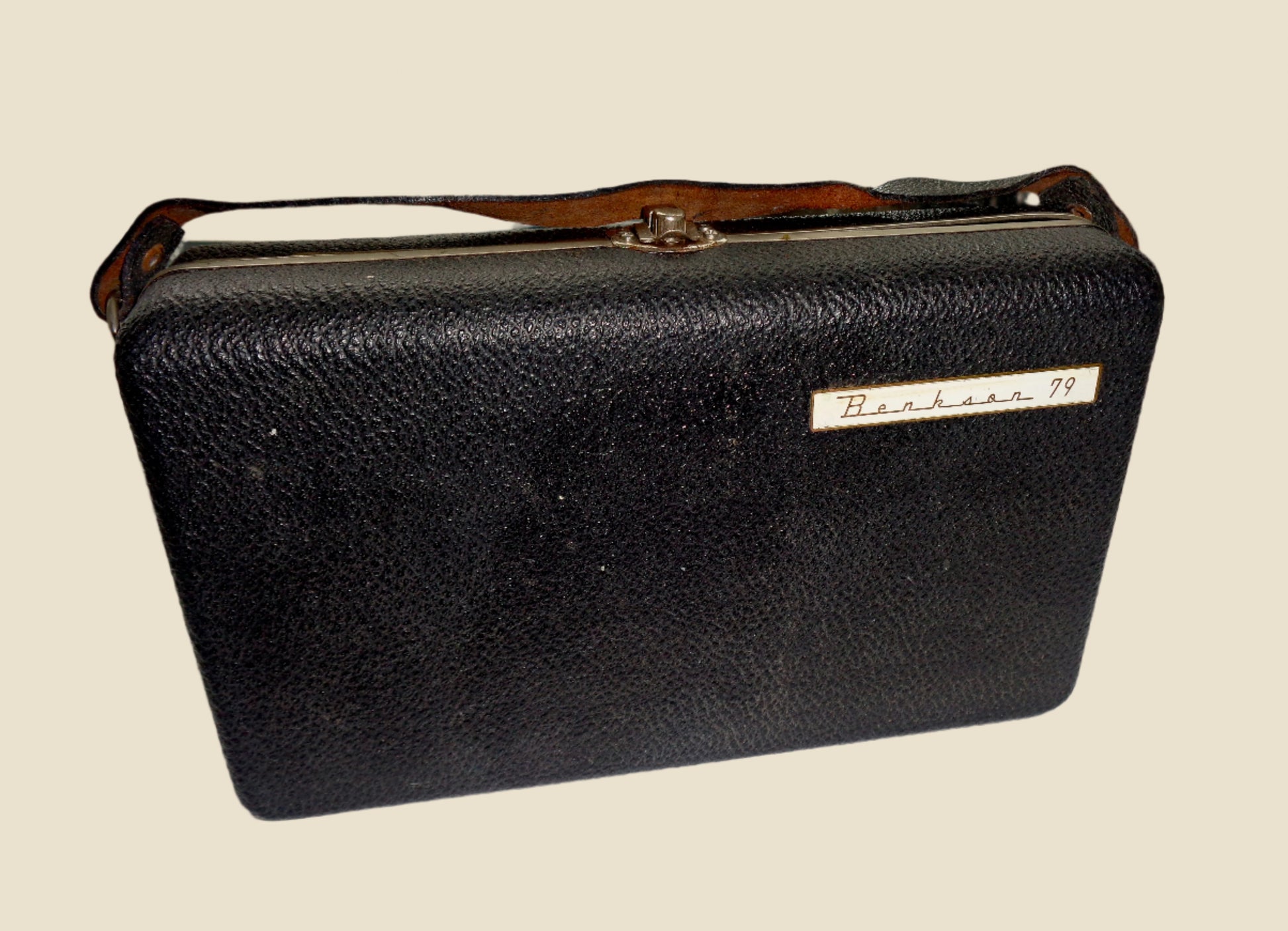 This small, battery powered, vintage 1970s Benkson 79 Portable Transistor Tape Recorder is neatly fitted within its own black leatherette covered metal case. It even comes with its original white lapel microphone and instructions.