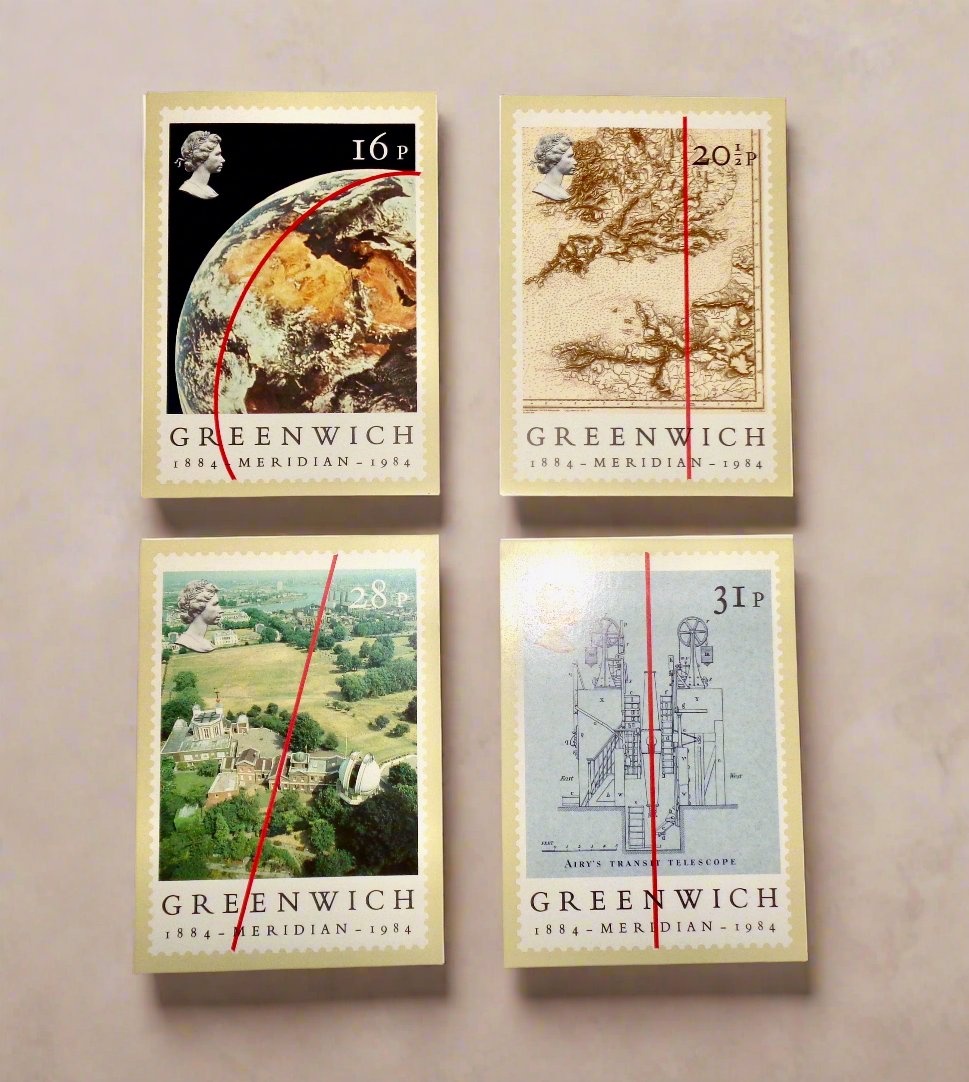 1984 Set of Four PHQ 77 Postcards Of Greenwich Meridian Centenary featuring the position of the meridian on different images.