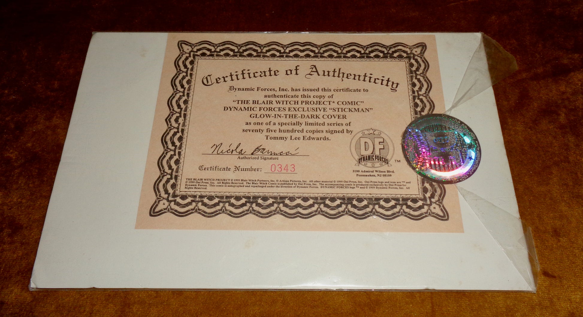 An original, Glow in the Dark, 1999 Dynamic Forces The Blair Witch Project Stickman Limited Edition Comic Signed by Tommy Lee Edwards.