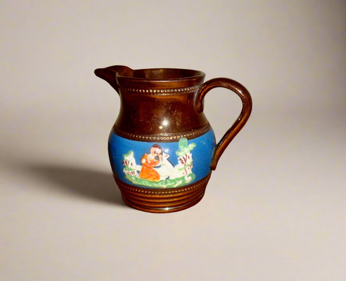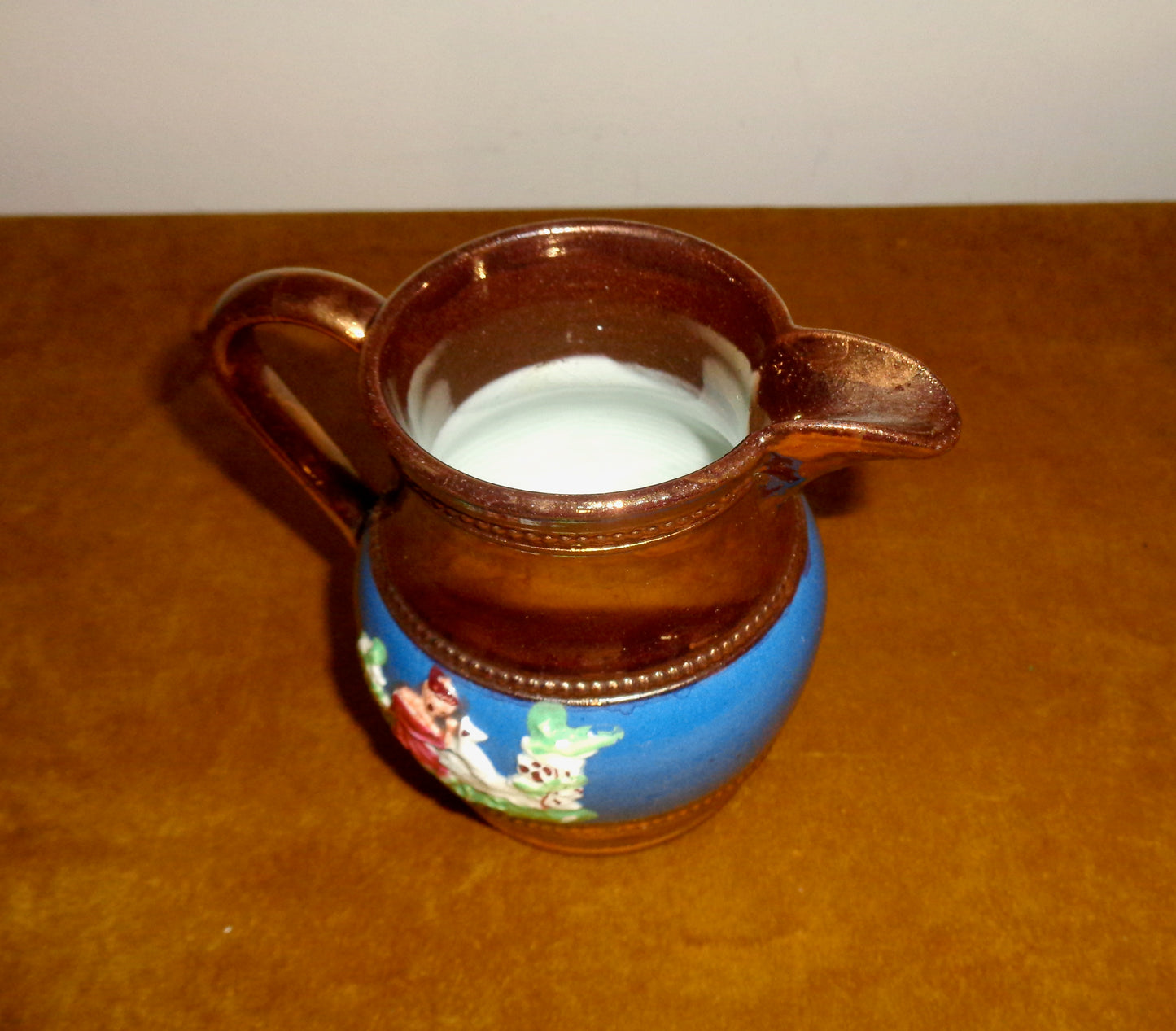 This Antique Copper Lustreware Milk Jug has a blue ground pottery band bearing an embossed scene of a woman with a red dress on one side and an orange dress on the opposite side. It has a very ‘folk art’ feel.