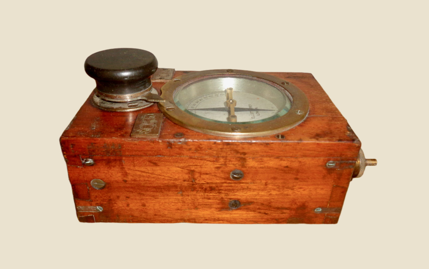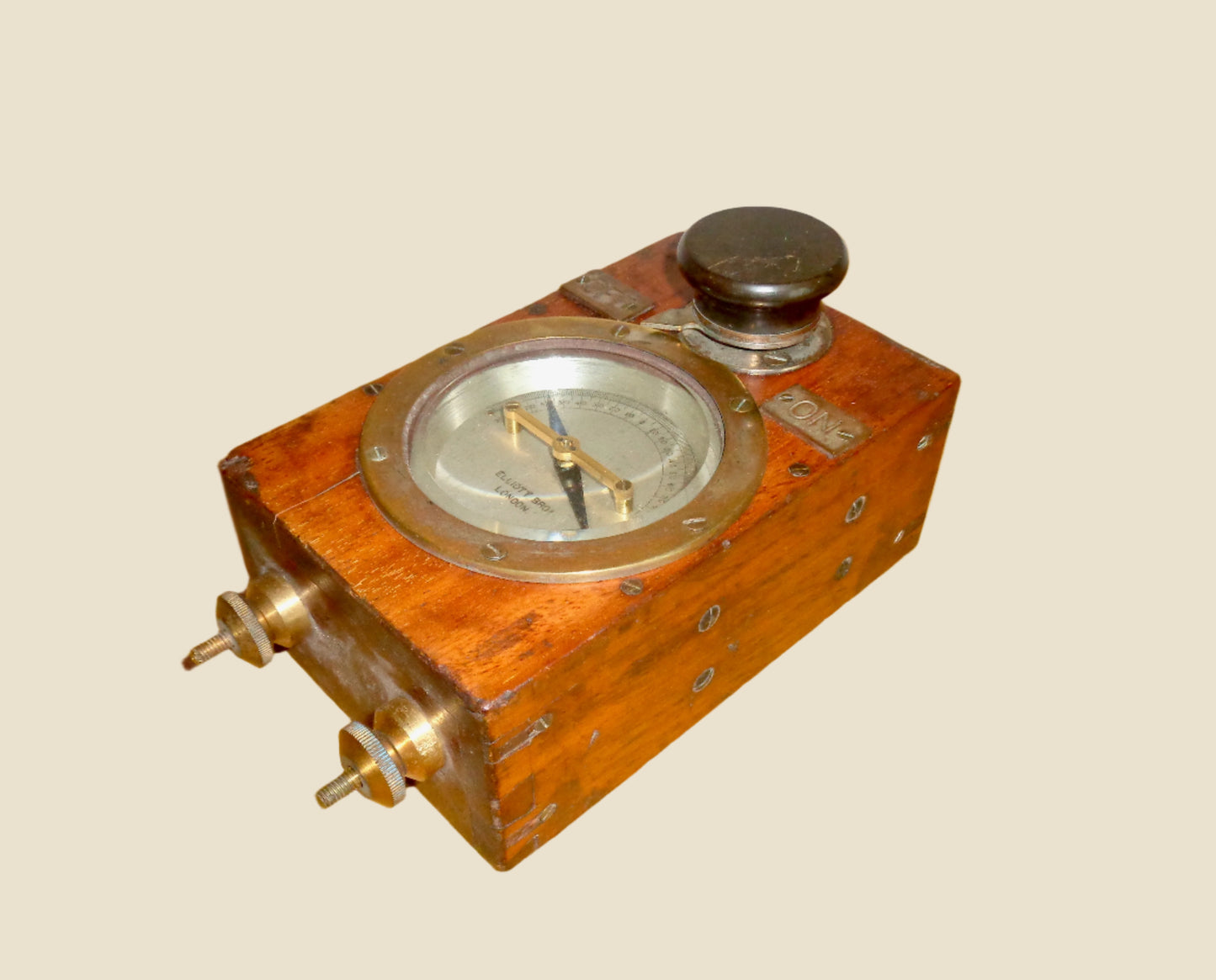 A very simple device, it is of a type used by telegraph linemen for qualitative fault finding on the line by indicating the presence of a current when connected to the circuit. The magnetic needle is deflected by an electromagnetic field. A form of early multimeter!