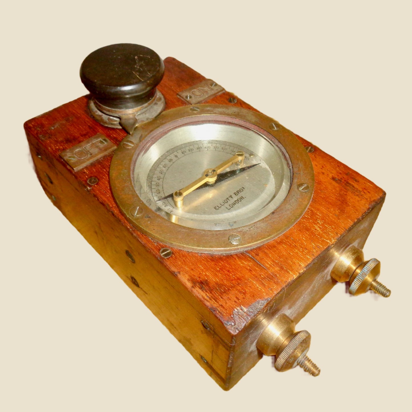 This is a wonderful Antique Elliott Brothers Galvanometer Telegraph Lineman's Detector In Wood & Brass dating to the late Victorian/ early Edwardian period (1870s-1920s). This version is unusual as it was designed to be used horizontally with a large bakelite and brass on/off switch.