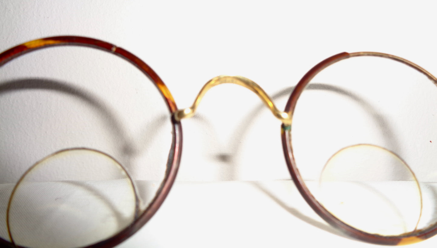 This is a wonderful pair of Antique Windsor Round Bifocal Glasses In Their Original Case. The spectacles are Gold filled and there is a hallmark on the nose rim. Each lens is surrounded by a gold filled frame and covered in a tortoise shell style rim. There is some of the tortoise-shell covering missing on one of the lenses.