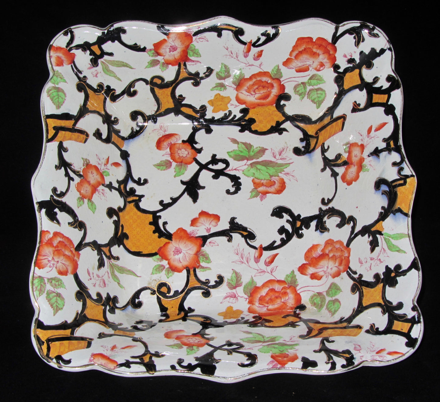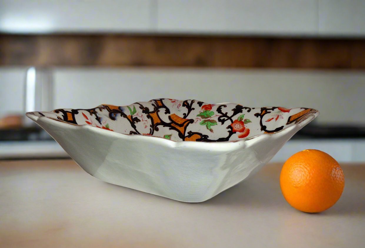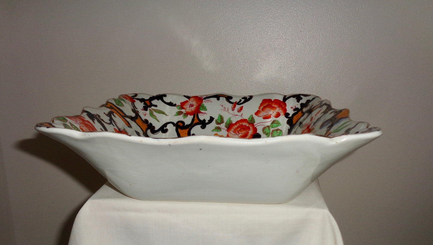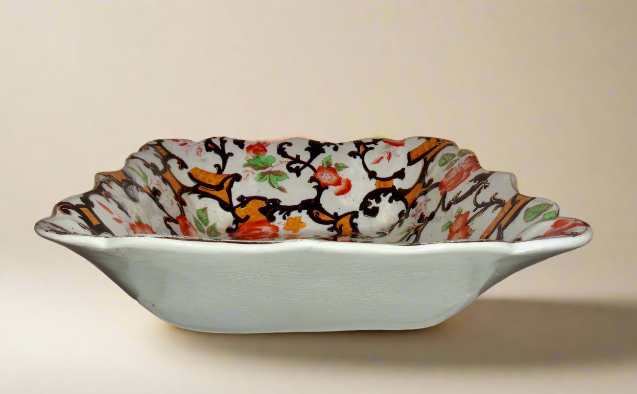 This is an absolutely gorgeous, square, Art Deco Holkirk Ware Katano Fruit Bowl Gaudy Welsh/Imari Style, with fluted edges. Made by Hollinshead & Kirkham (1924-56, Unicorn Pottery), Staffordshire.