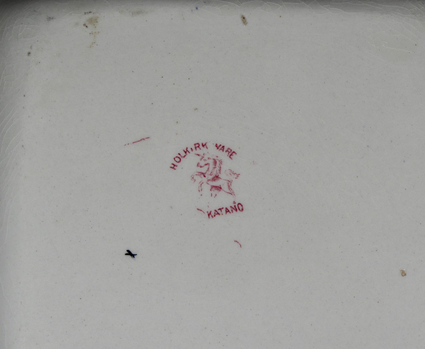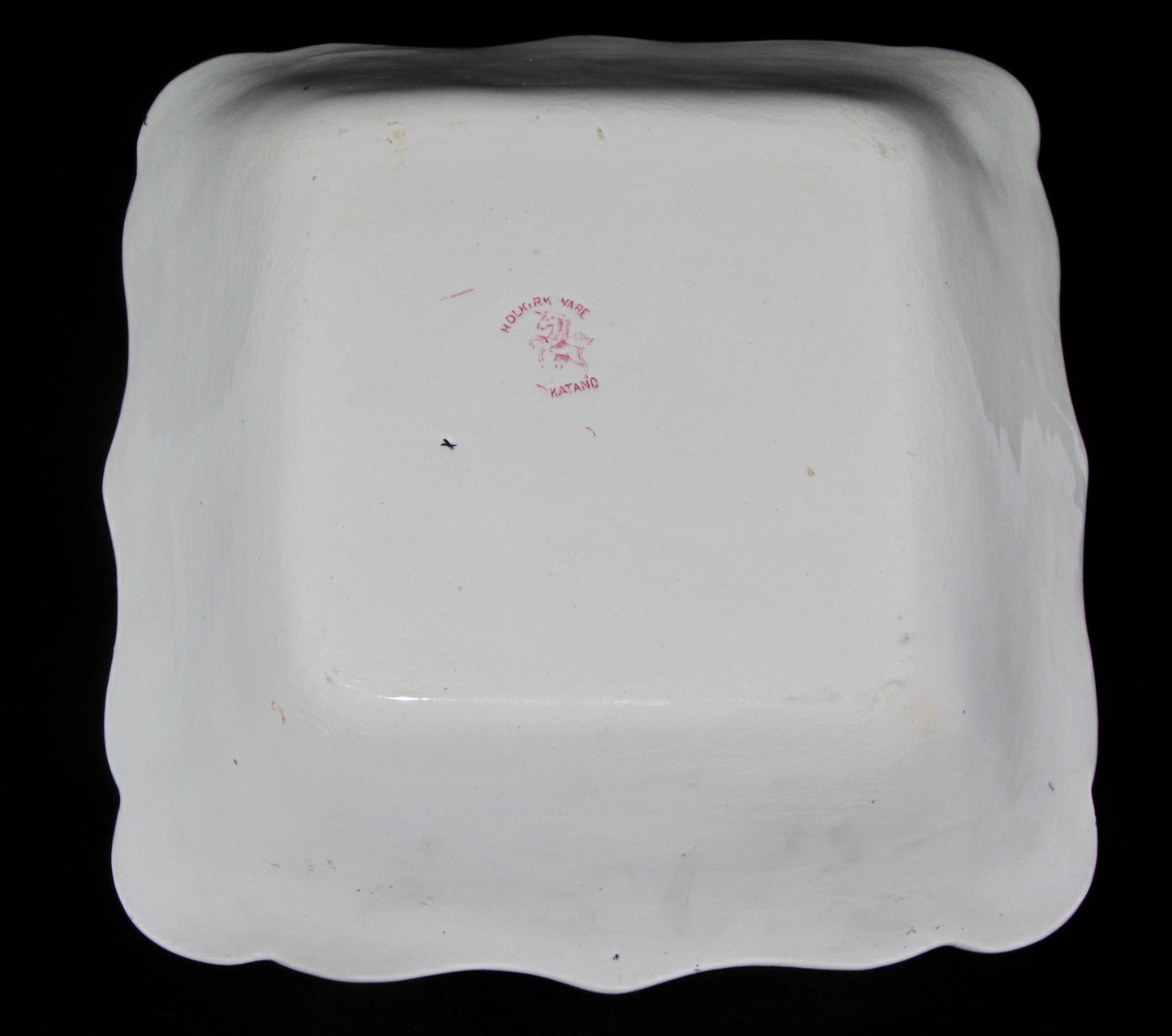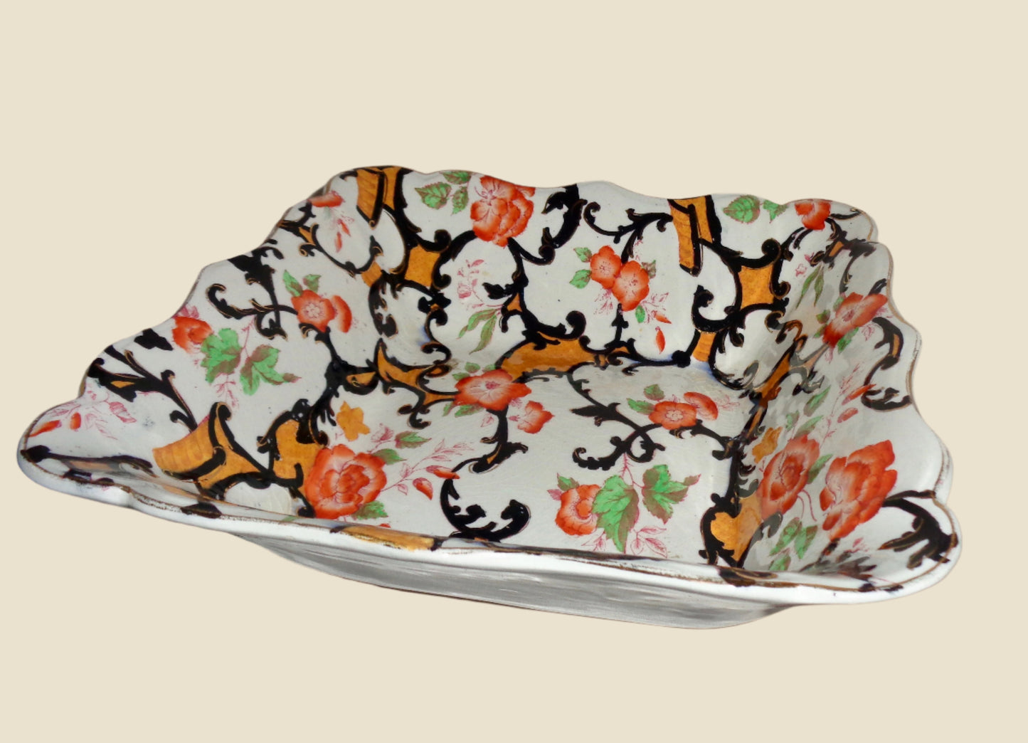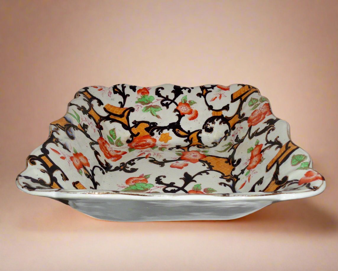 This is an absolutely gorgeous, square, Art Deco Holkirk Ware Katano Fruit Bowl Gaudy Welsh/Imari Style, with fluted edges. Made by Hollinshead & Kirkham (1924-56, Unicorn Pottery), Staffordshire.
