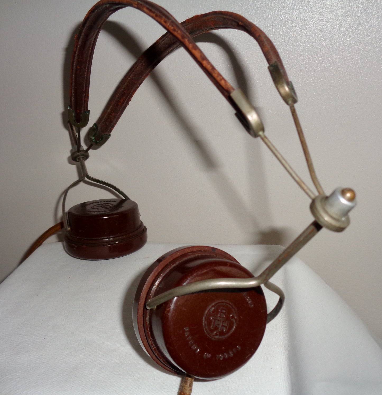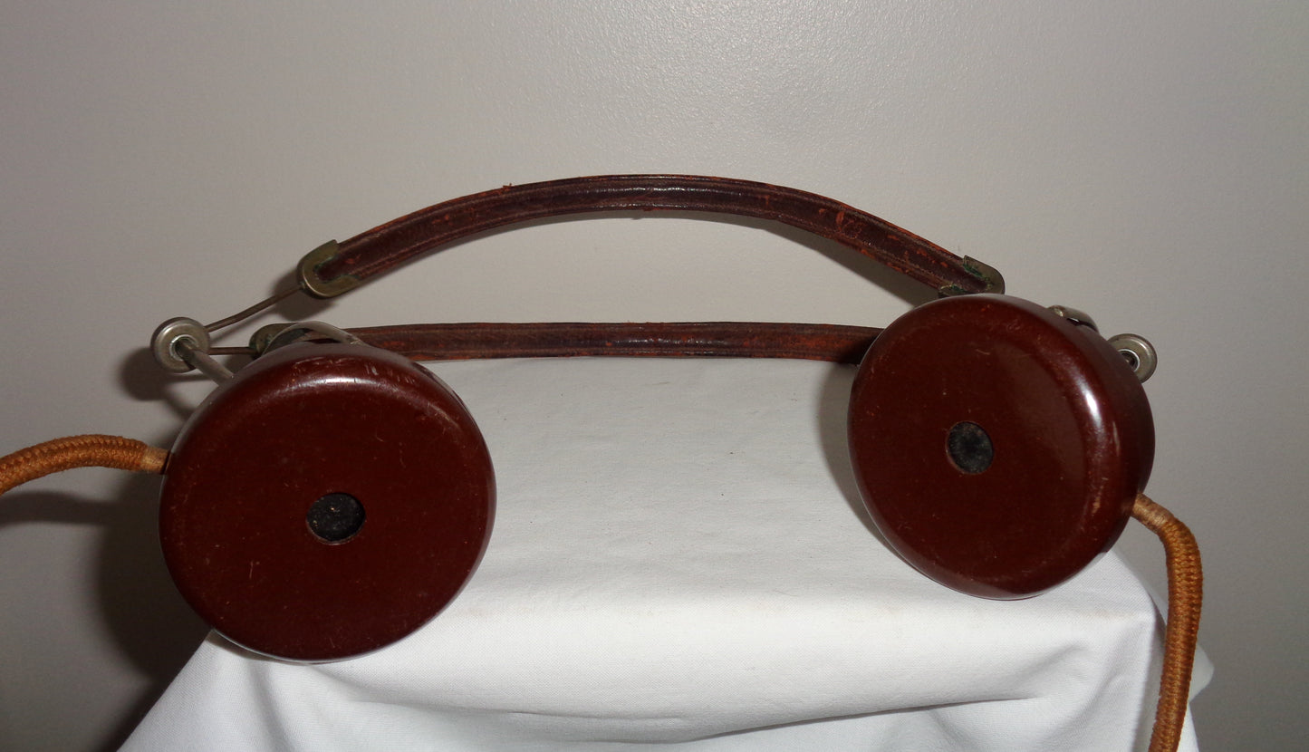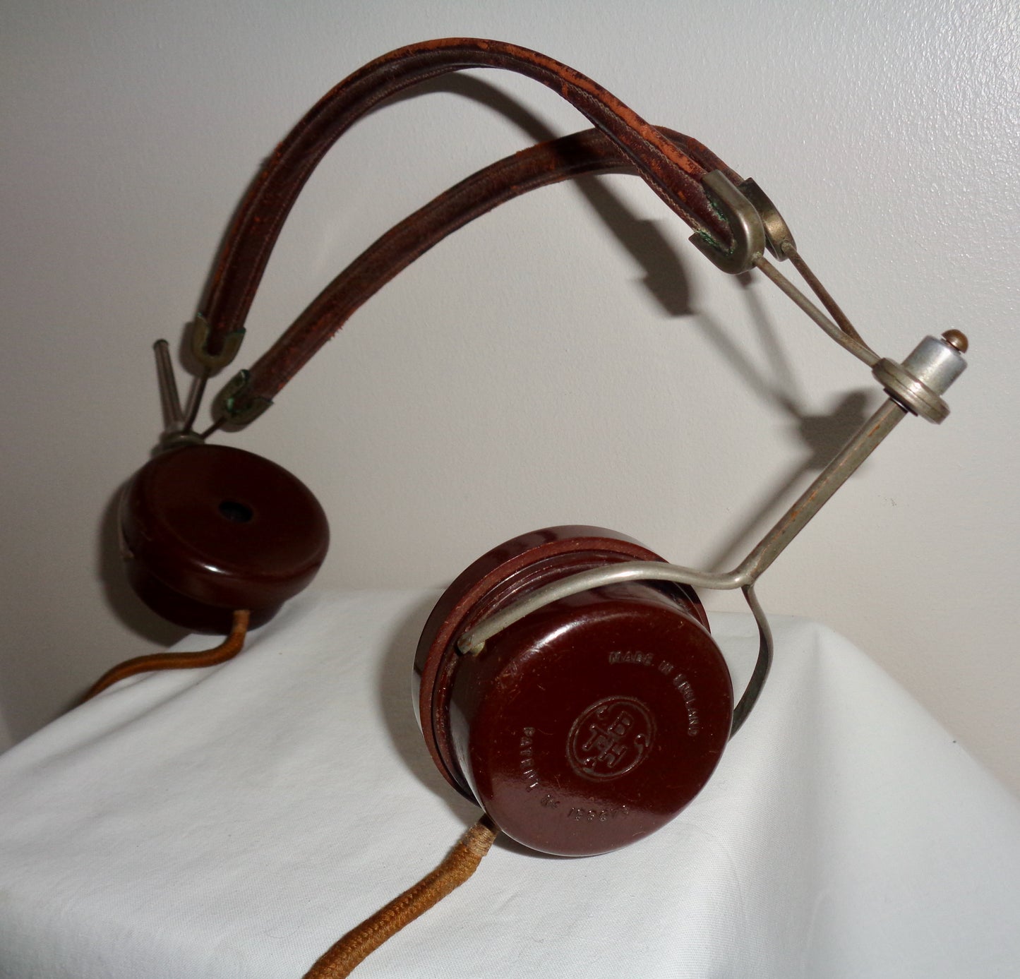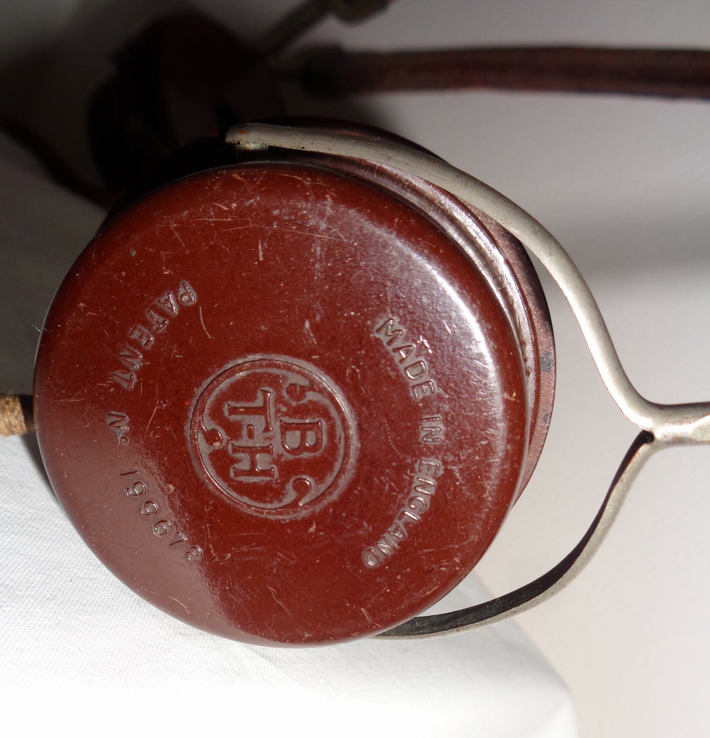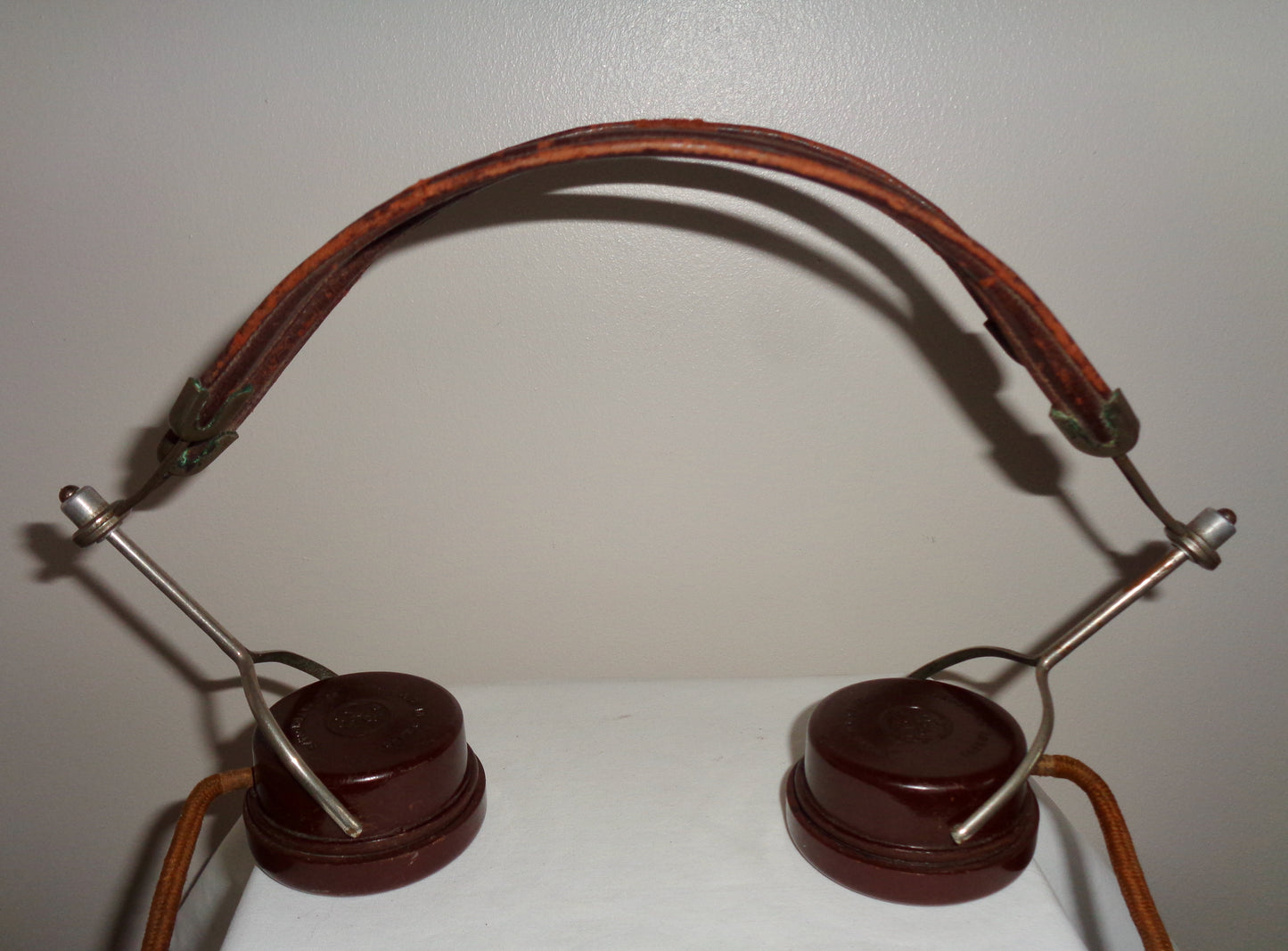 Comprise brown bakelite moulded ear pieces, with a leather covered aluminium headband, and original twisted flexible leads terminating in two spring clips. Sold as lightweight “Supreme for Clarity and Comfort.”