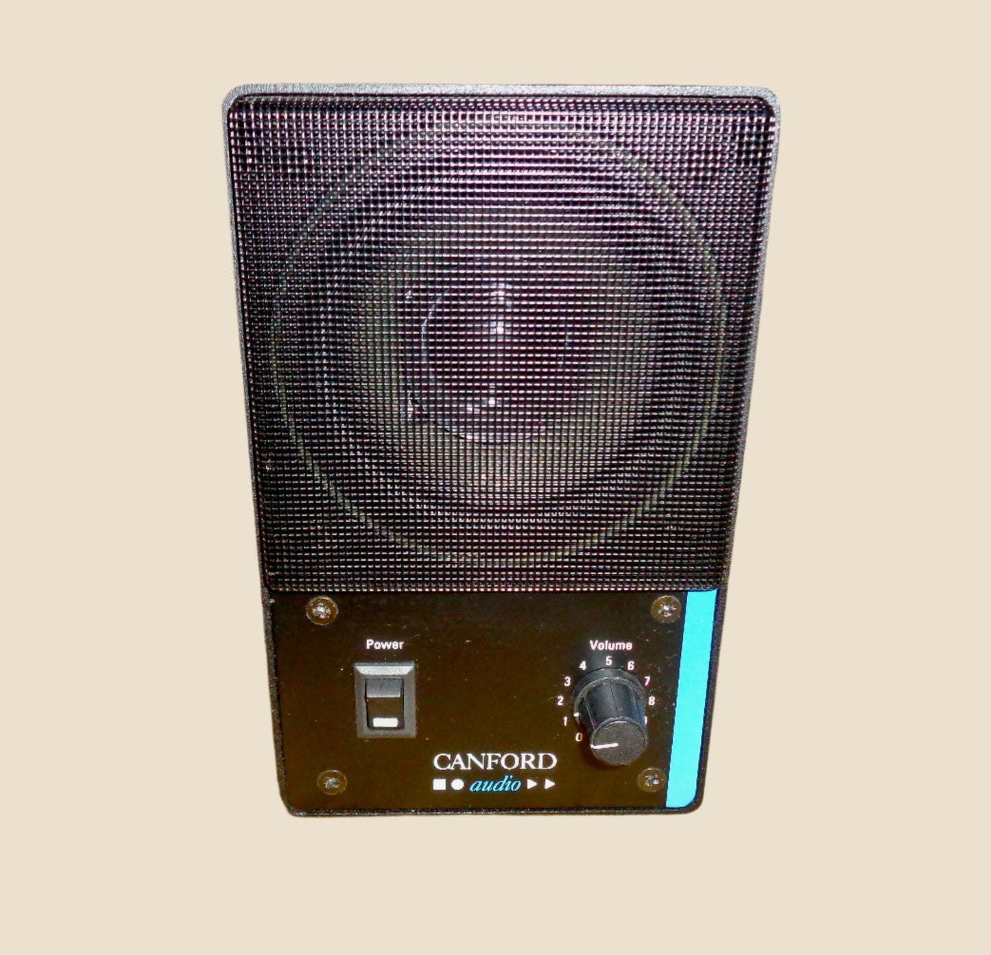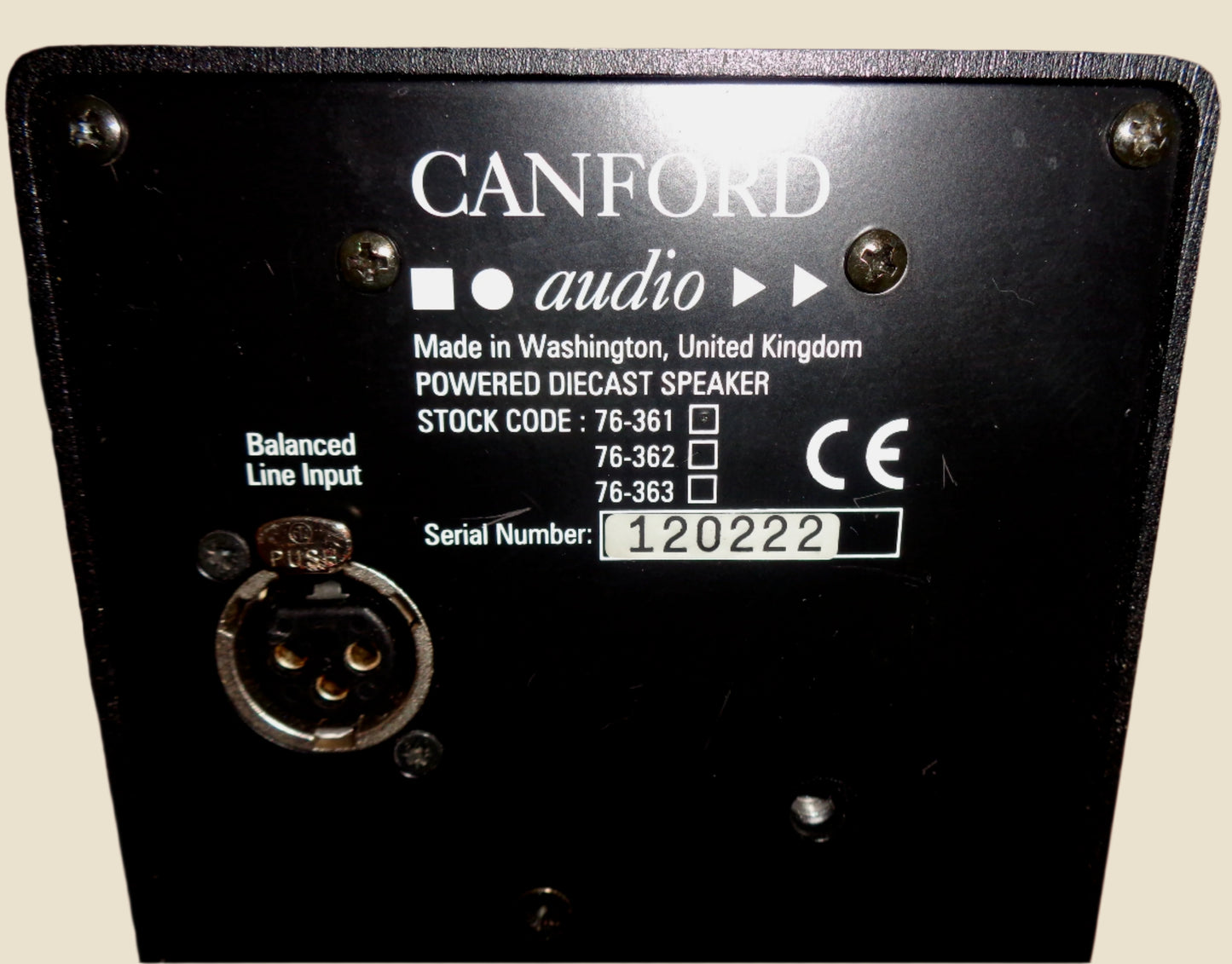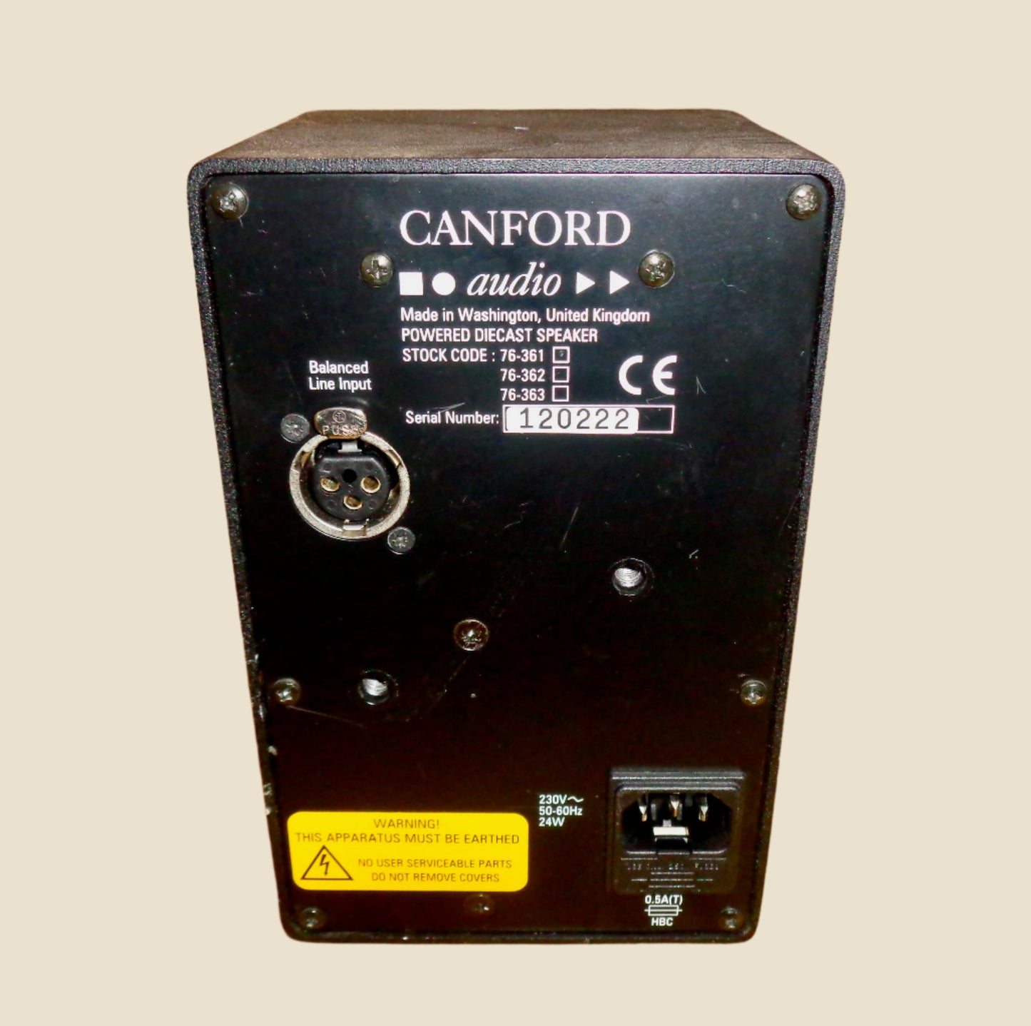 This preowned, small, Canford Audio 76-361 Powered Diecast Freestanding Portable Loudspeaker is in pretty good cosmetic condition with some surface scratches and blemishes.