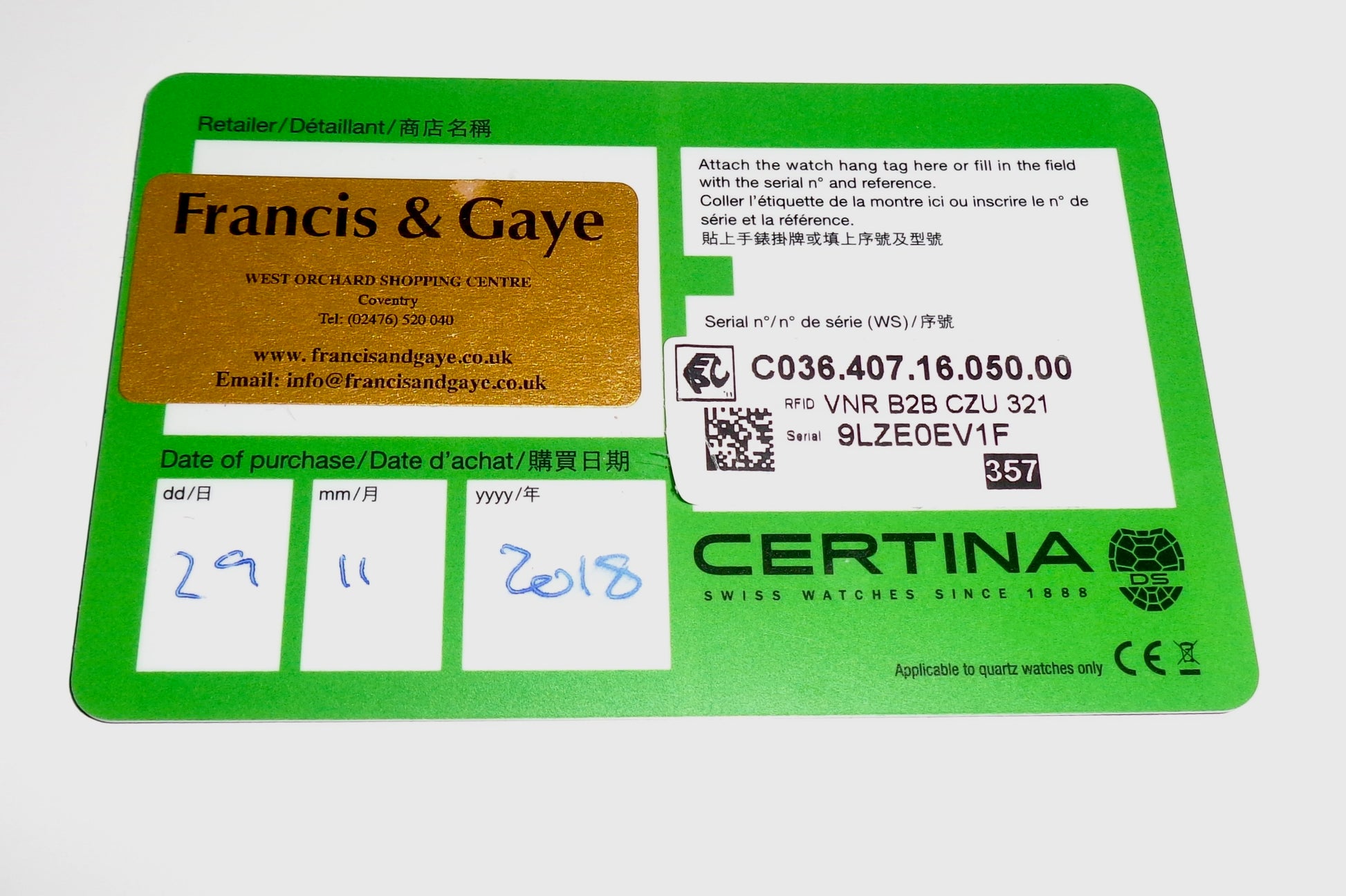 - Guarantee card dated 29/11/2018. Originally bought from Francis and Gaye Jewellers, Coventry, UK