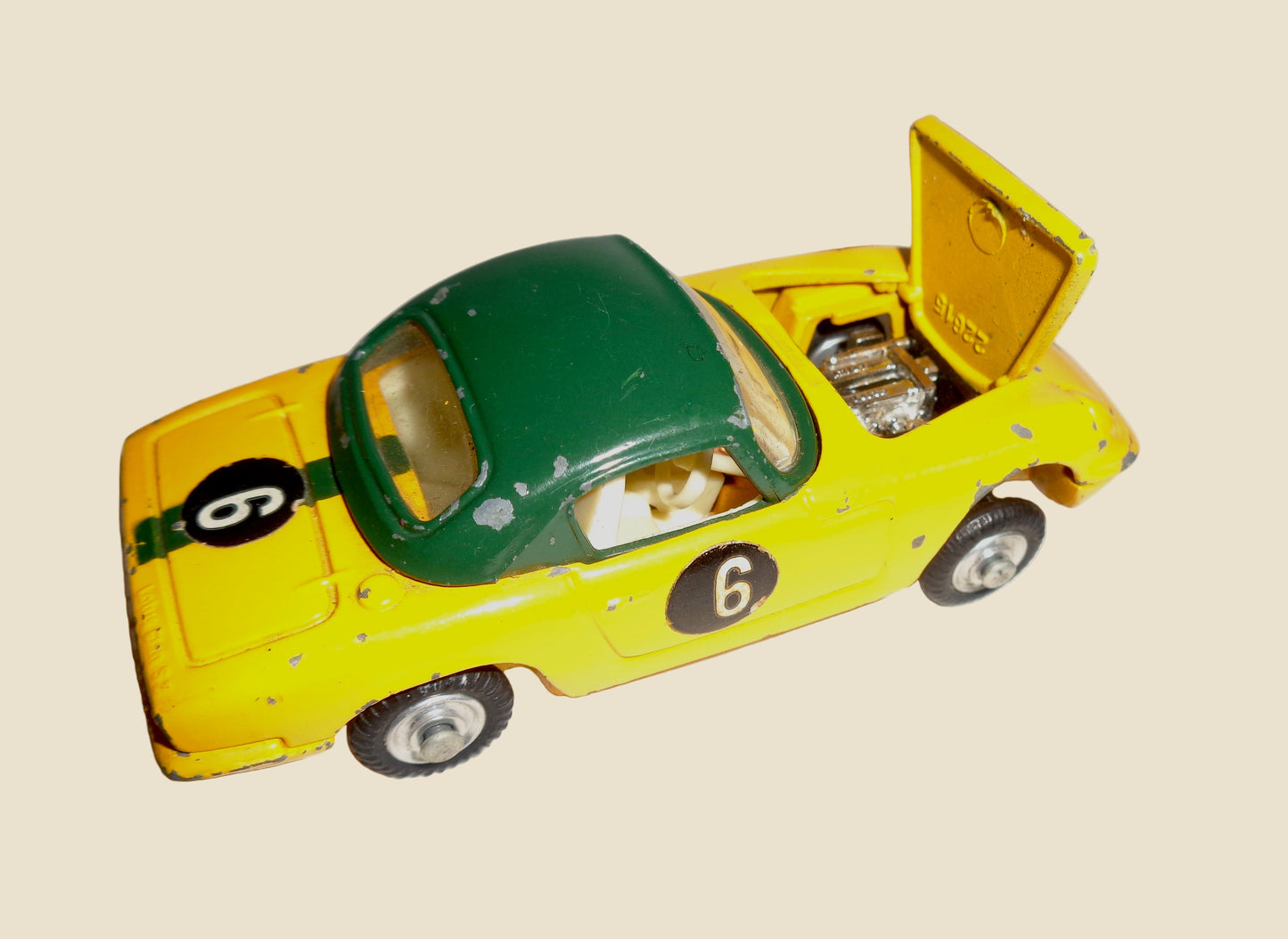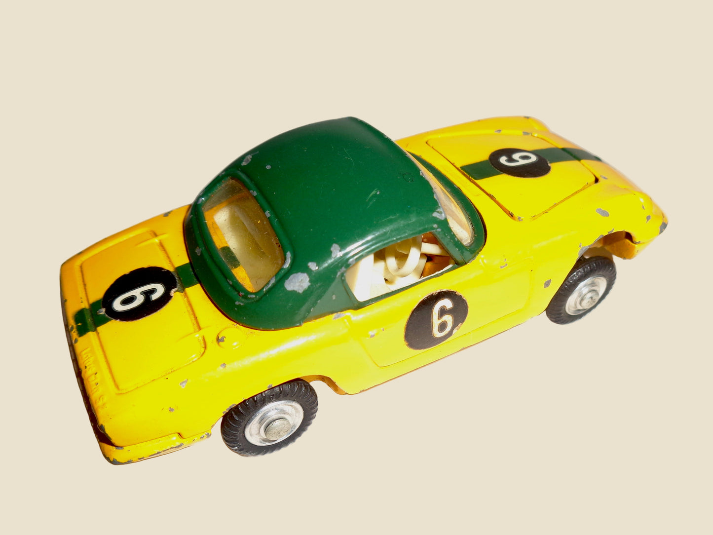 This wonderful vintage car is a Corgi Toys Model 319 Lotus Elan S2 Hardtop Coupe In Green and Yellow, and dates to 1967-69.