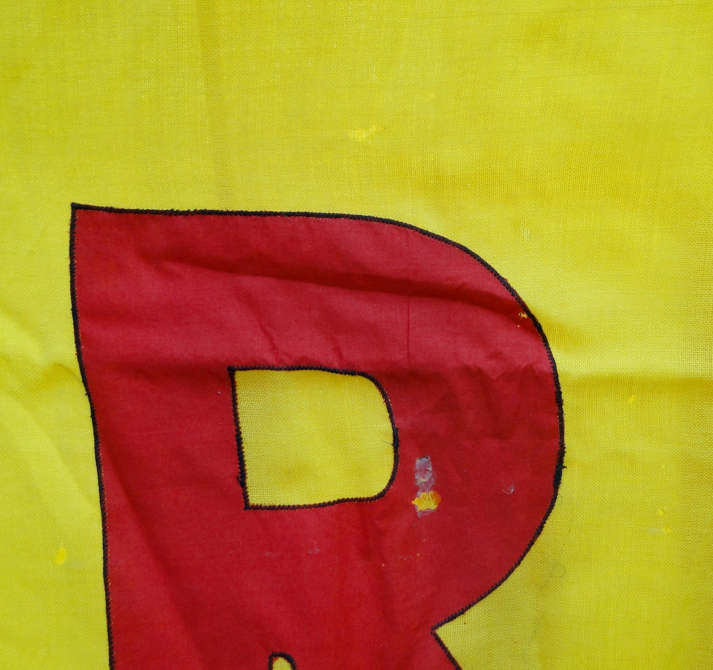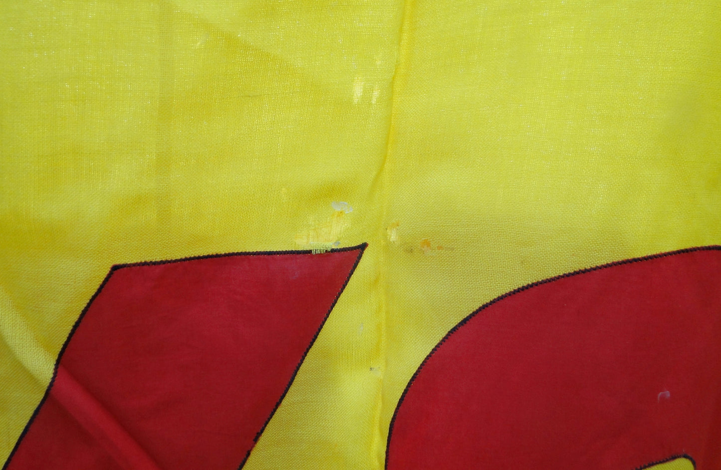 Double sided, it is made of two layers of black and yellow cotton fabrics with contrasting red, yellow and black lettering machine stitched on to the banner. It would have been hung via the fitments, which include a thin rope and toggle running through one end of the banner and brass grommets at the other end.