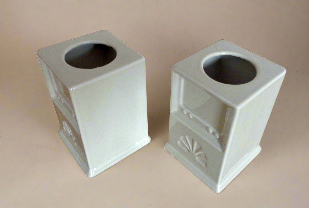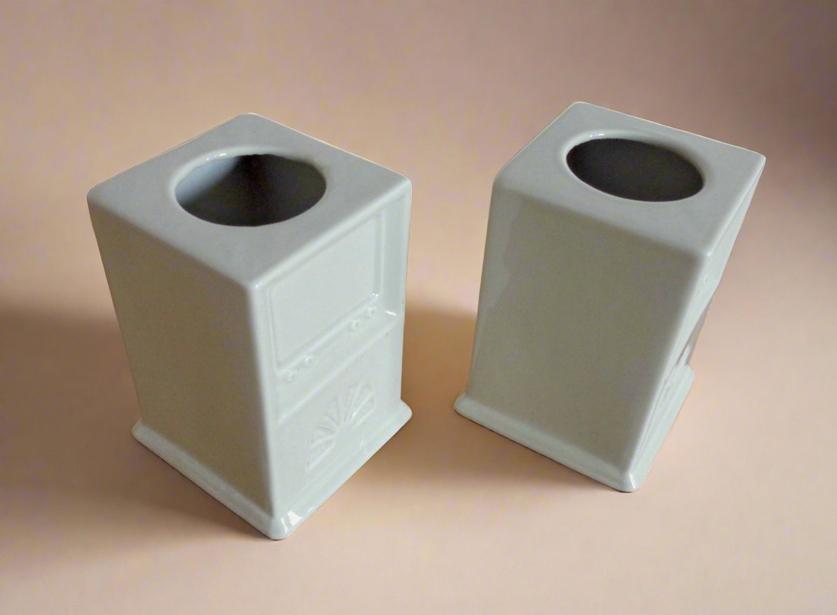 The embossed design is a combined analogue TV with valve Radio. They could be used as candlesticks, desk tidies or even as posy / spill vases. Perfect for the amateur radio or TV enthusiast!