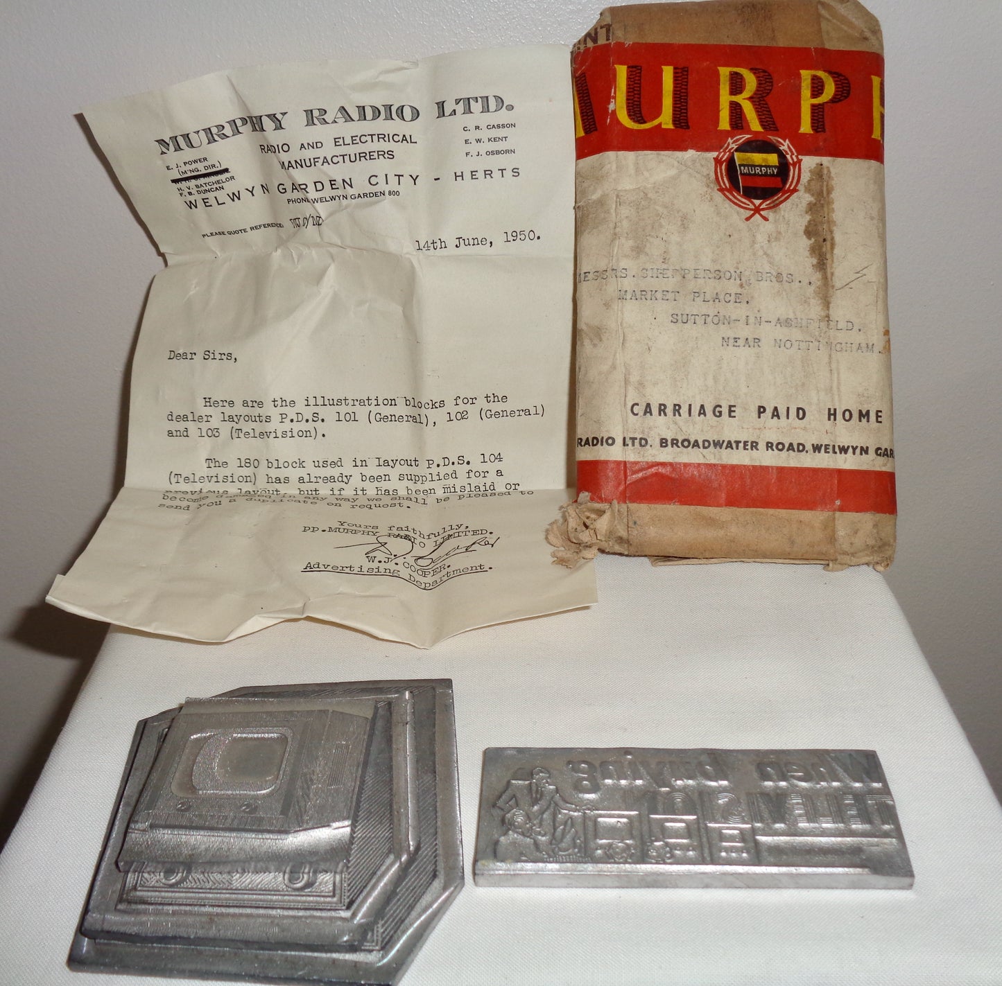 This is a Set of 4 Murphy Radio Metal Letterpress Vintage Television Printing Plates / Blocks. Supplied in the original envelope with accompanying letter from Murphy radio Limited, Radio and Electrical Manufacturers, Broadwater Road, Welwyn Garden City, Herts. UK