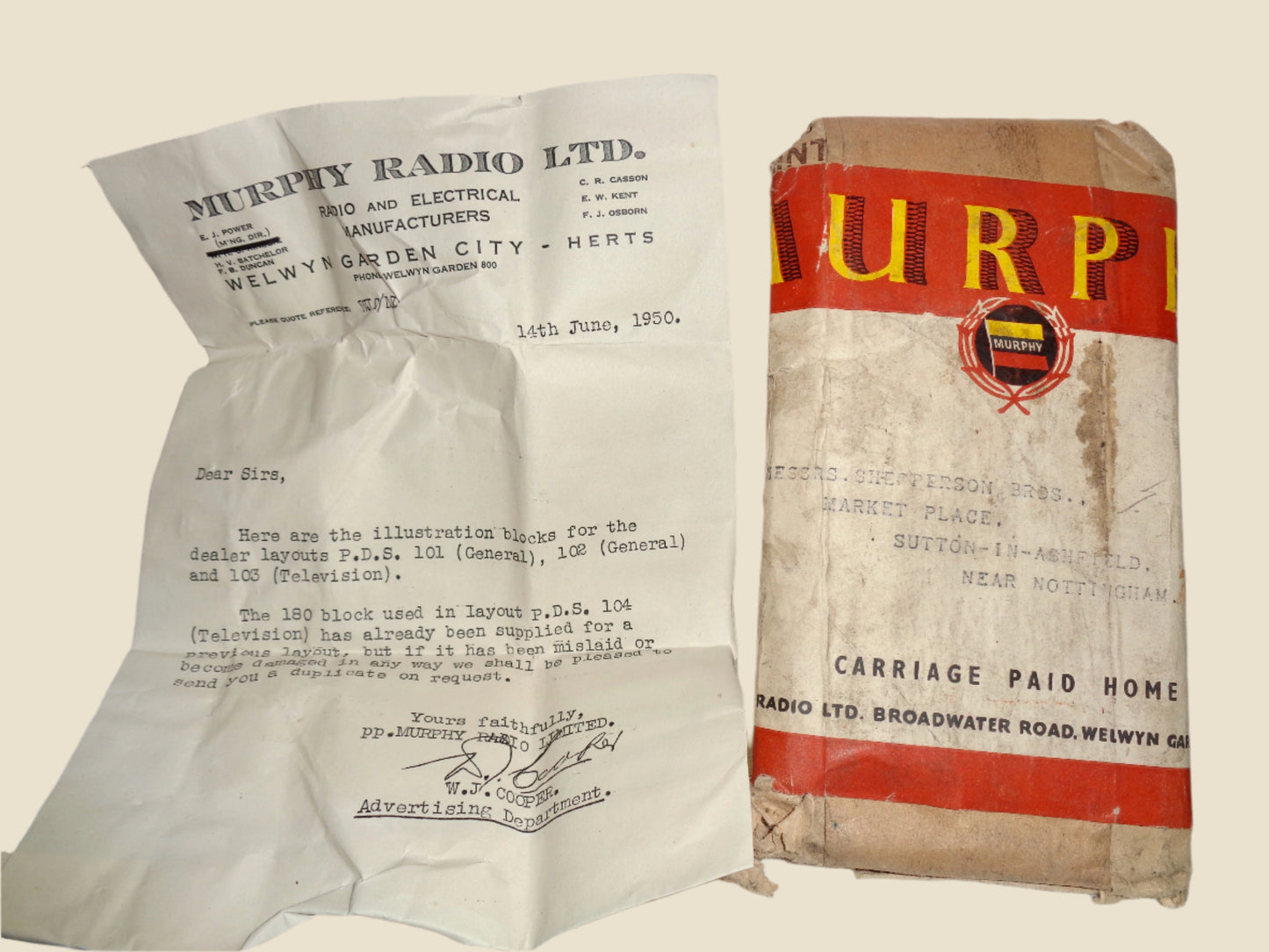 A little slice of history, dating to April 1950, these letterpress printing plates were sent to retailers and dealers by Murphy Radio to create their own marketing material. They refer to them as 'Illustration blocks' and were produced for different layouts on Foolscap/A4 paper. This particular set was produced for Murphy branded Televisions.