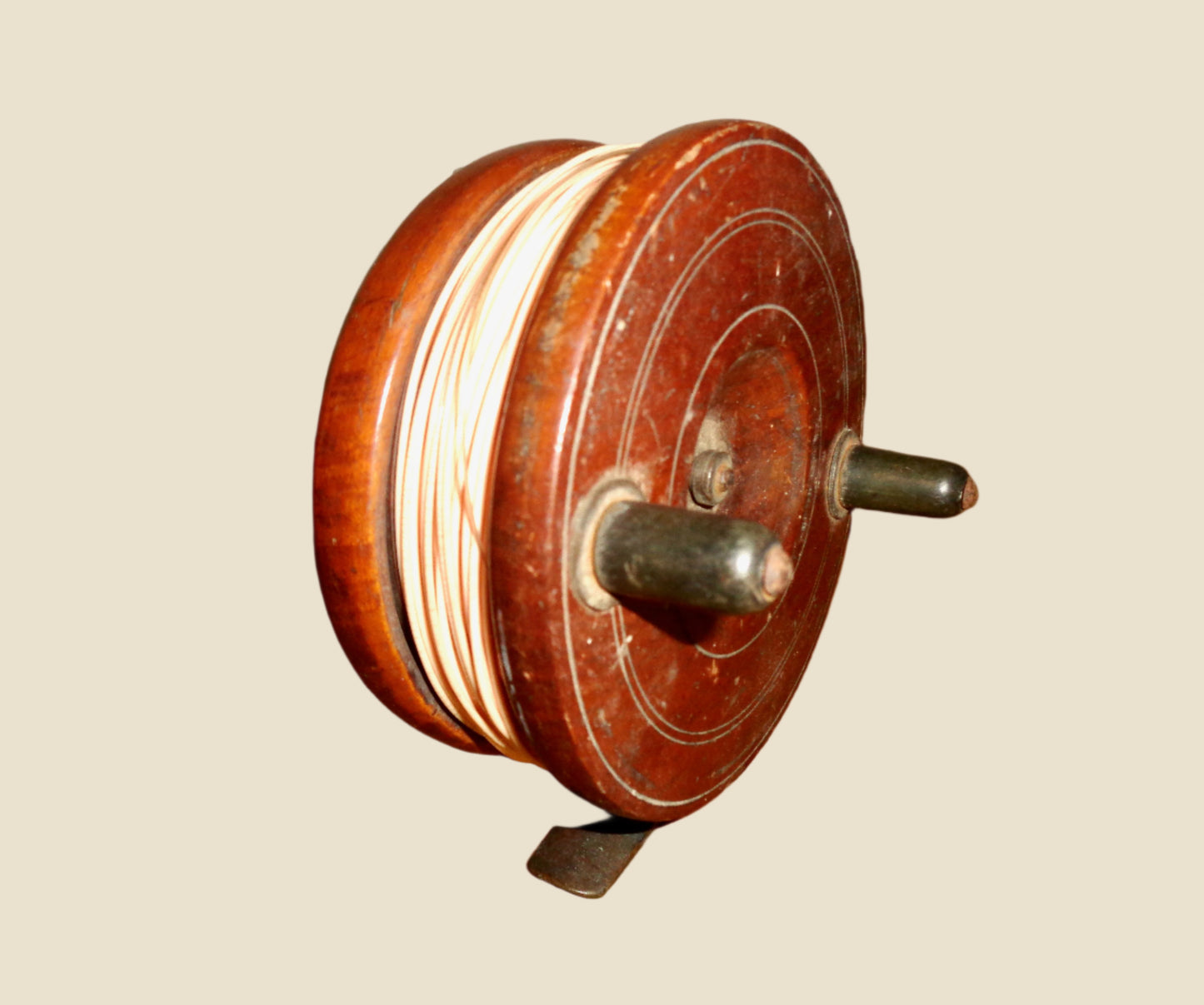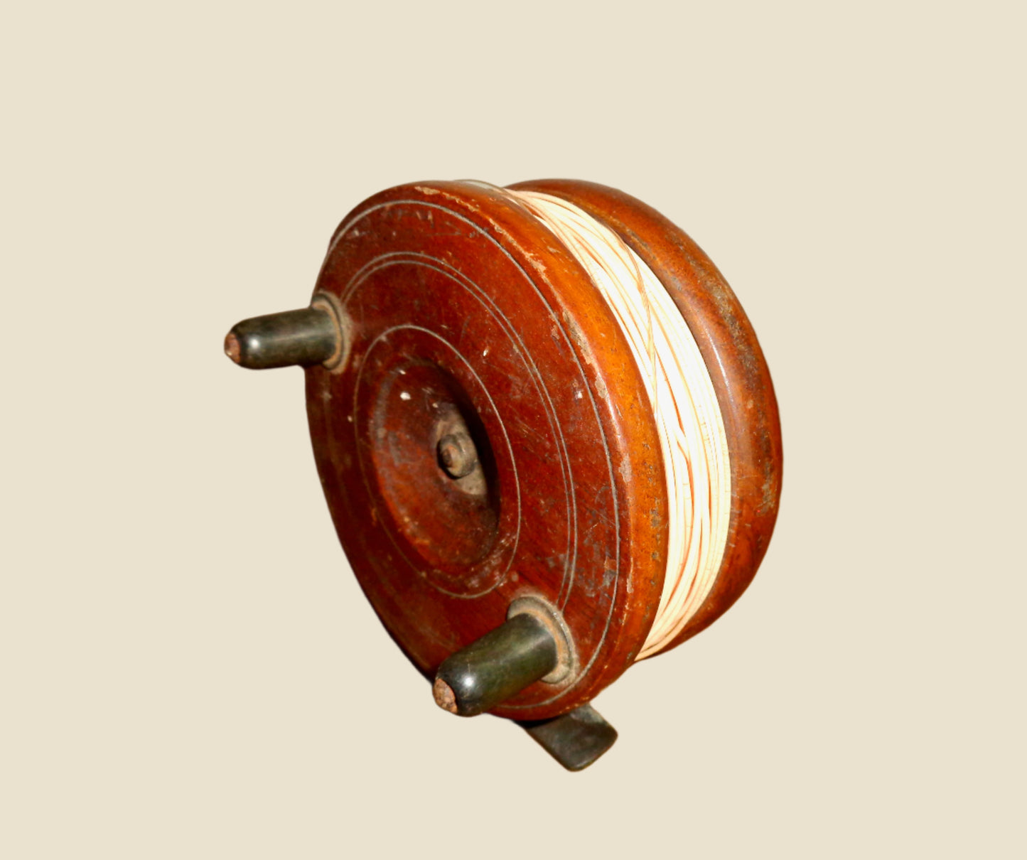 Vintage AW Gamage 4.5" Wood And Brass Centre Pin Fishing Reel With Line