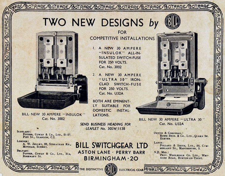 It dates to approximately the 1930s (see advert from 1939 for a CAT 3002, this is a CAT 3000), and has blade type switch contacts. It was made by Bill Switchgear, Birmingham, UK.