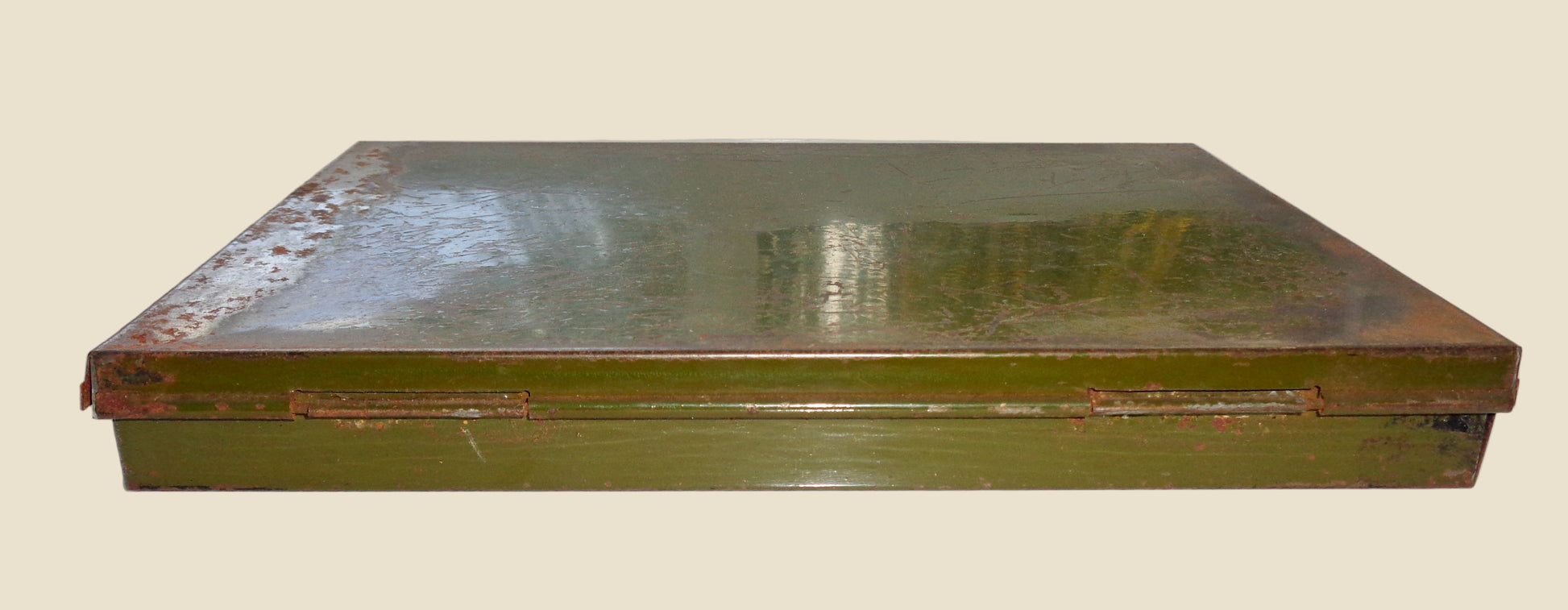 The inside contains six compartments divided by green metal strips, some of which are slightly loose. There is no closure fitment. In fair cosmetic condition with scuffs/scratches, loss of surface coating, and areas of rust.