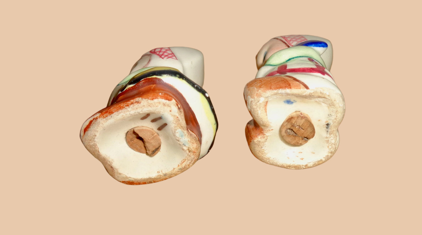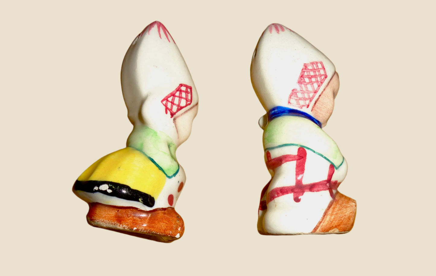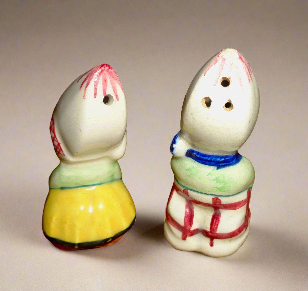 Both figures are in fair vintage condition with some small paint loss to the bottom of their clogs, and the tip of the boy’s hat. The colours are quite vibrant. Both small corks, holding the salt/pepper in place, are present but part of the salt cellar cork is missing. I’ve not checked to see if you can actually remove the corks...