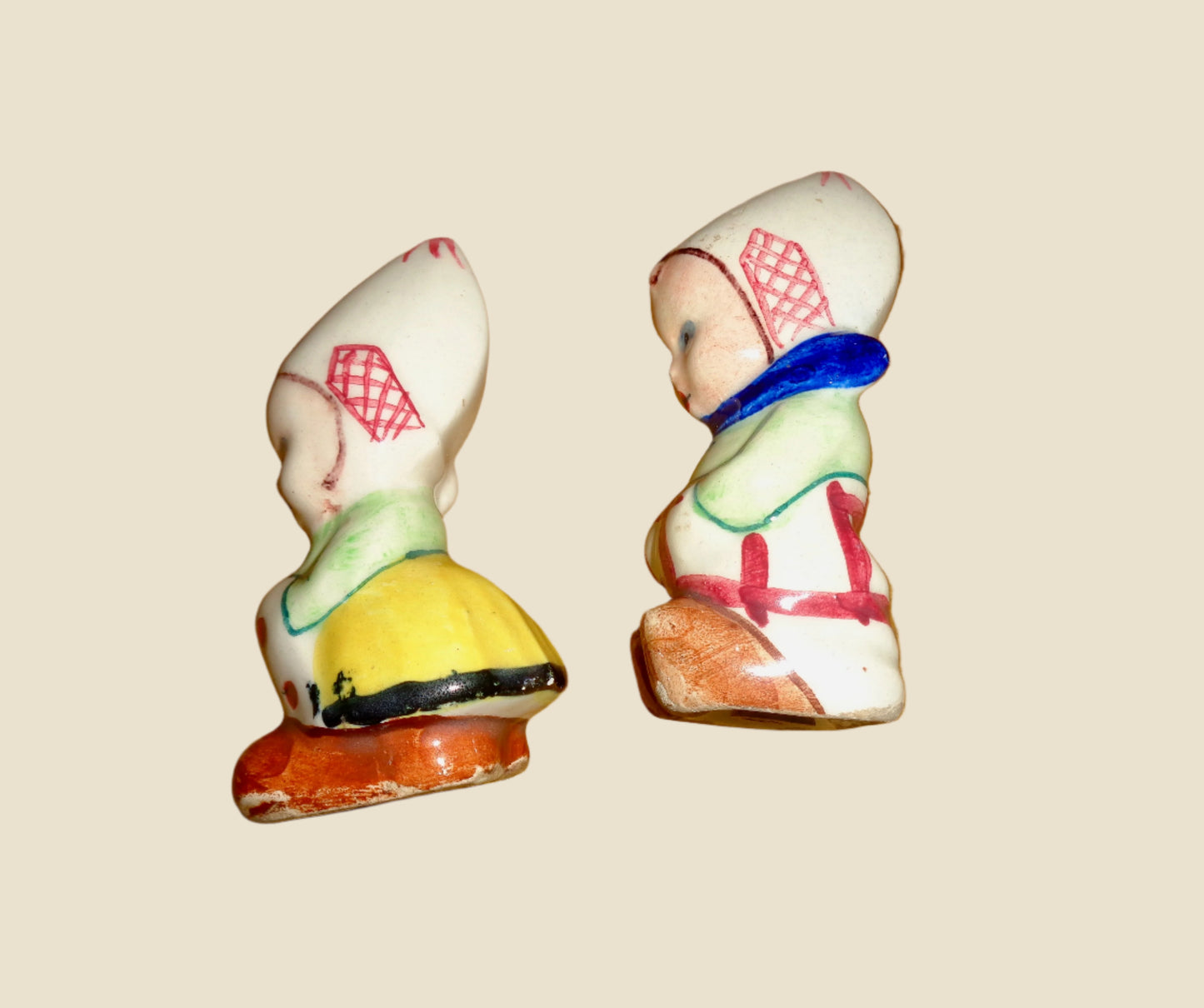 They date from about the 1940s/50s and were probably made in Japan based on Goebel's/ Hummel faïence. There is evidence of a fuzzy blue back stamp on the pepper pot. They are dressed in traditional Dutch costume with beehive hats. The salt cellar is in the shape of the little girl, whilst the Dutch boy is the pepper pot.