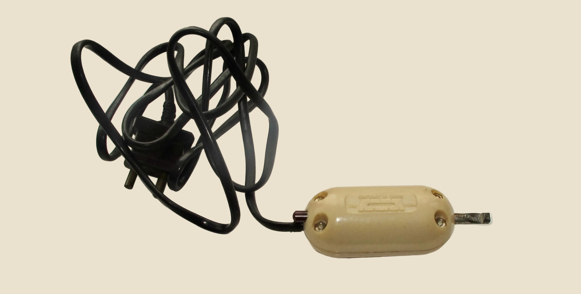 The box is intact but scuffed and discoloured with age. The pale cream / white demagnetiser/bulk eraser is in pretty good condition with a few minor surface blemishes and some discolouration.