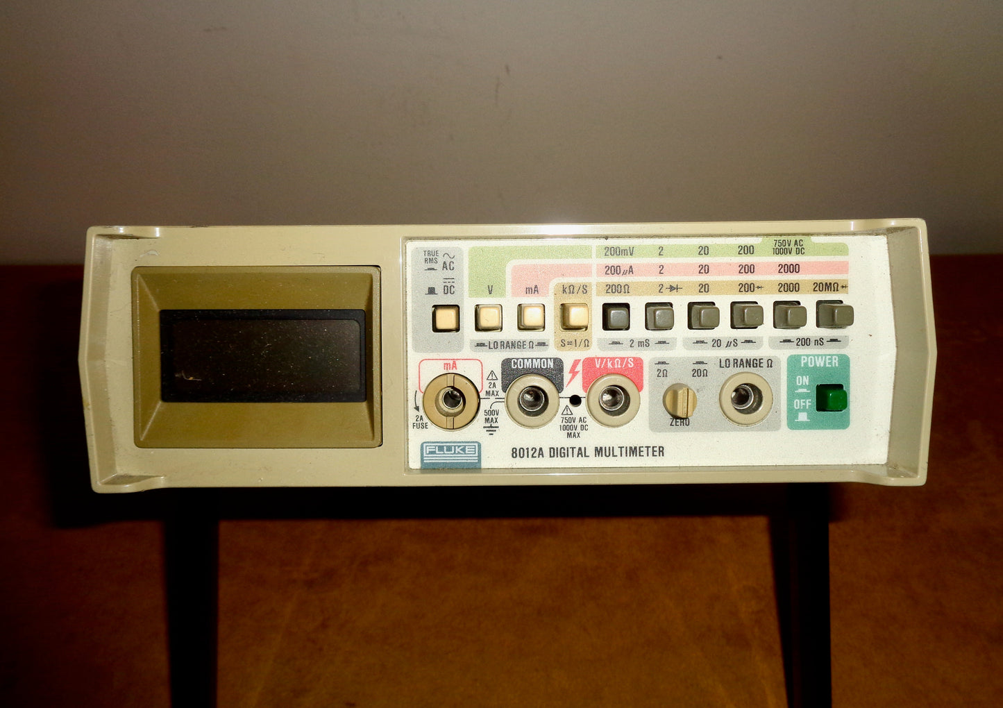 This is a 1980s Vintage Fluke 8012A LCD Digital Multimeter, which operates on AC line power only, and is in working order.