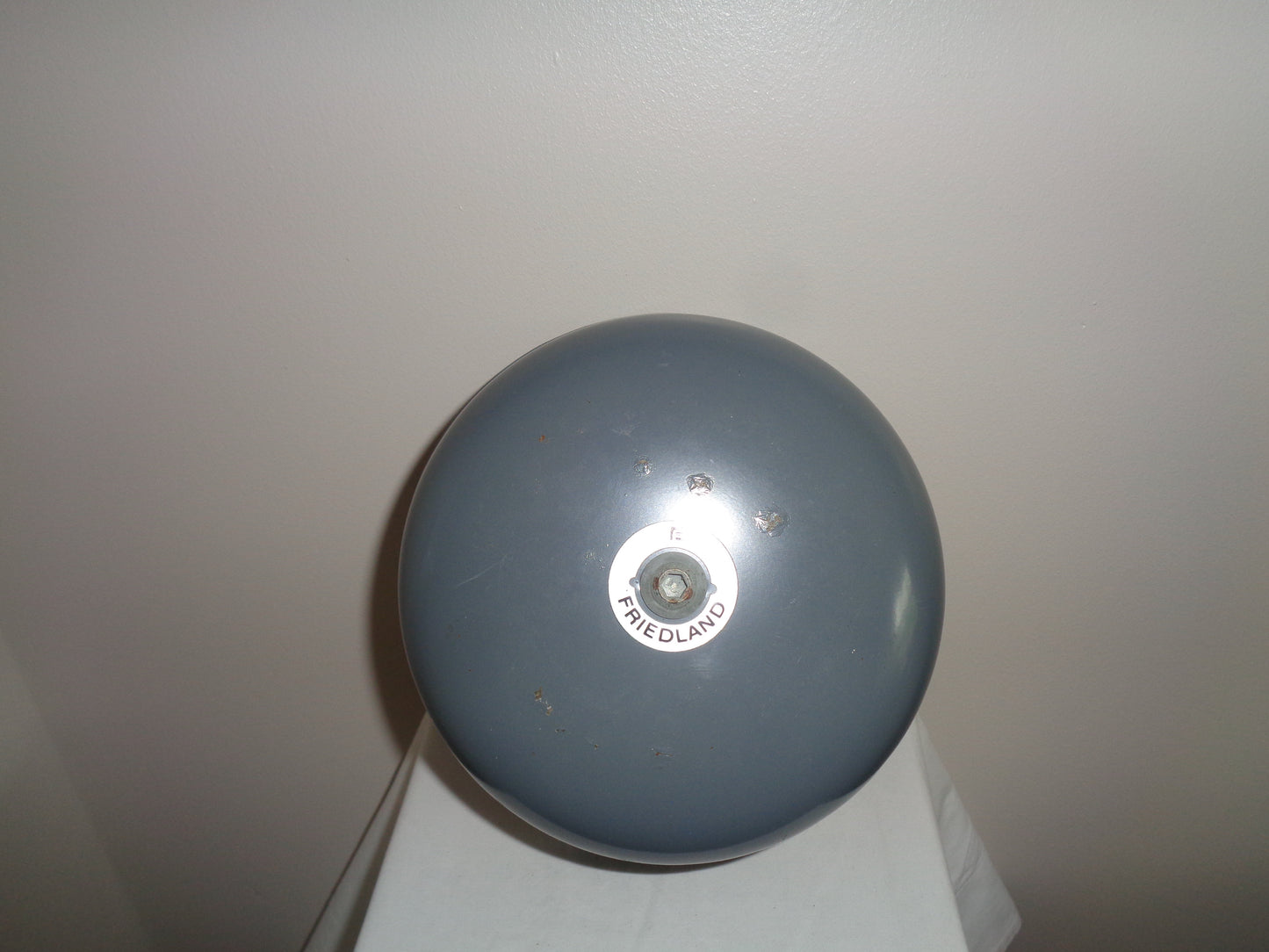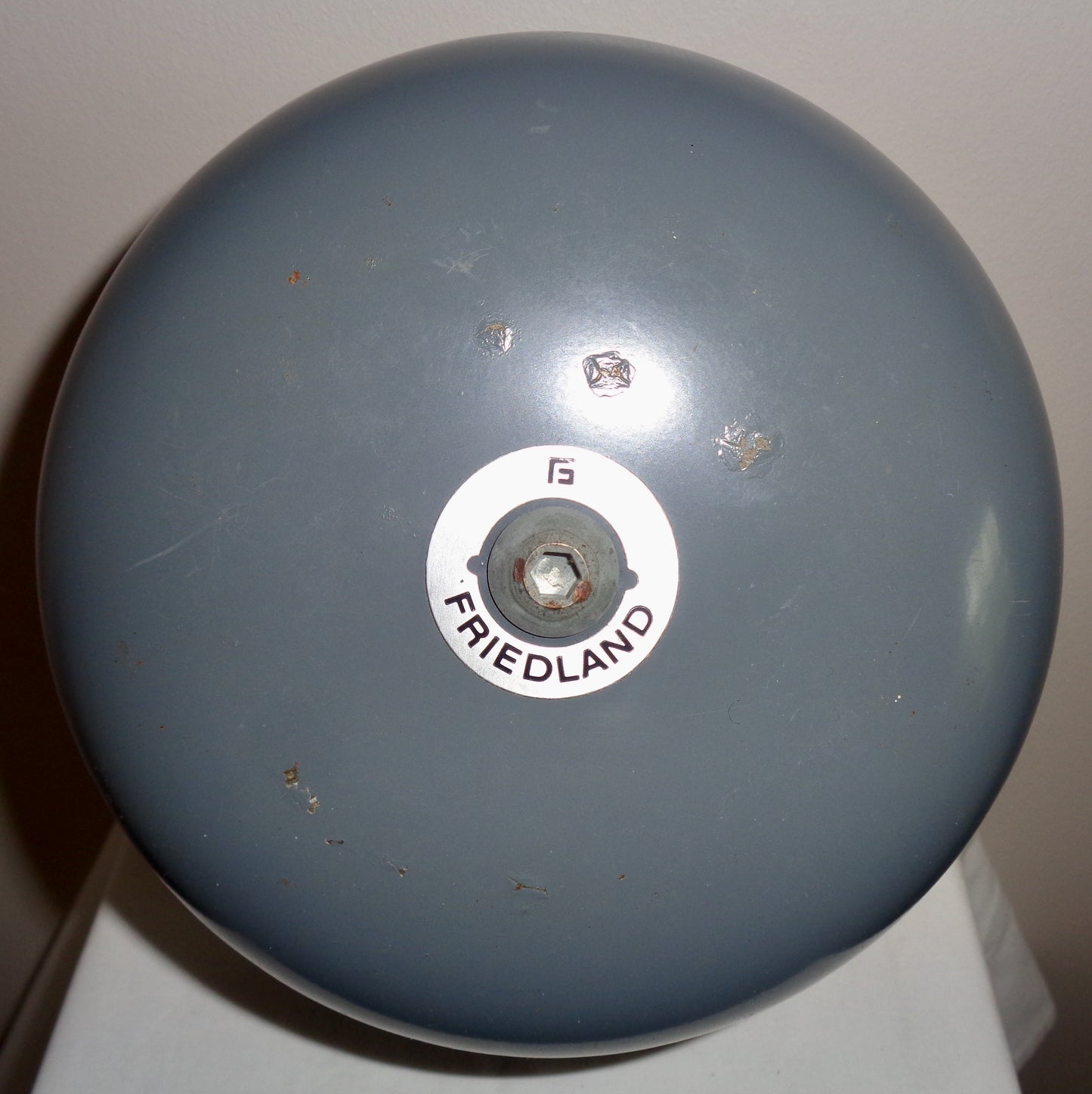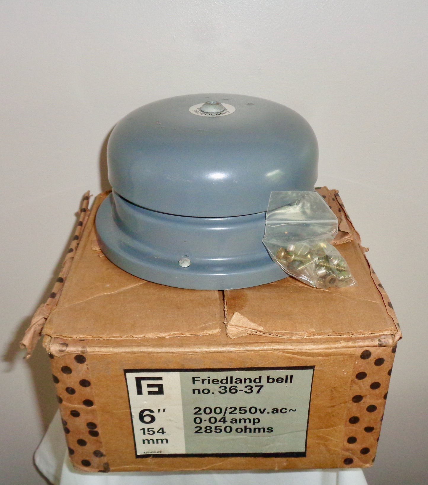 This is a very nice, dark grey, Vintage Friedland Industrial 6 Inch Metal Bell No. 36-37 200/250v 0.04 Amp. New Old Stock, it even comes with its original box and screws.