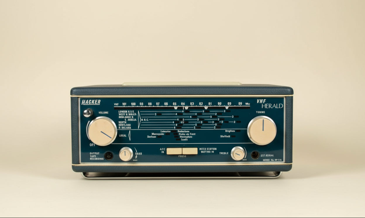 Battery powered, this portable model was only made for a short period about 1970 by Hacker Radio Ltd, Maidenhead, UK. Hackers were a luxury product praised for their build quality and superb sound: every radio collector and home should have at least one!