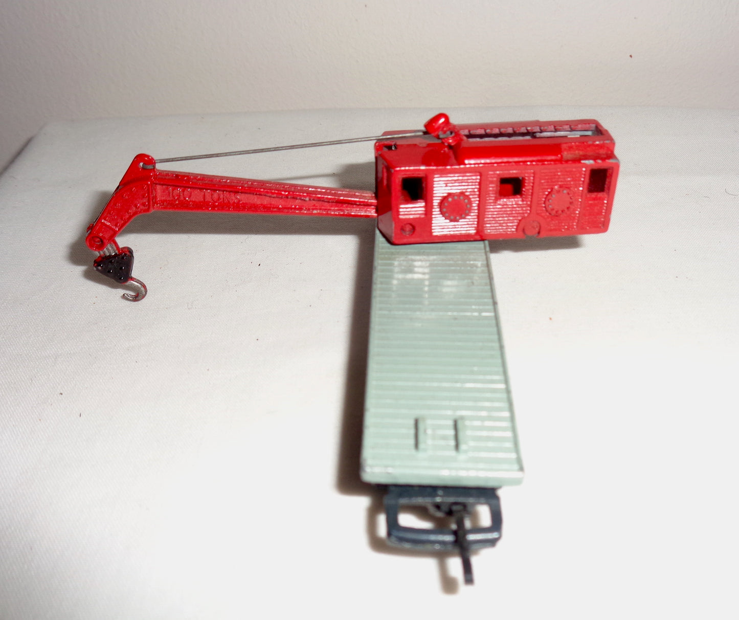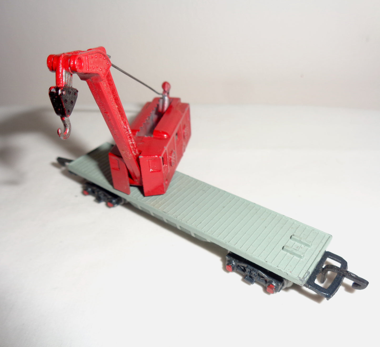The Wagon is unboxed and in very good used condition. All couplings are intact. Each end of the wagon is mounted on a bogey. The red liveried crane is marked 100 tons, and has an articulated hook with swivel cab containing the lever which ratchets the boom into various positions via a fine wire..