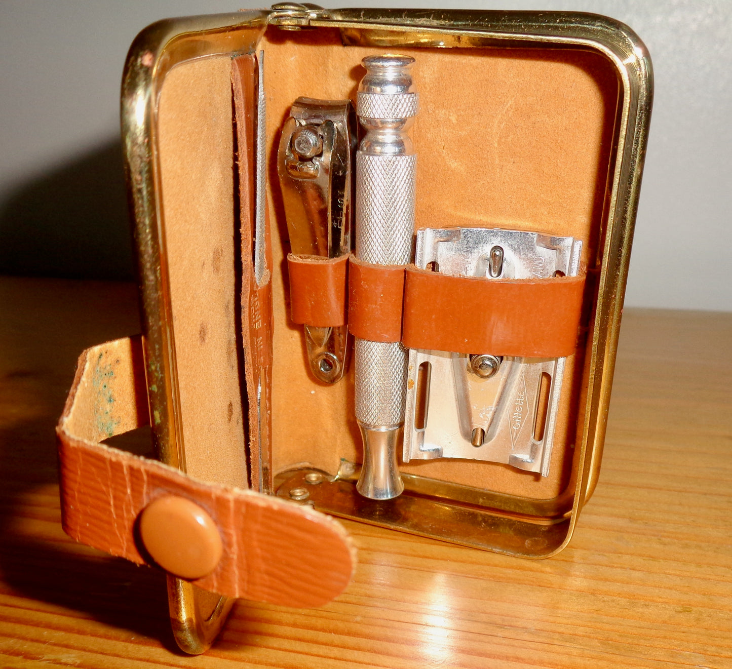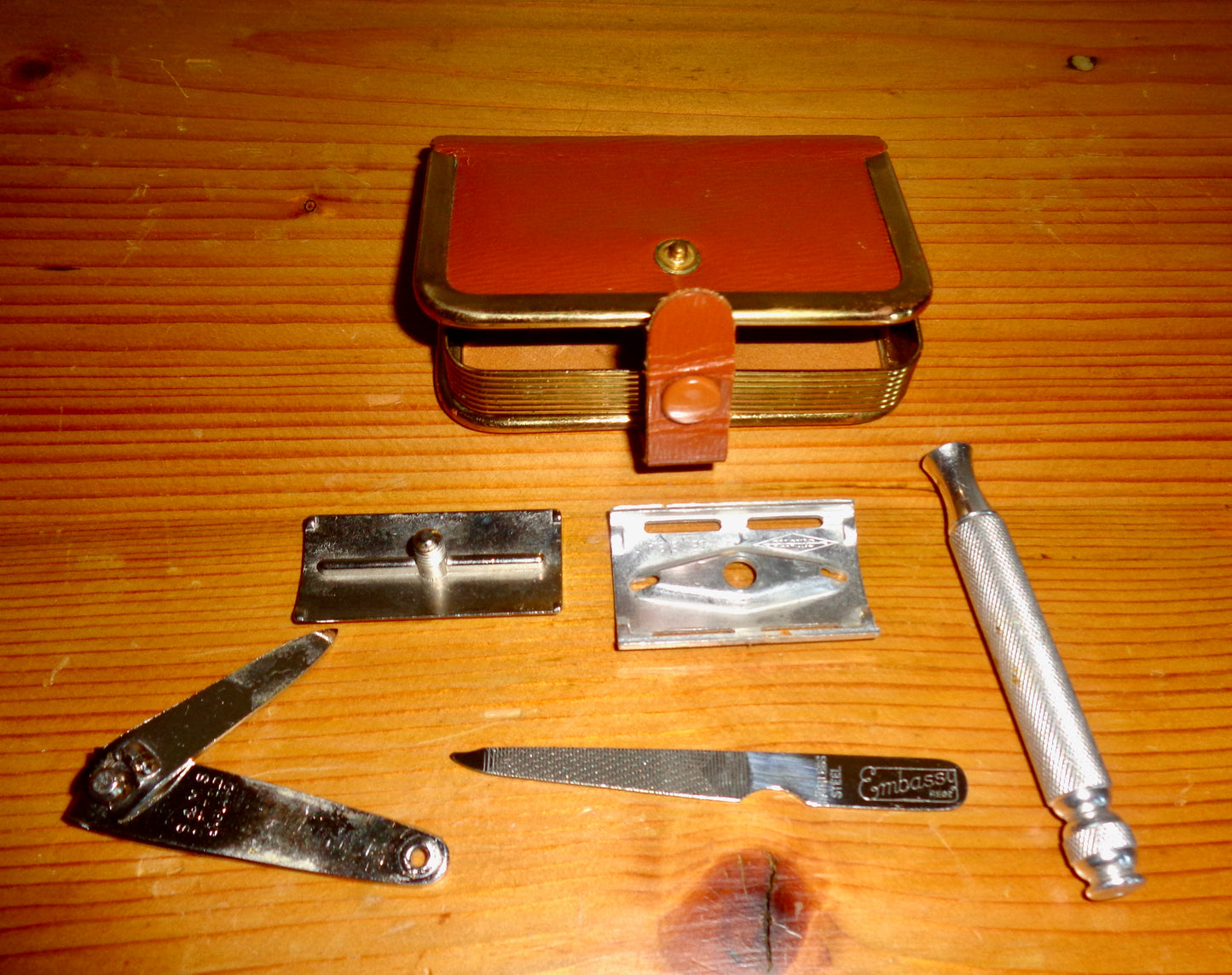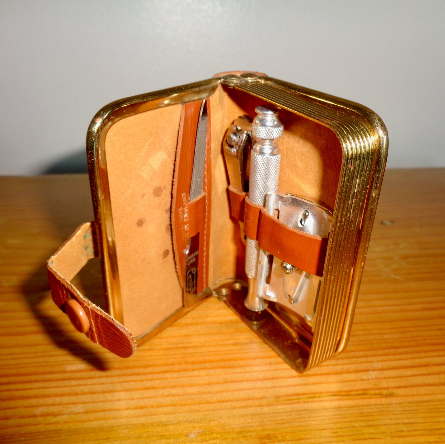 This is a Vintage Mini Travel Grooming Kit Including A Stainless Steel Gillette Wet Razor, S & MS nail clipper and Embassy nail file. The razor ensemble unscrews for storage in the small pocket size case made from brass and leather. It dates to the 1960s.